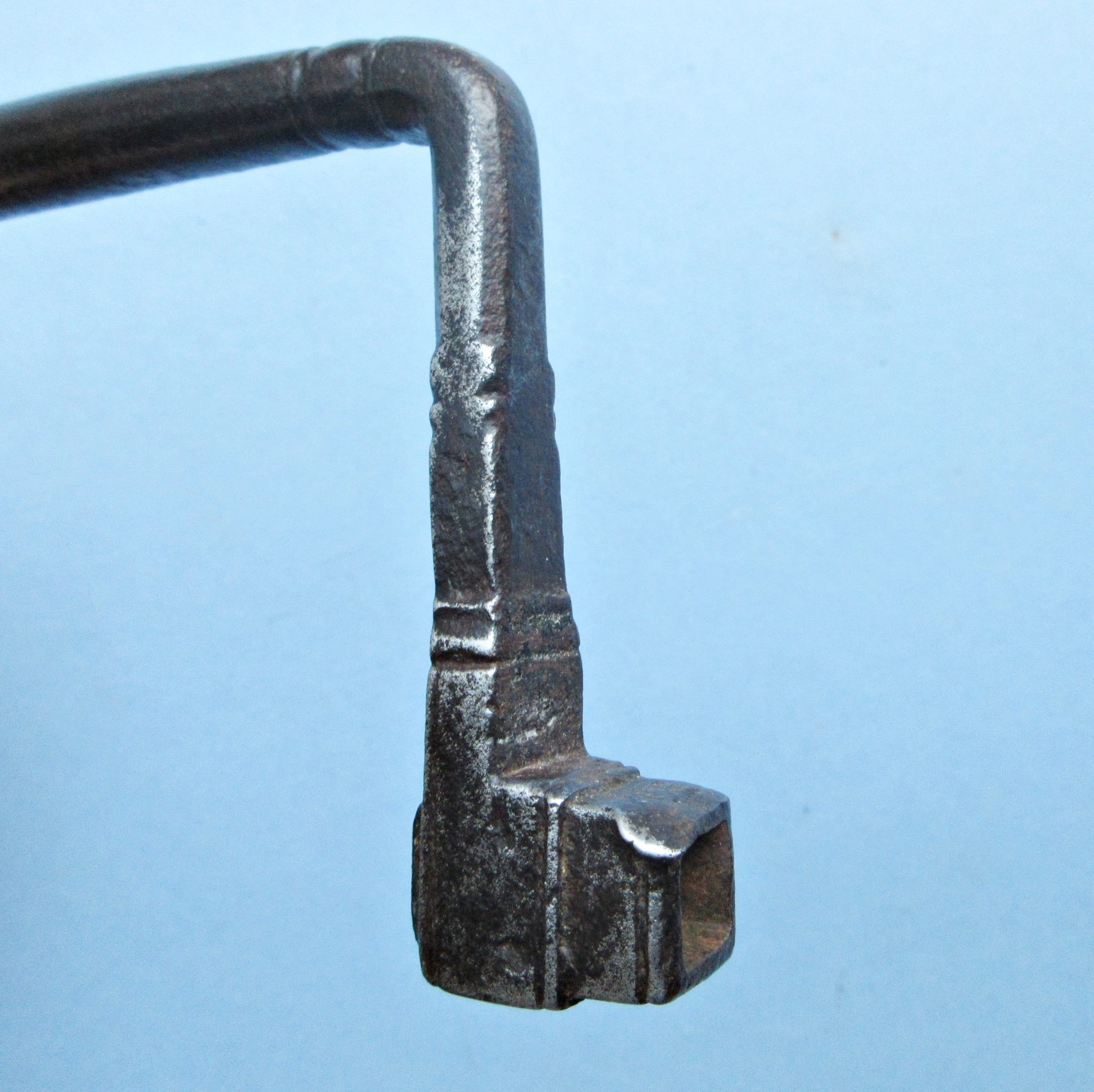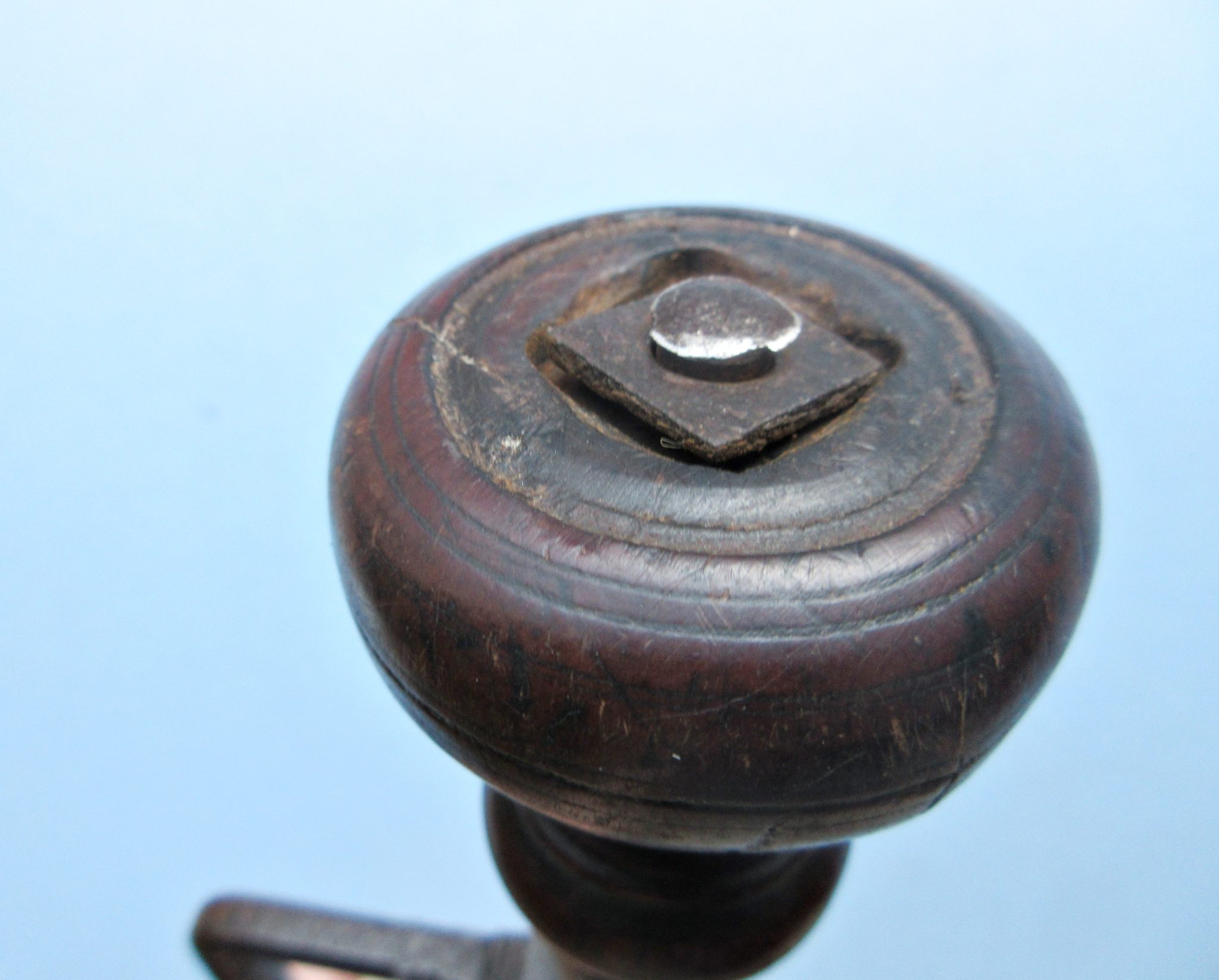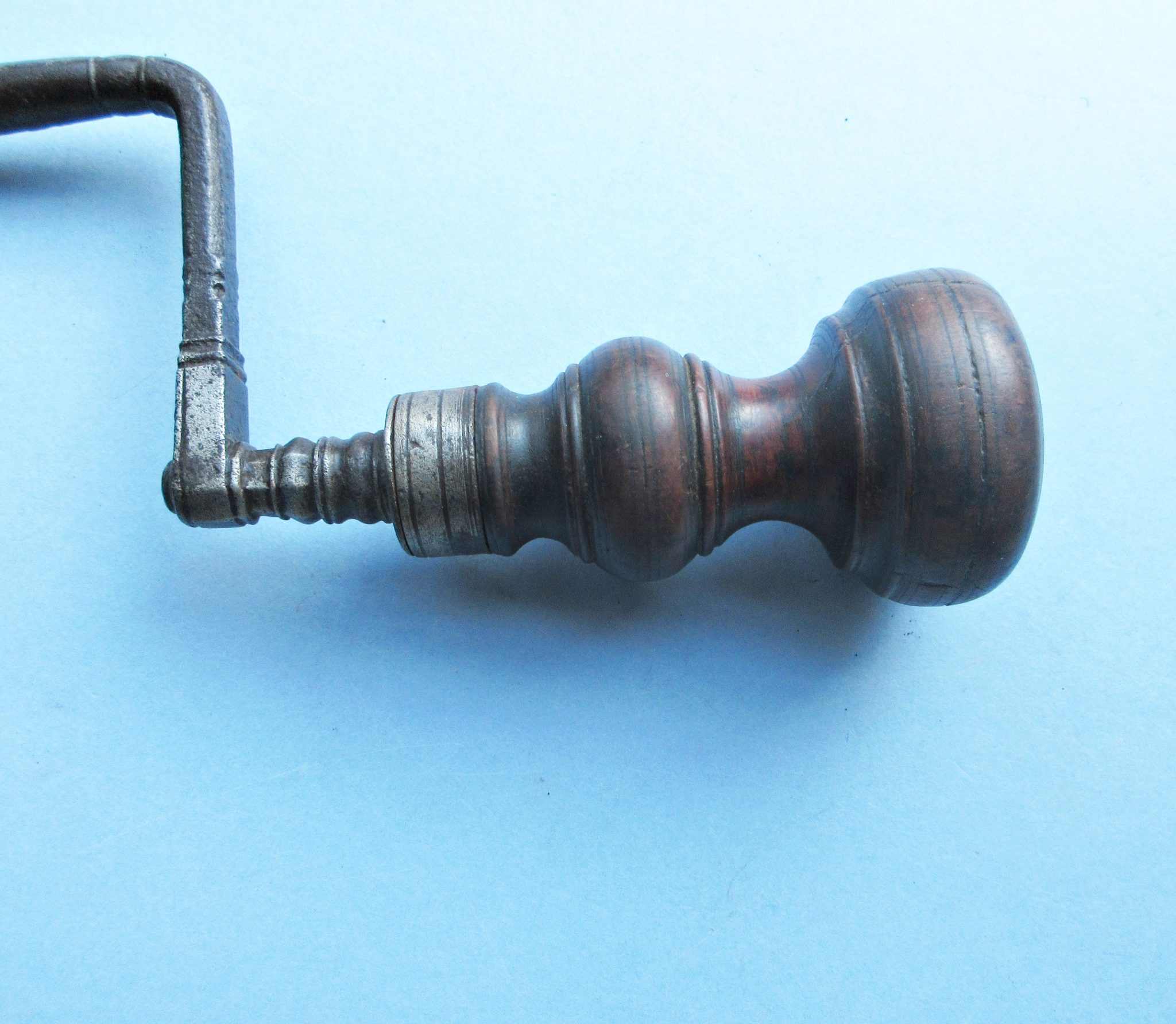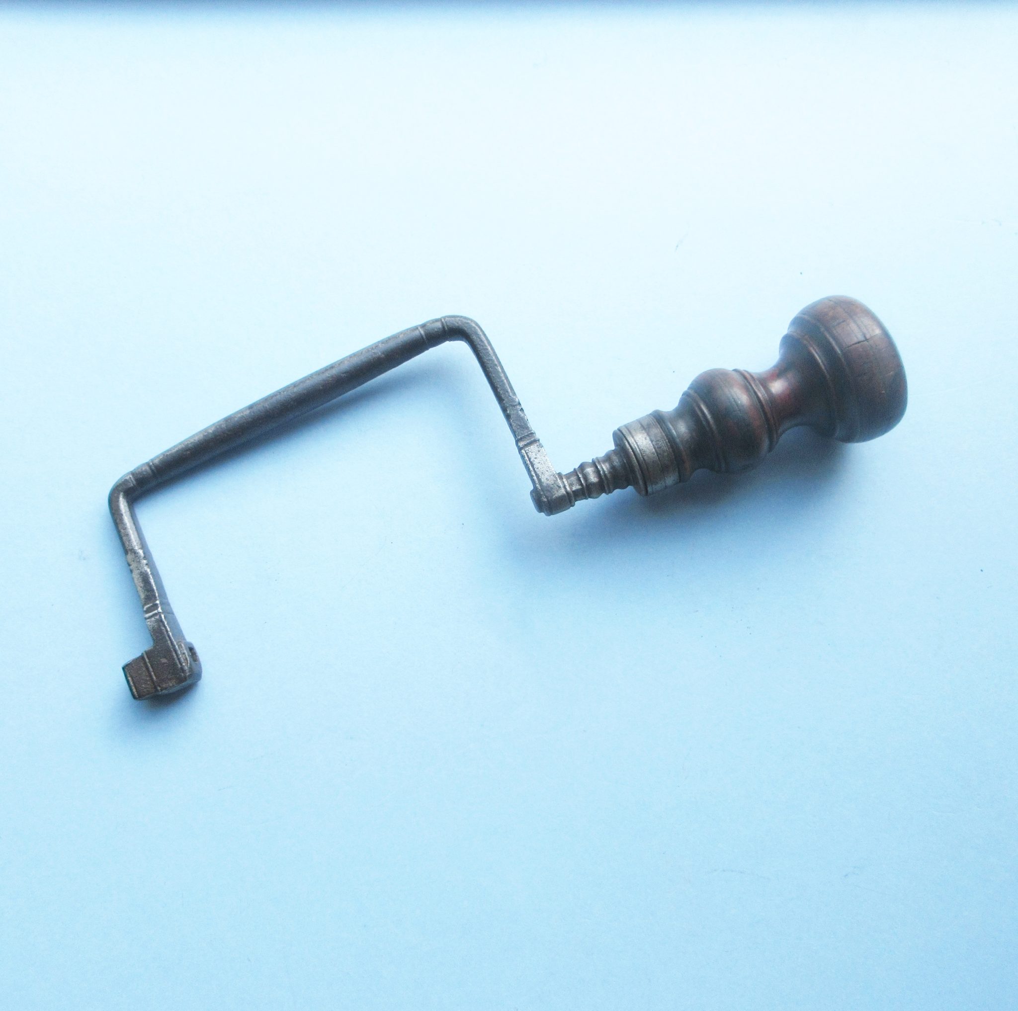 A very early iron trepanning brace with turned-wood handle. We’ve had a number of trepanning braces over the years but this is far and away the earliest we’ve owned.