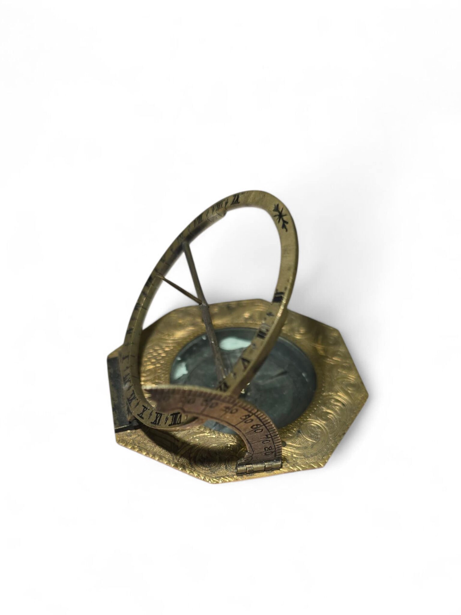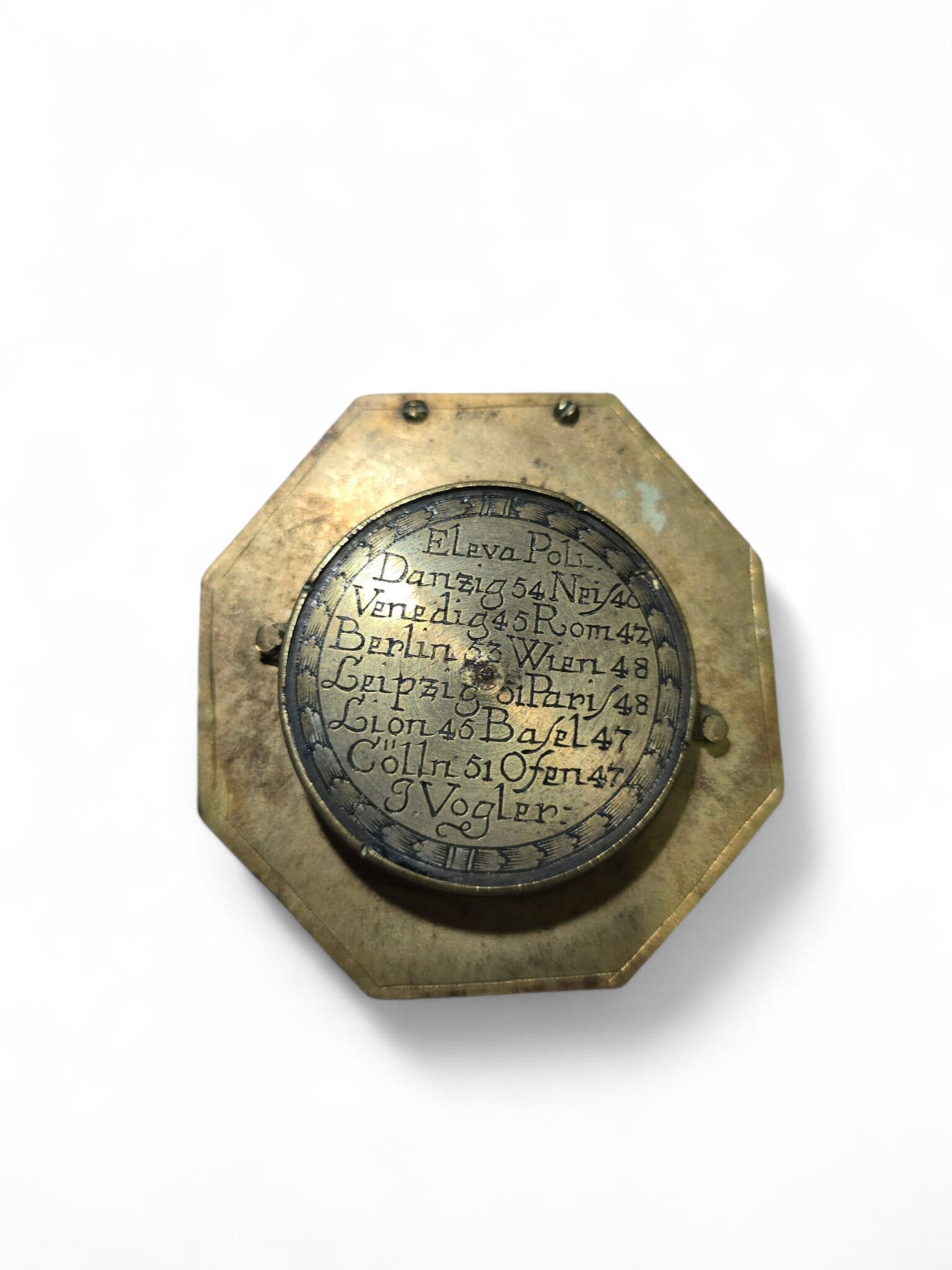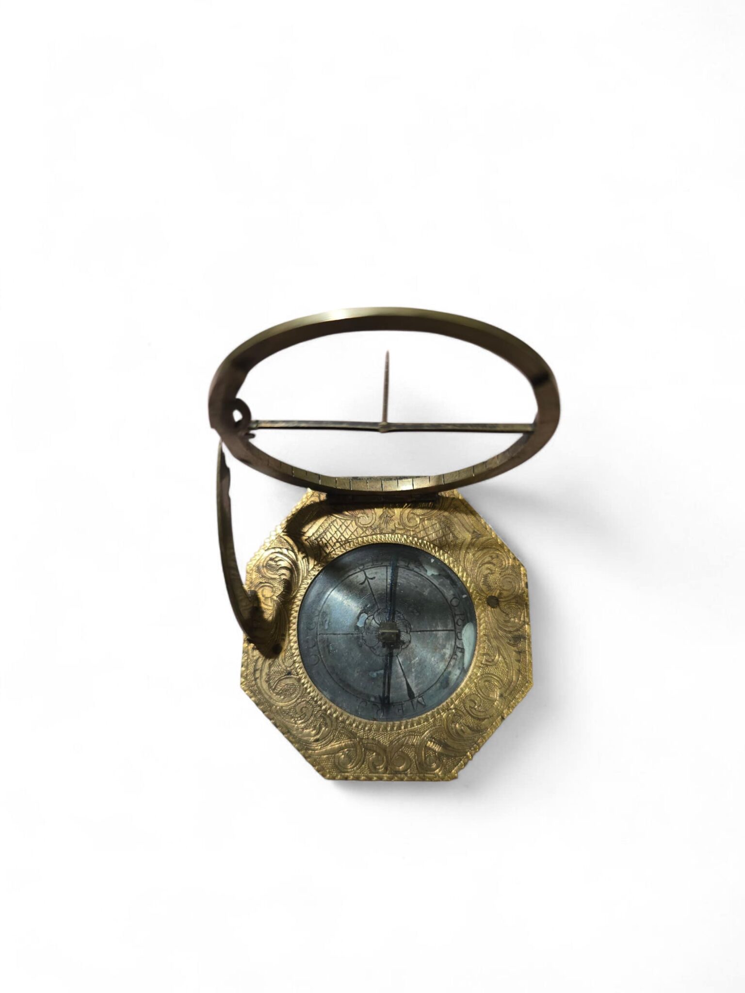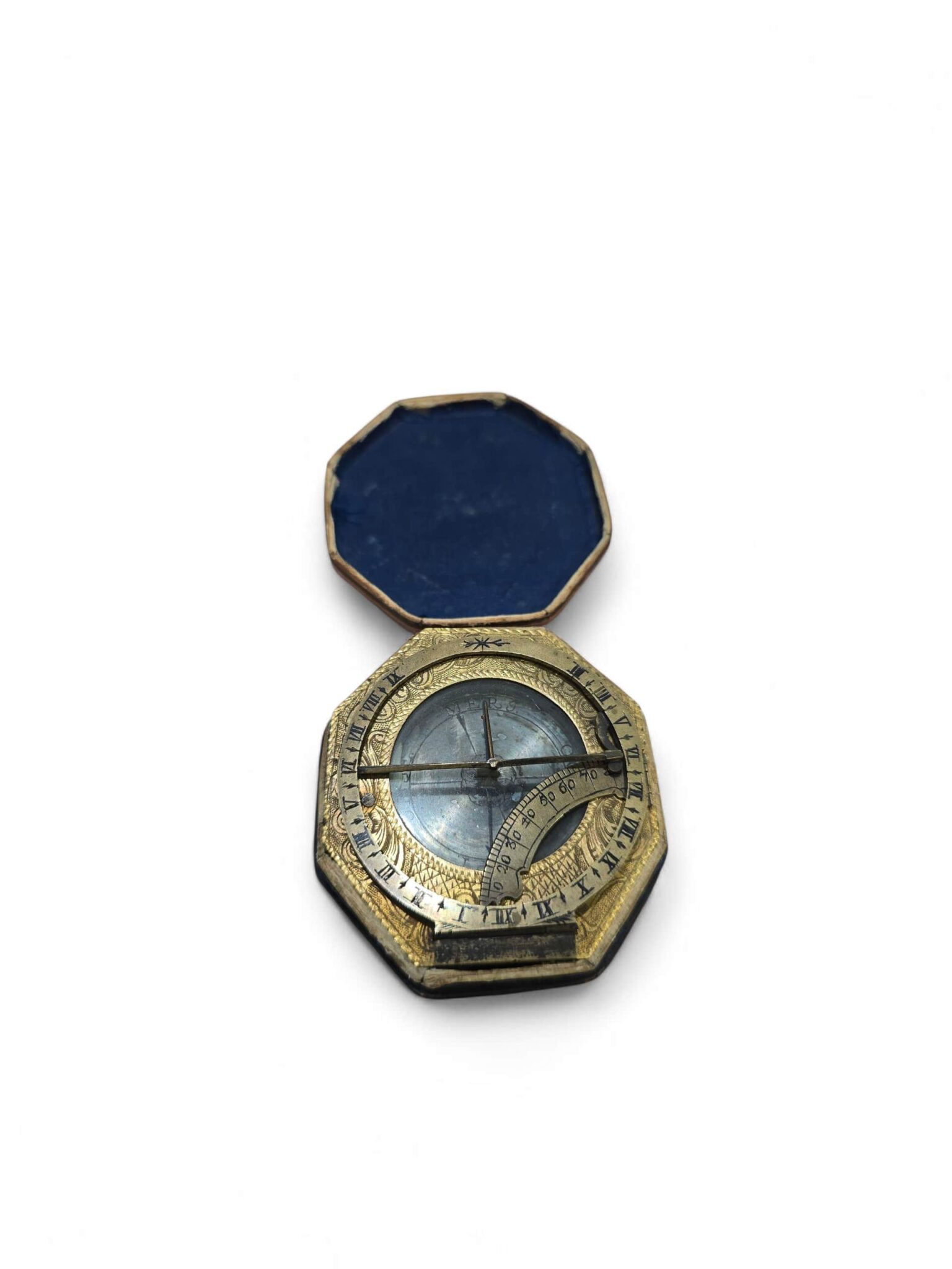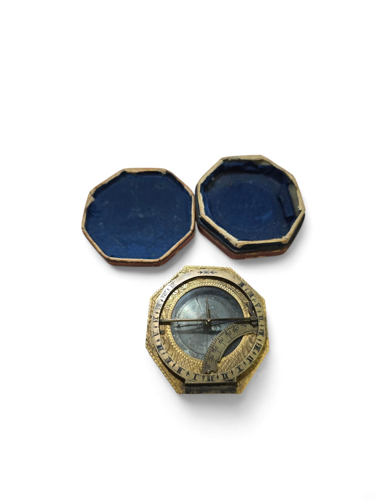 Exceptional German portable sundial, finely engraved and gilt brass, signed “J. Vogler”, and preserved in its original fitted case.