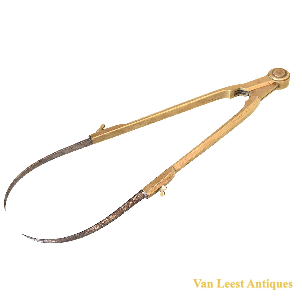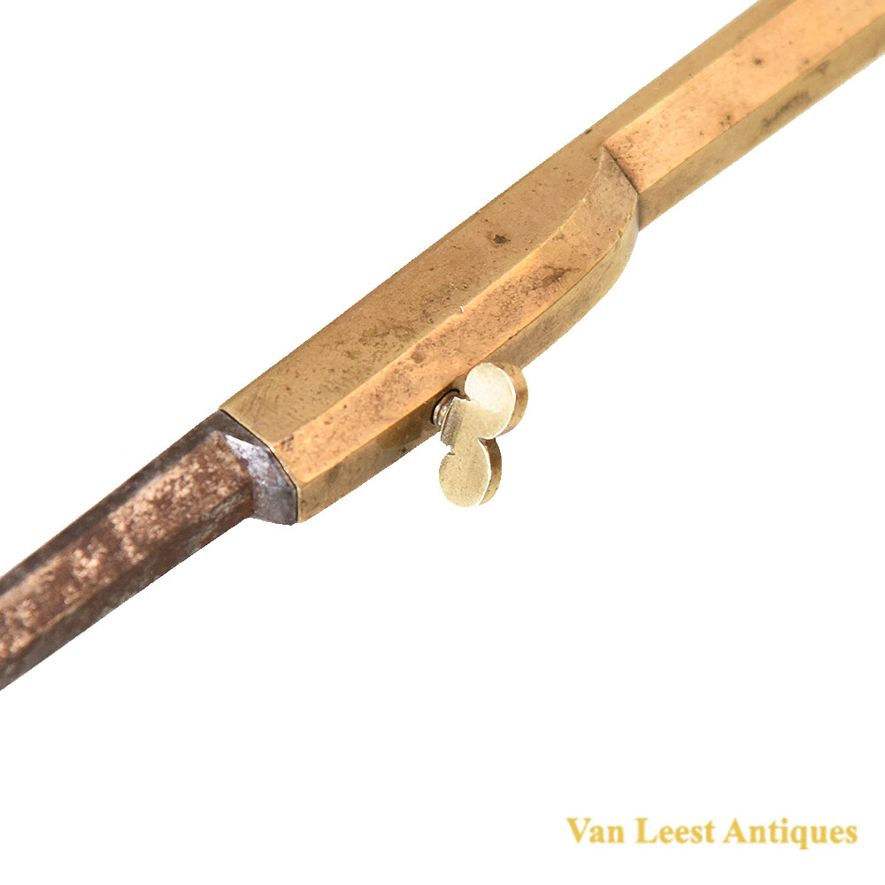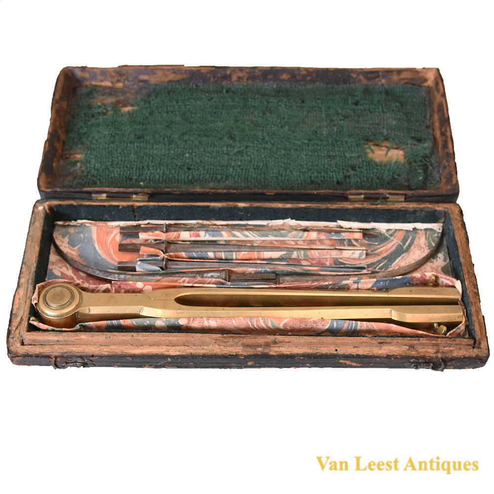 An Franch set of cased dividers, C 1710. Made of brass and steel with five attachable points of which three straight and two curved. Each required accessory could be inserted into the brass legs and held by a screw. The case is made of wood and leather, on the inner side it is covered with green fabric and coloured paper, it is locked by a hook which is decorated as a flower.