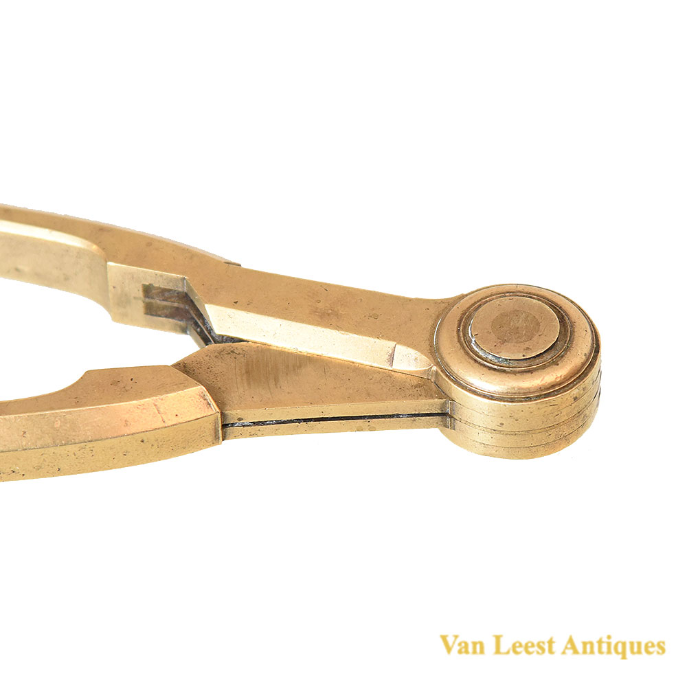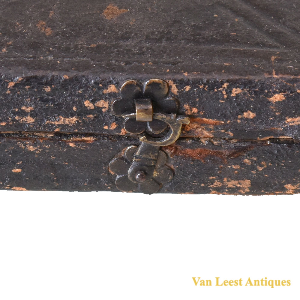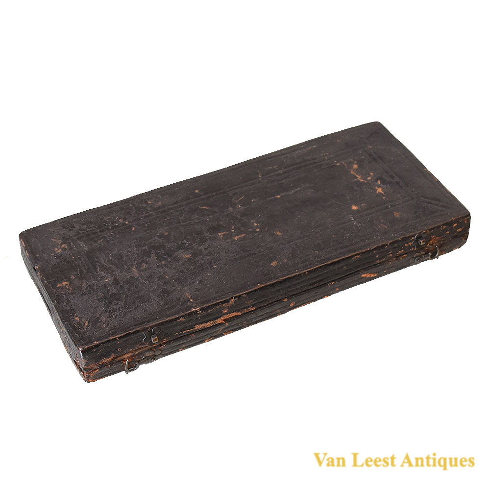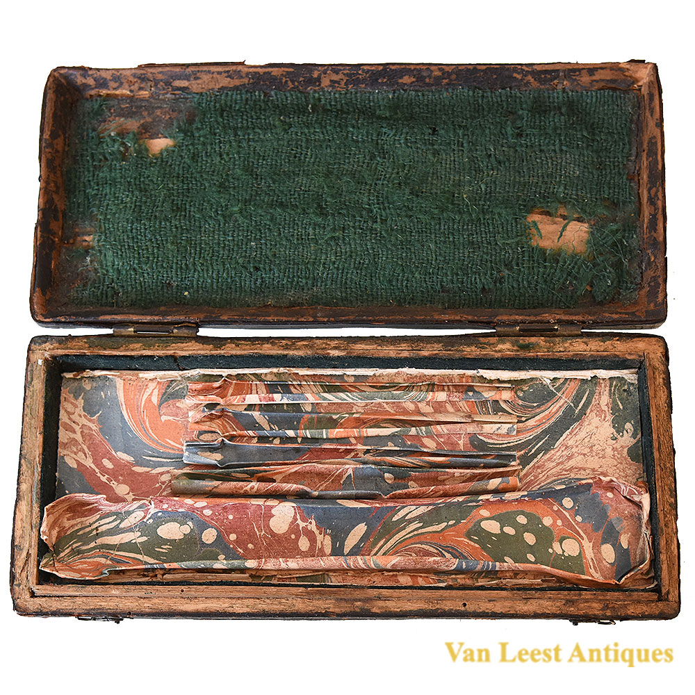 An Franch set of cased dividers, C 1710. Made of brass and steel with five attachable points of which three straight and two curved. Each required accessory could be inserted into the brass legs and held by a screw. The case is made of wood and leather, on the inner side it is covered with green fabric and coloured paper, it is locked by a hook which is decorated as a flower.