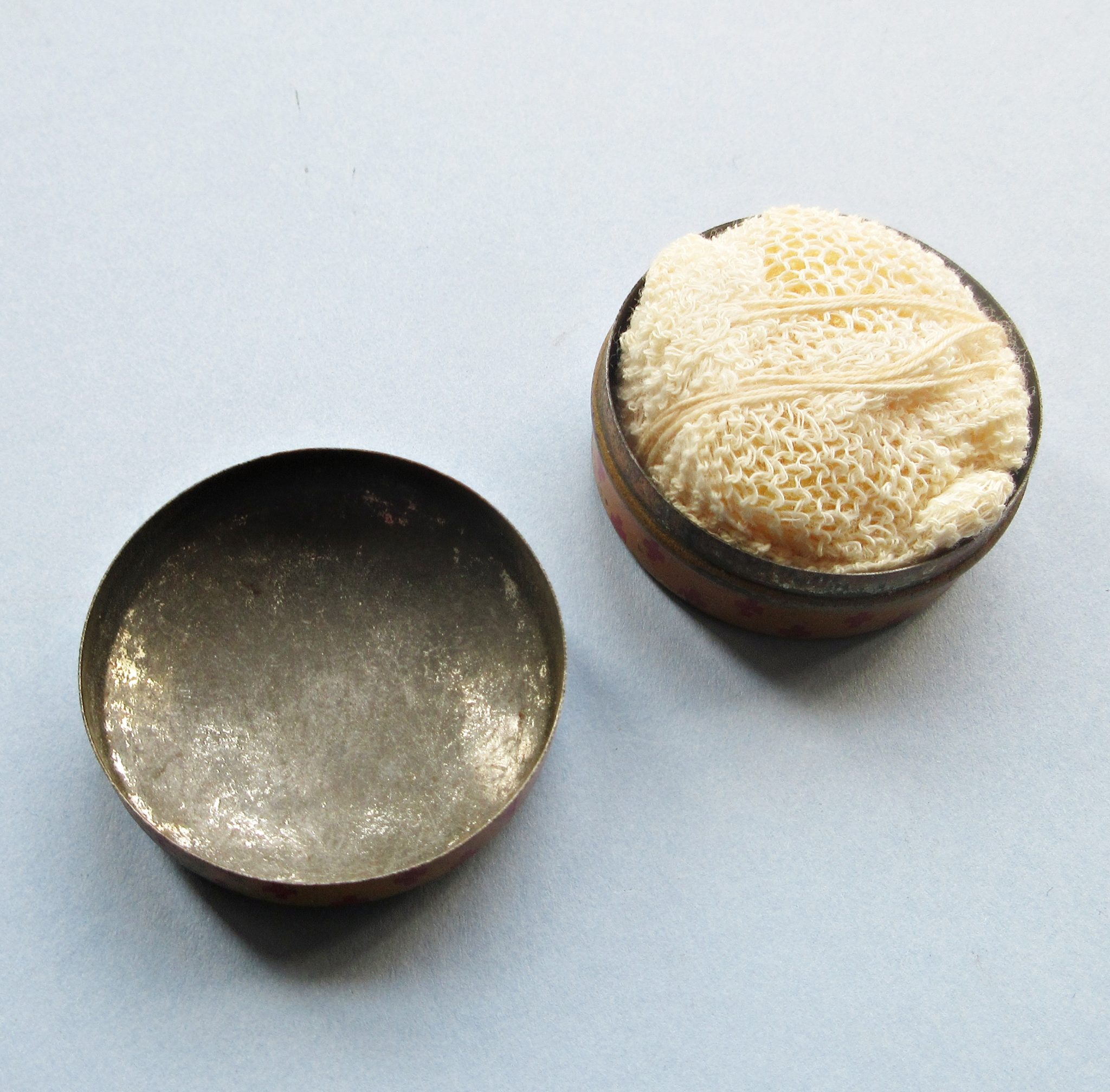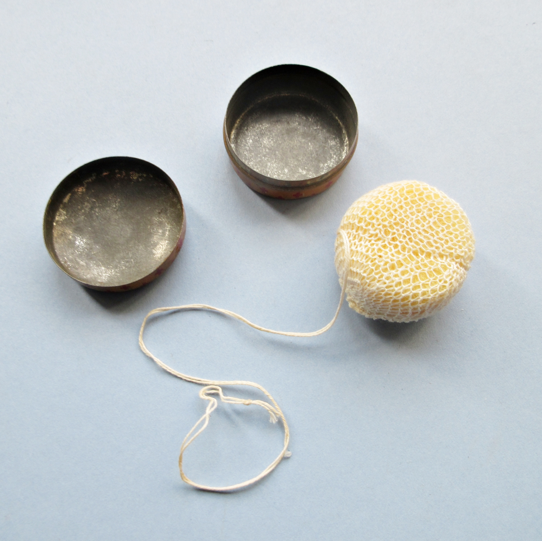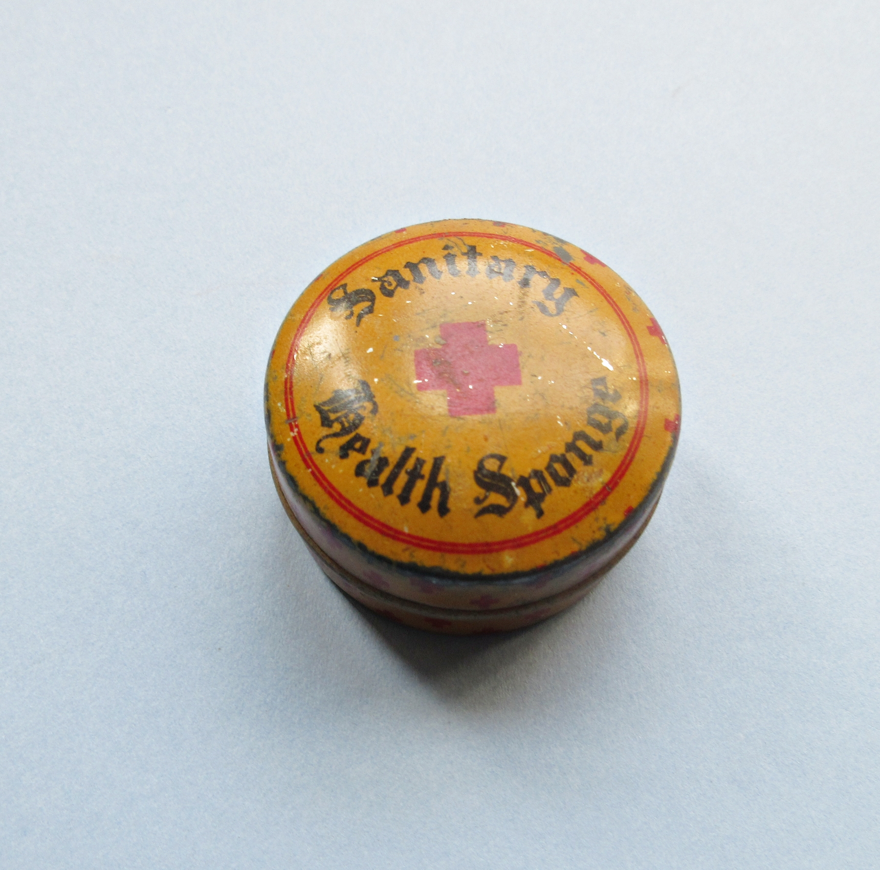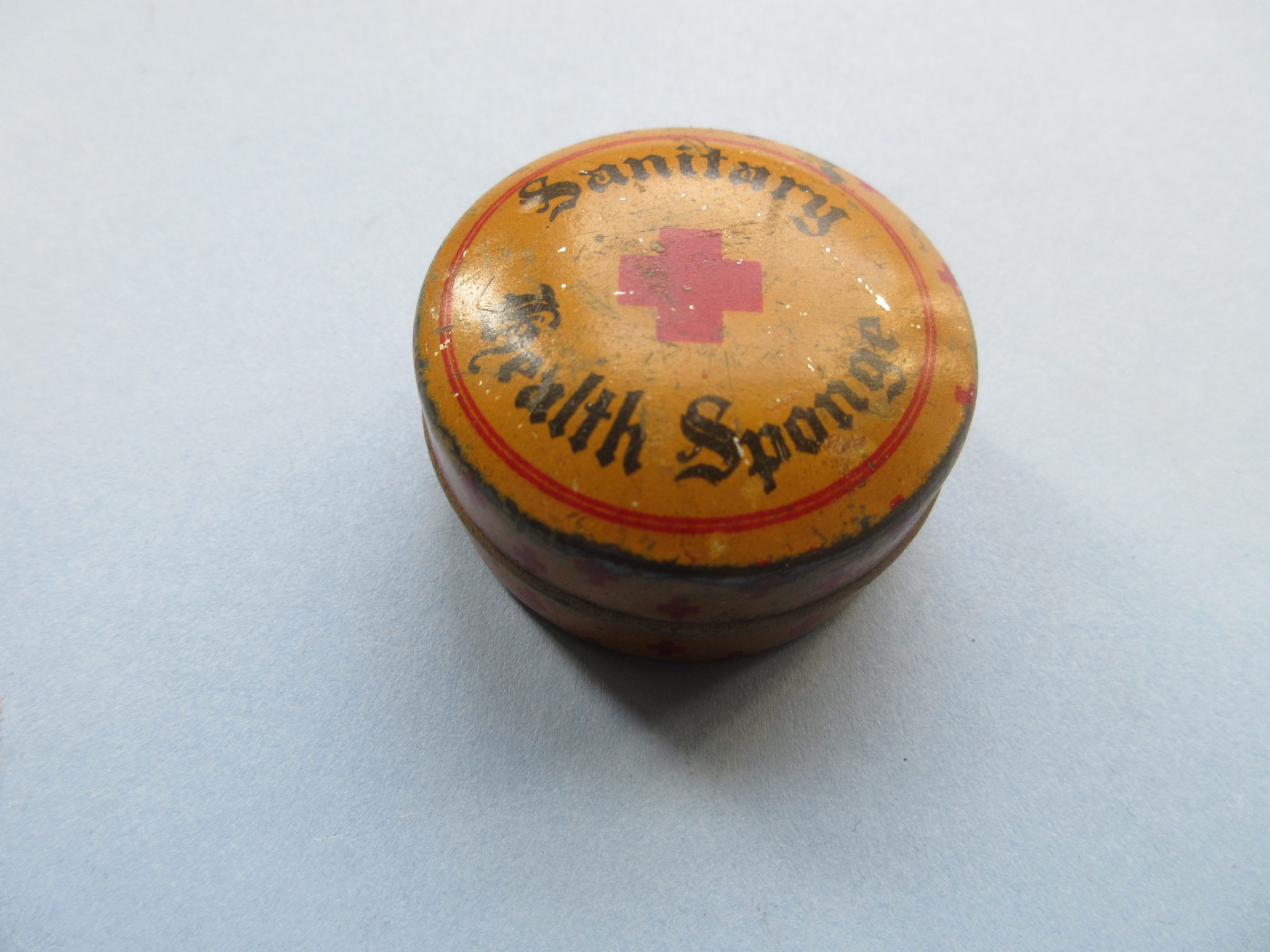 An unused 1920s contraceptive sponge in its original case (diameter of case= 1.75″ or 4.4cm approx.).The marine sponge was held in cotton netting with a string attached to aid in its extraction. The case is lithographed tin It was sold as a “Sanitary Health Sponges”, or similar, because promoting them as a birth-control device would have violated the 19th-century law regarding what could be shipped through the mails: the so-called Comstock Laws, which are still in effect but largely not enforced in the USA. . Such sponges were inserted into the vagina before intercourse and then, after at least 6 hours, removed and carefully washed to facilitate reuse. This sponge is being sold for display only.
