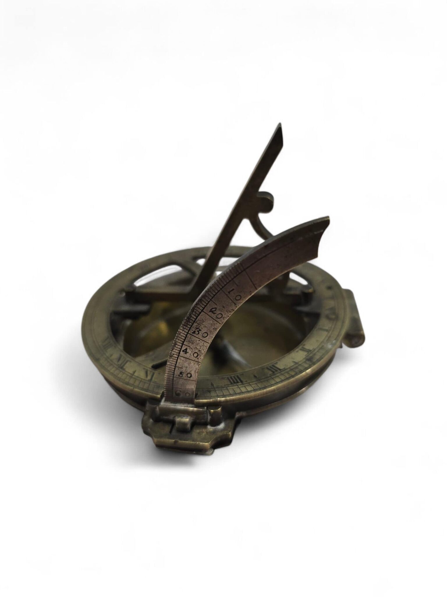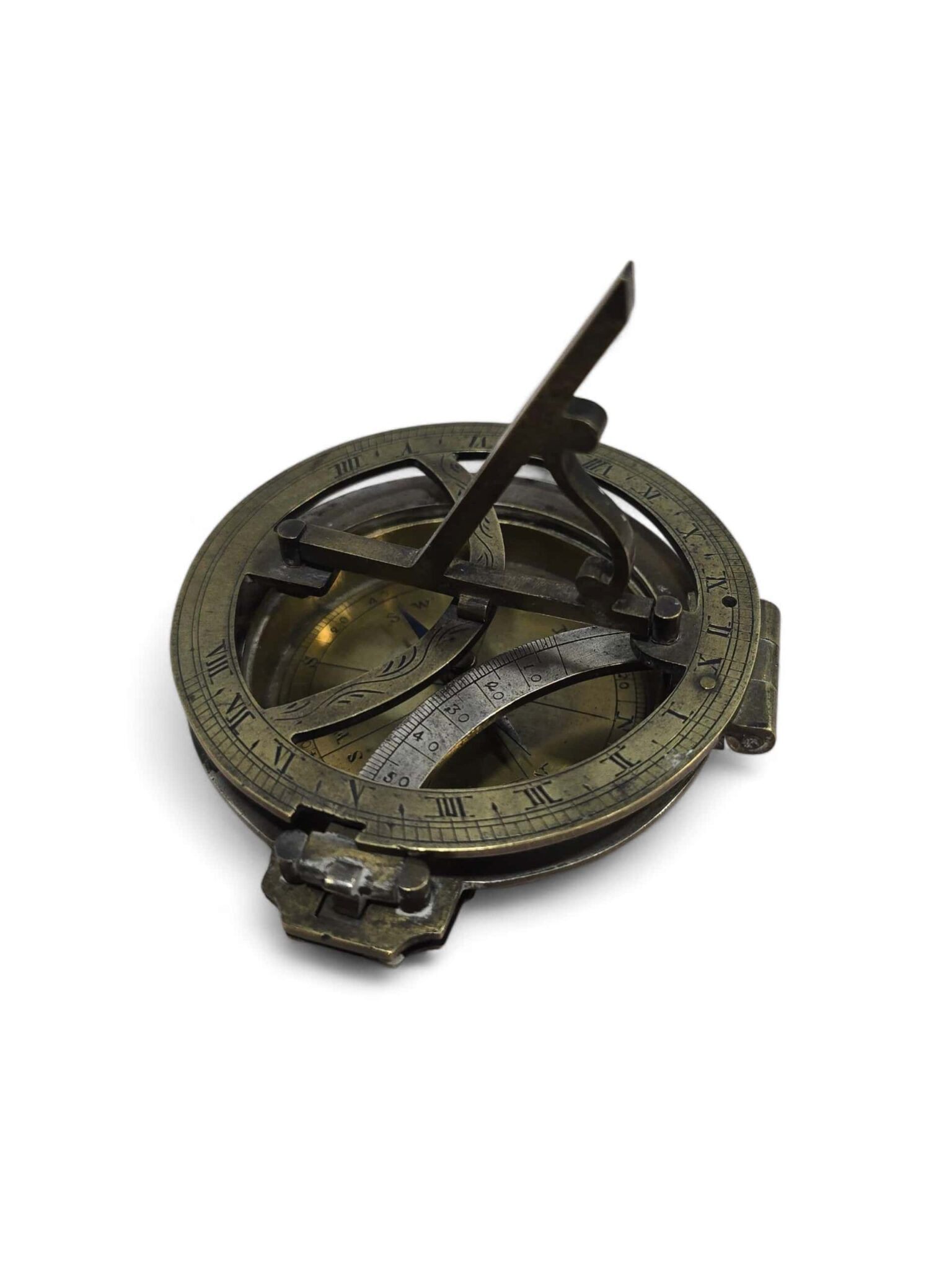 Elegant 19th-century portable sundial crafted in bronze, partially silvered and finely engraved with precise calibrations and decorative detailing.