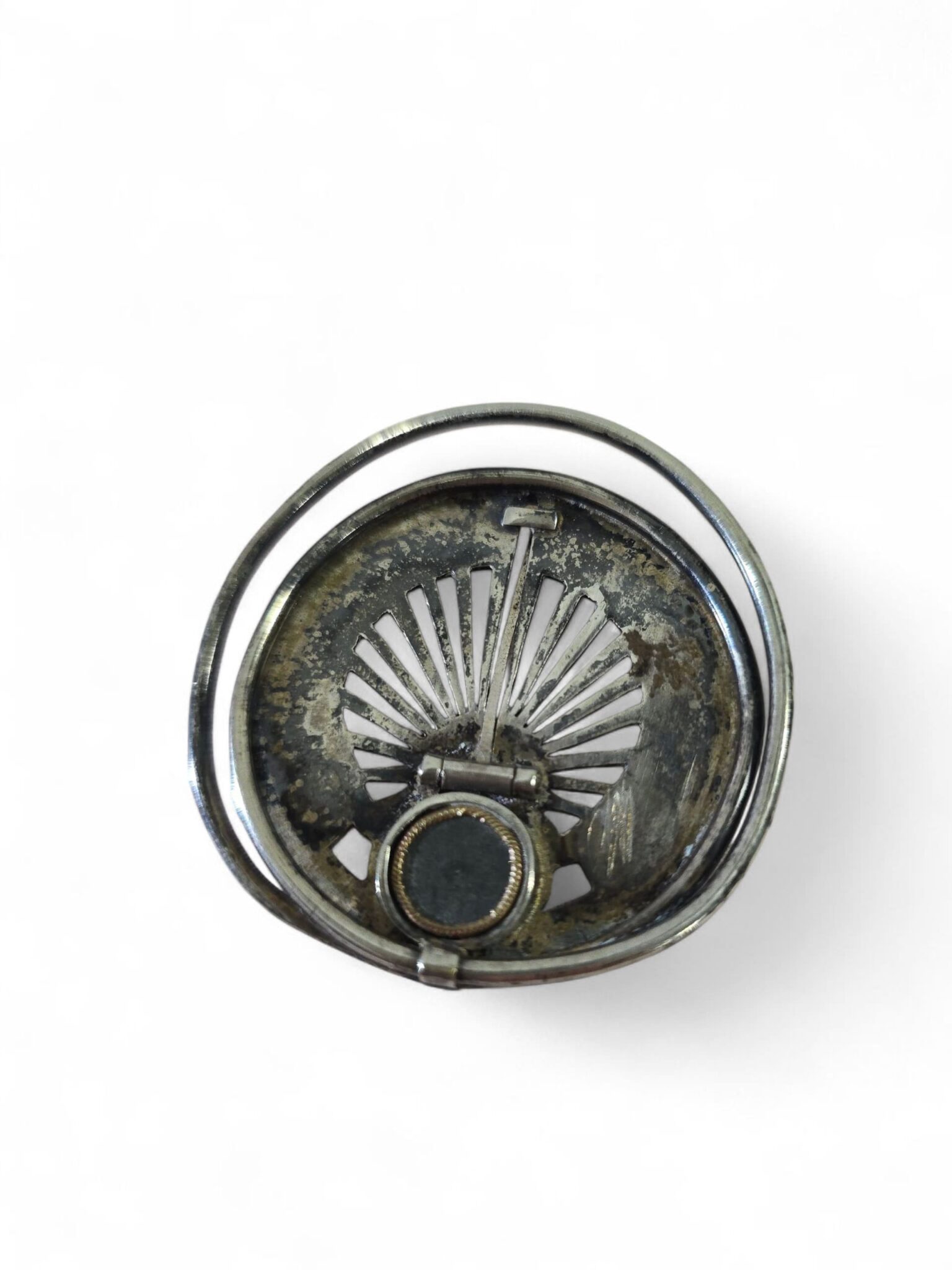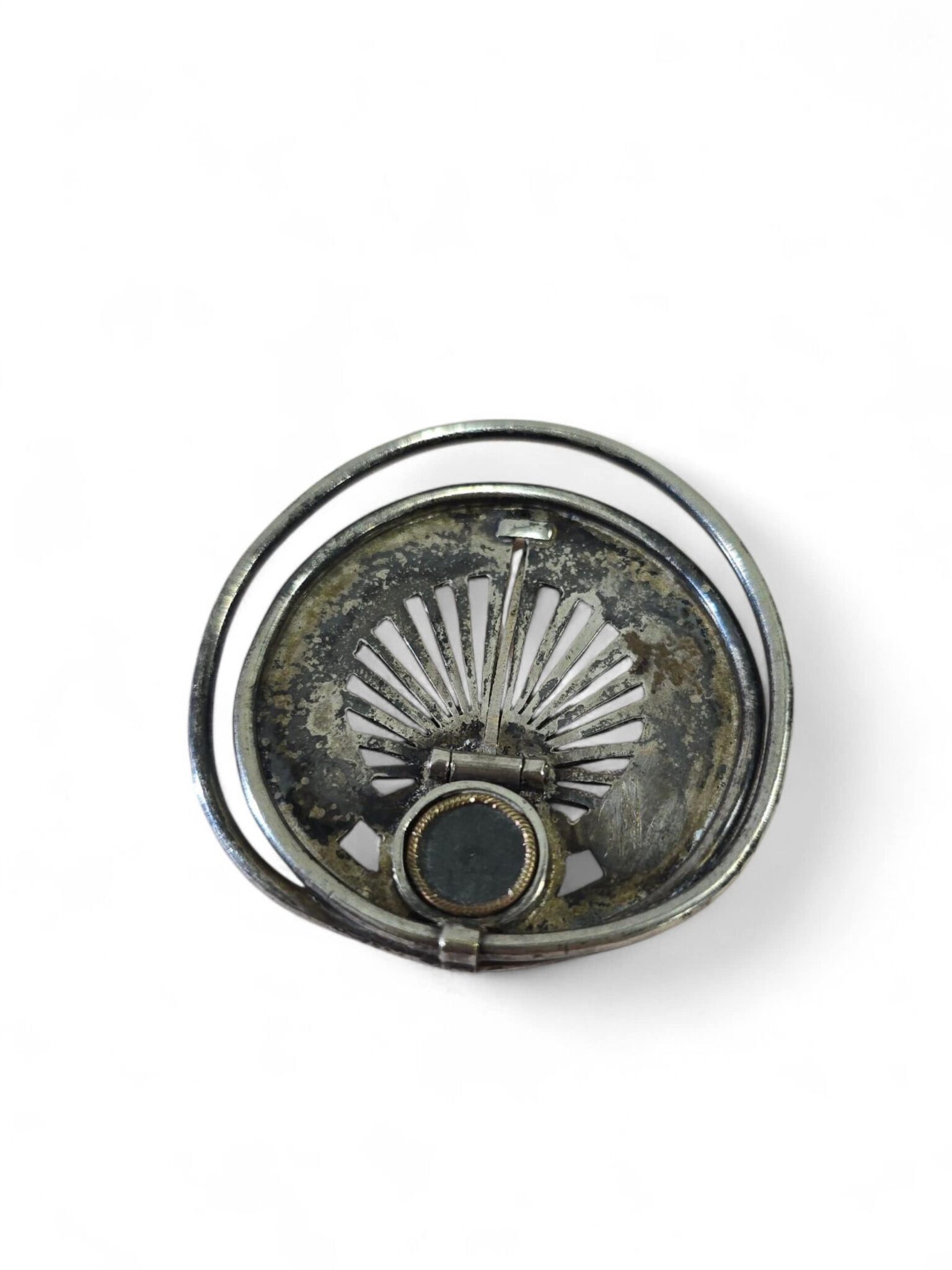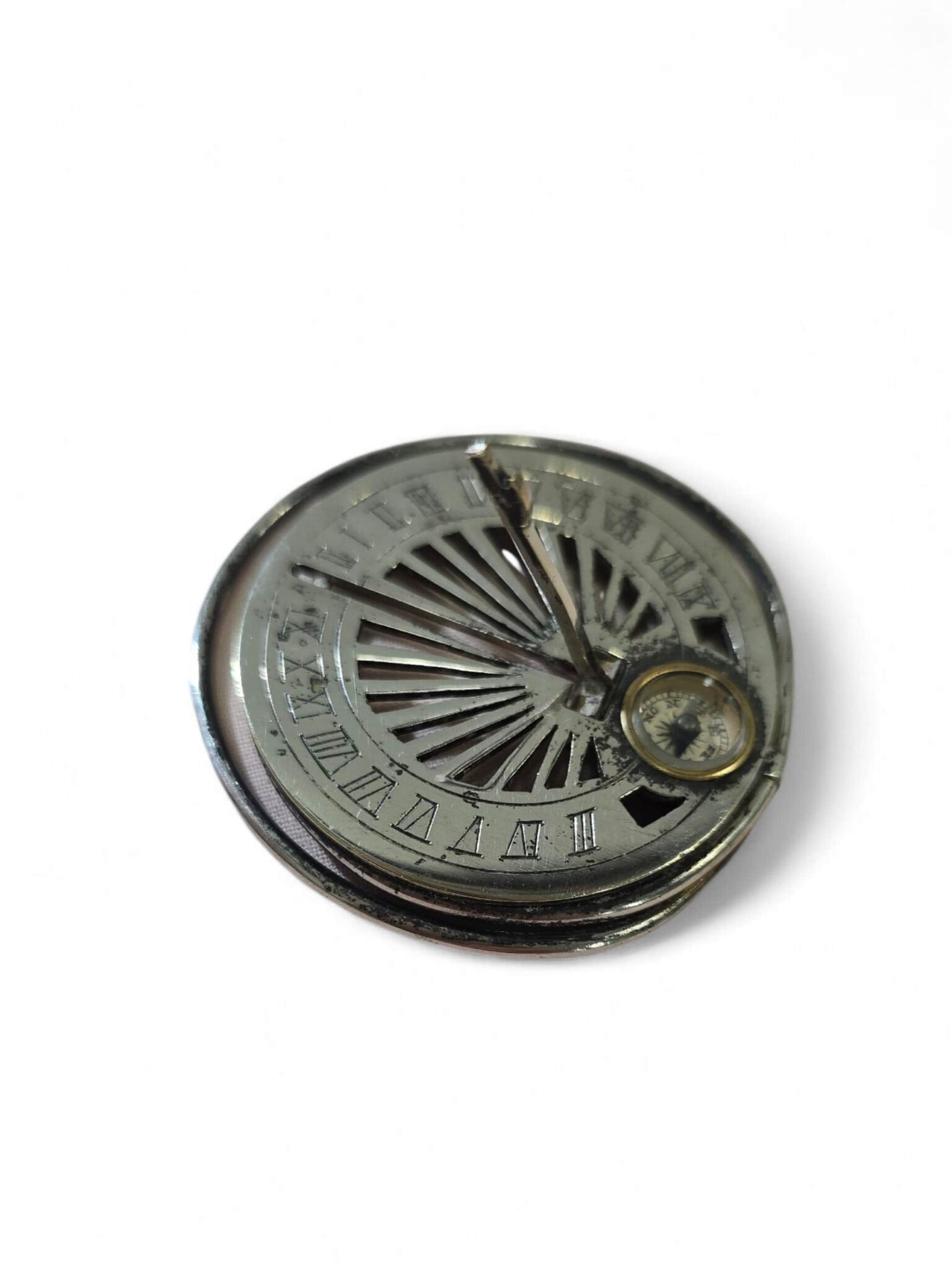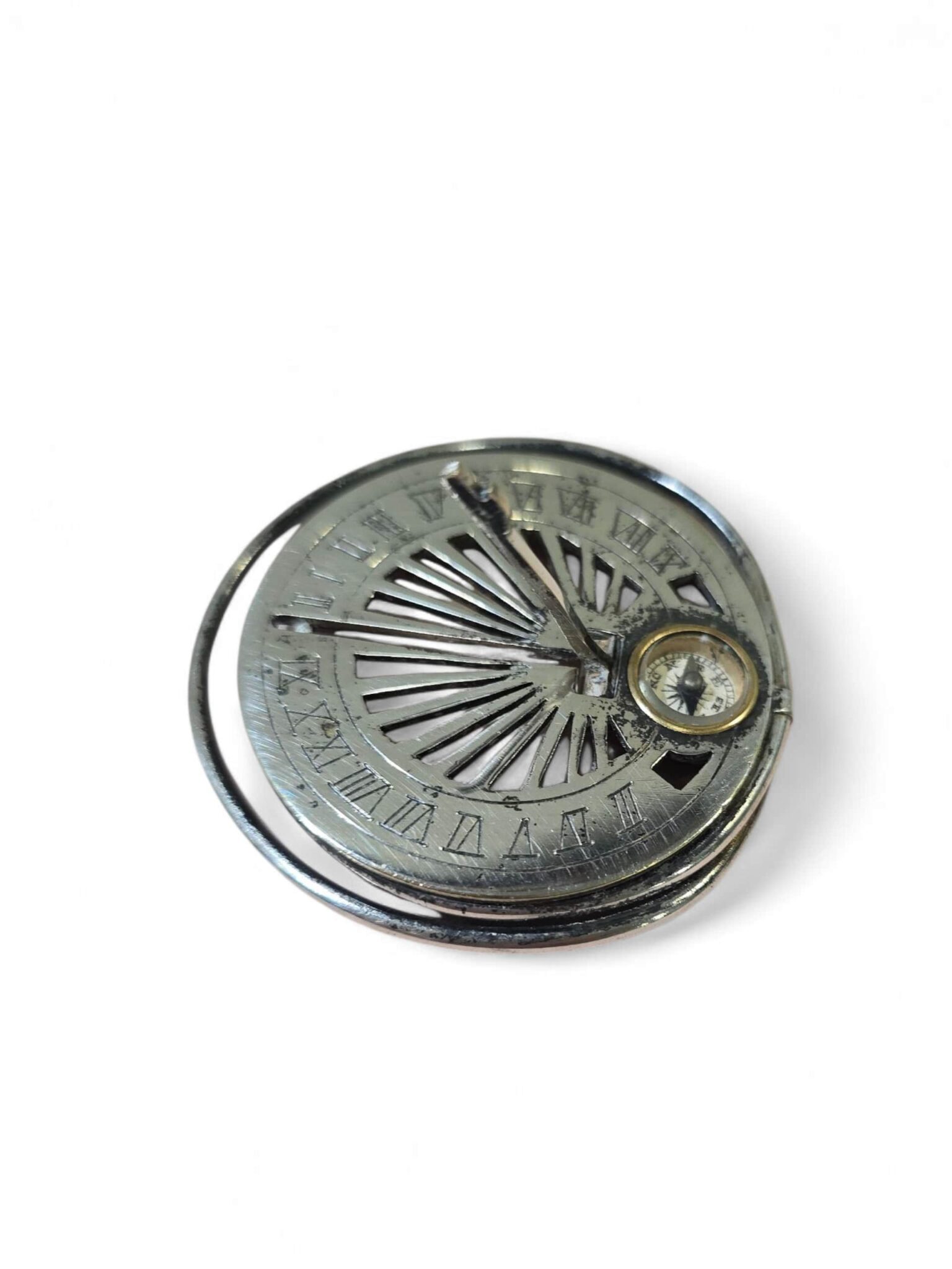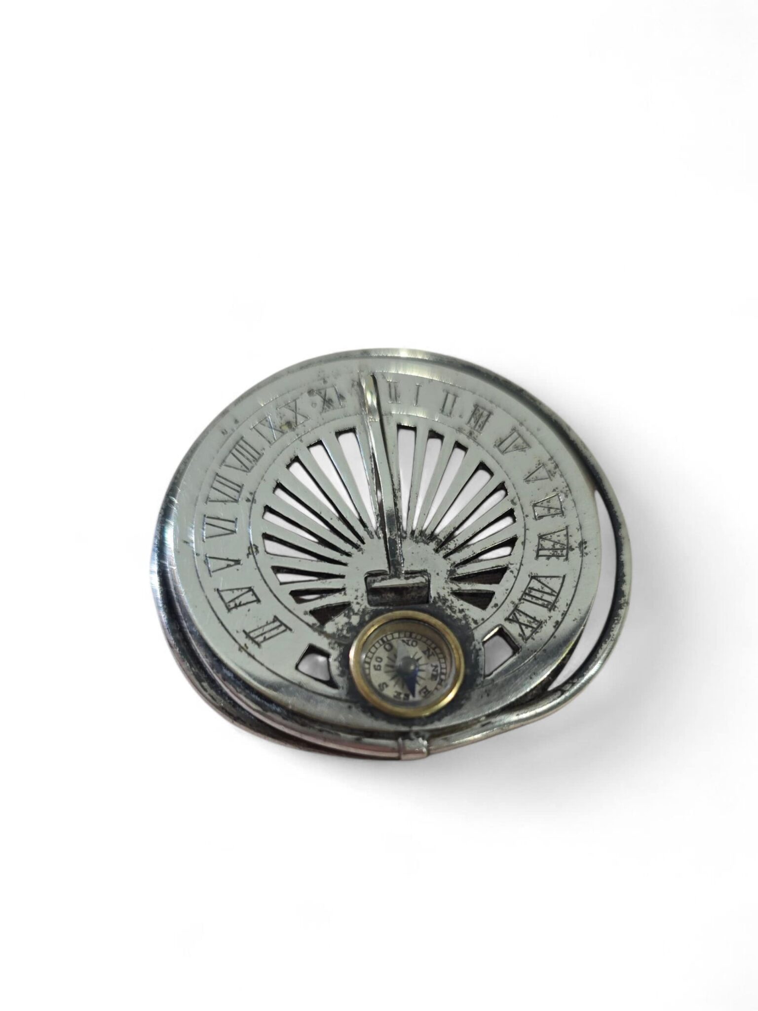 Elegant 19th-century pocket sundial, designed to be worn or carried, made of silvered metal with finely engraved details.