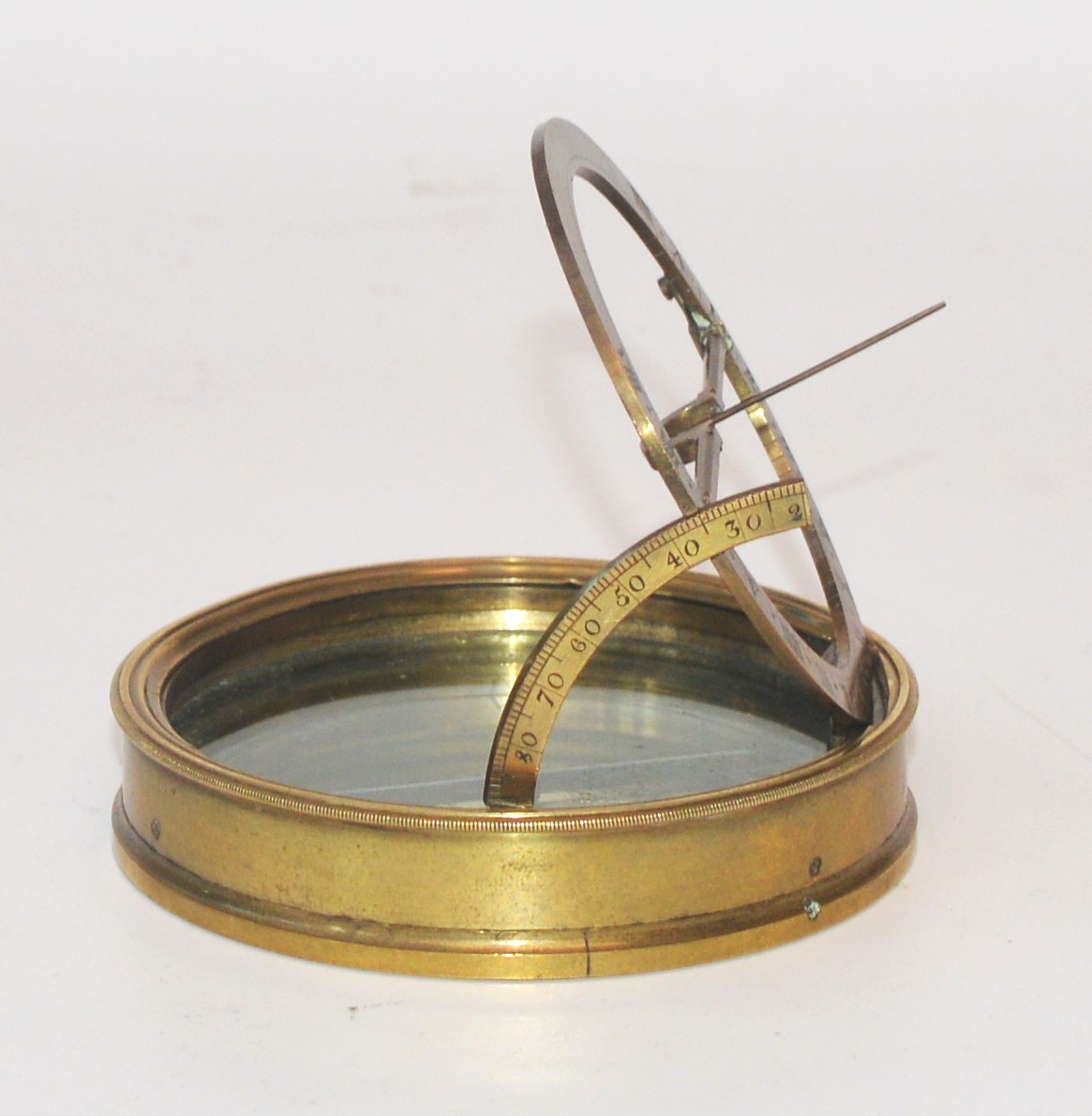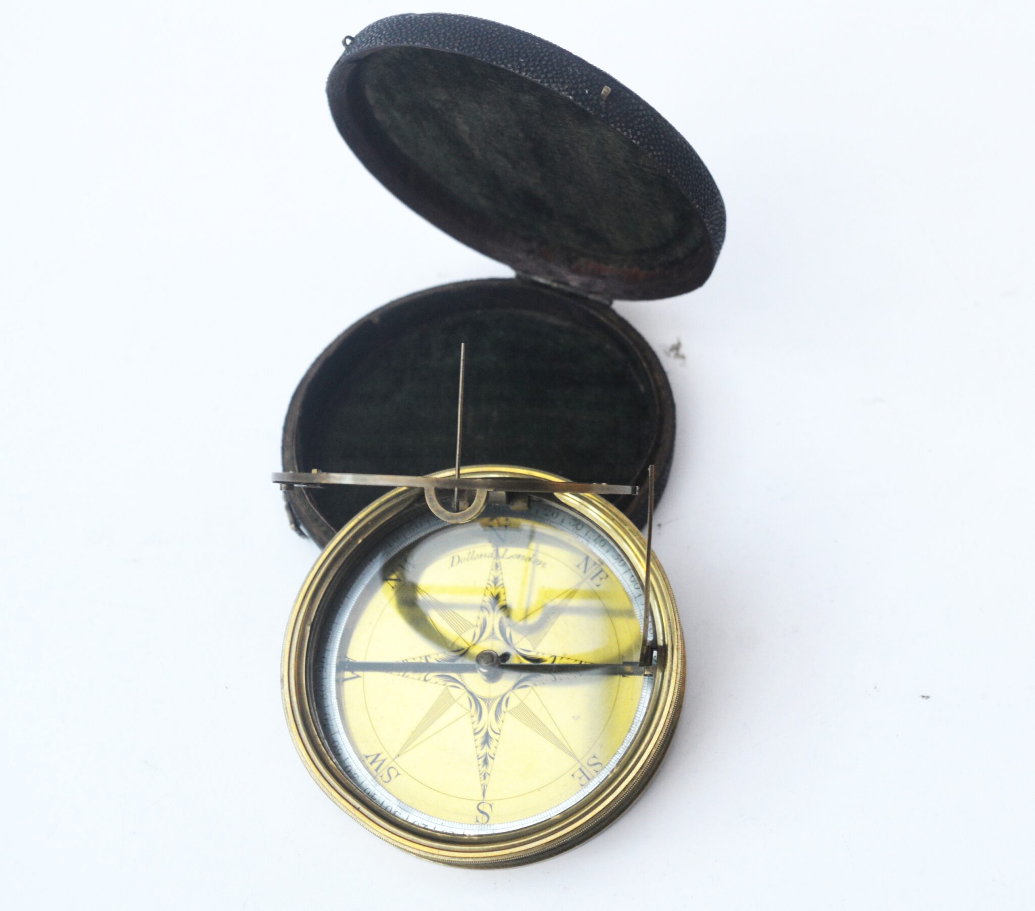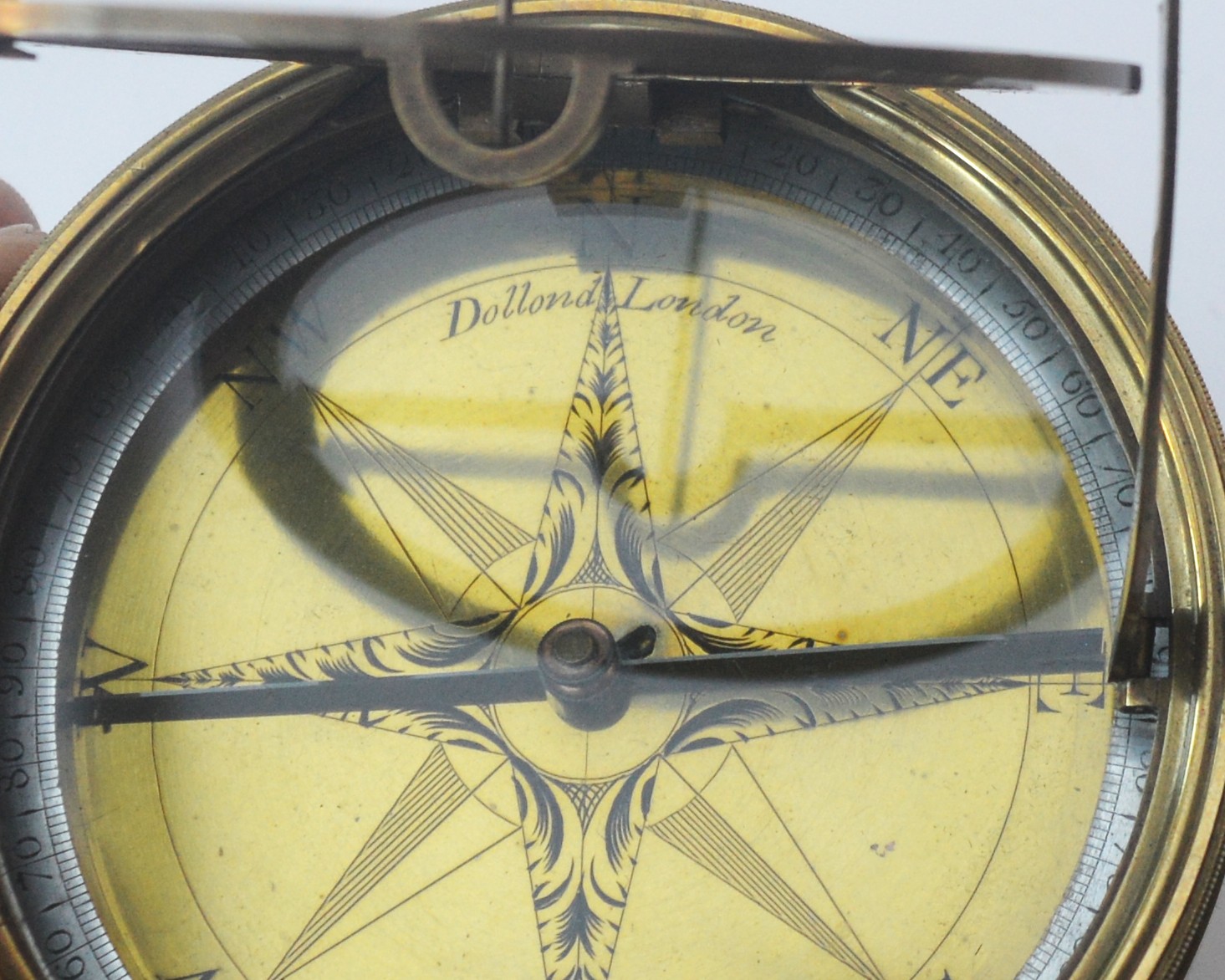 The inner base has a large engraved compass rose and is signed, ‘Dollond, London’ with a raised outer silvered scale reading from 0 – 90 – 0 – 90 etc.