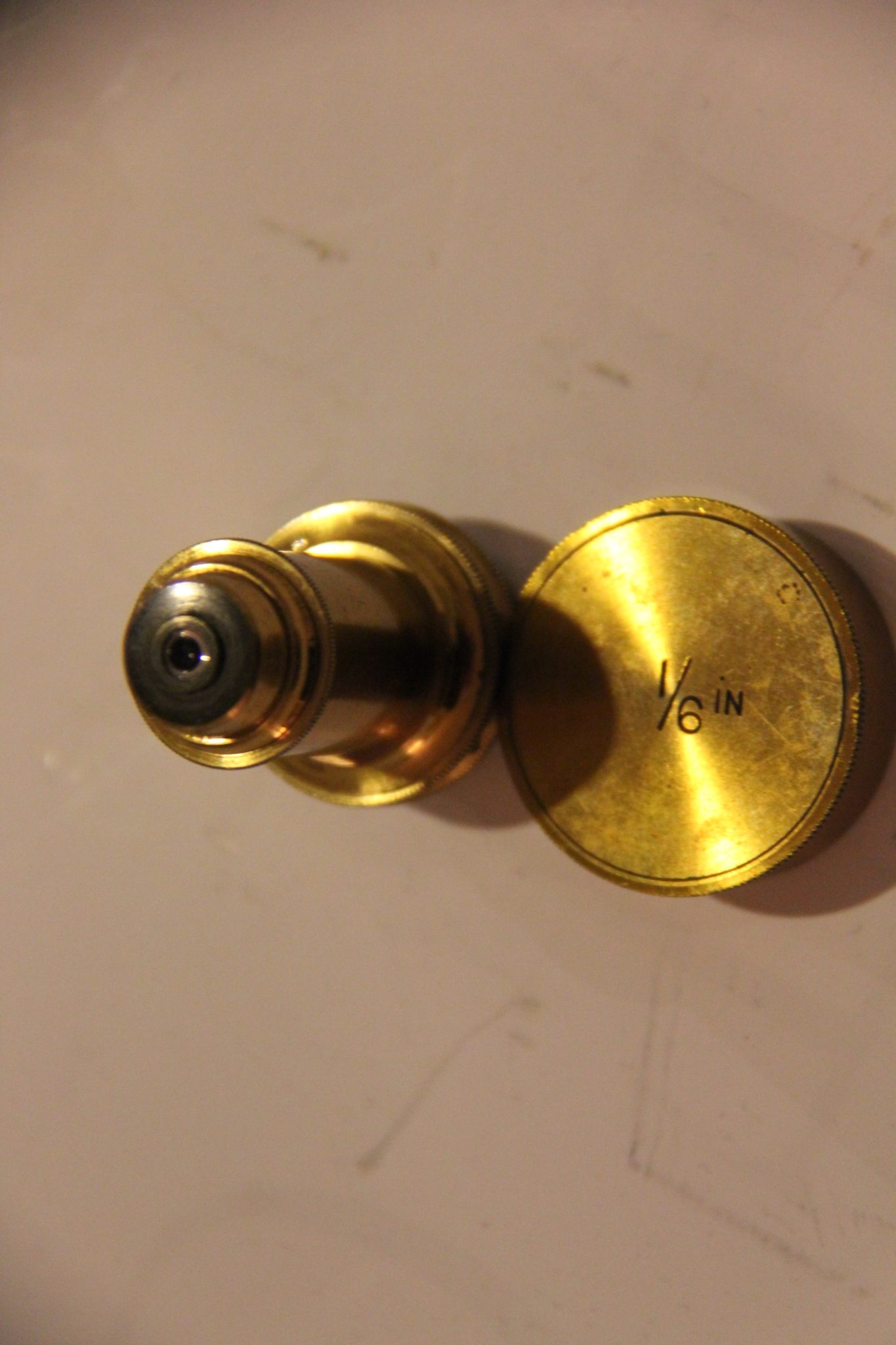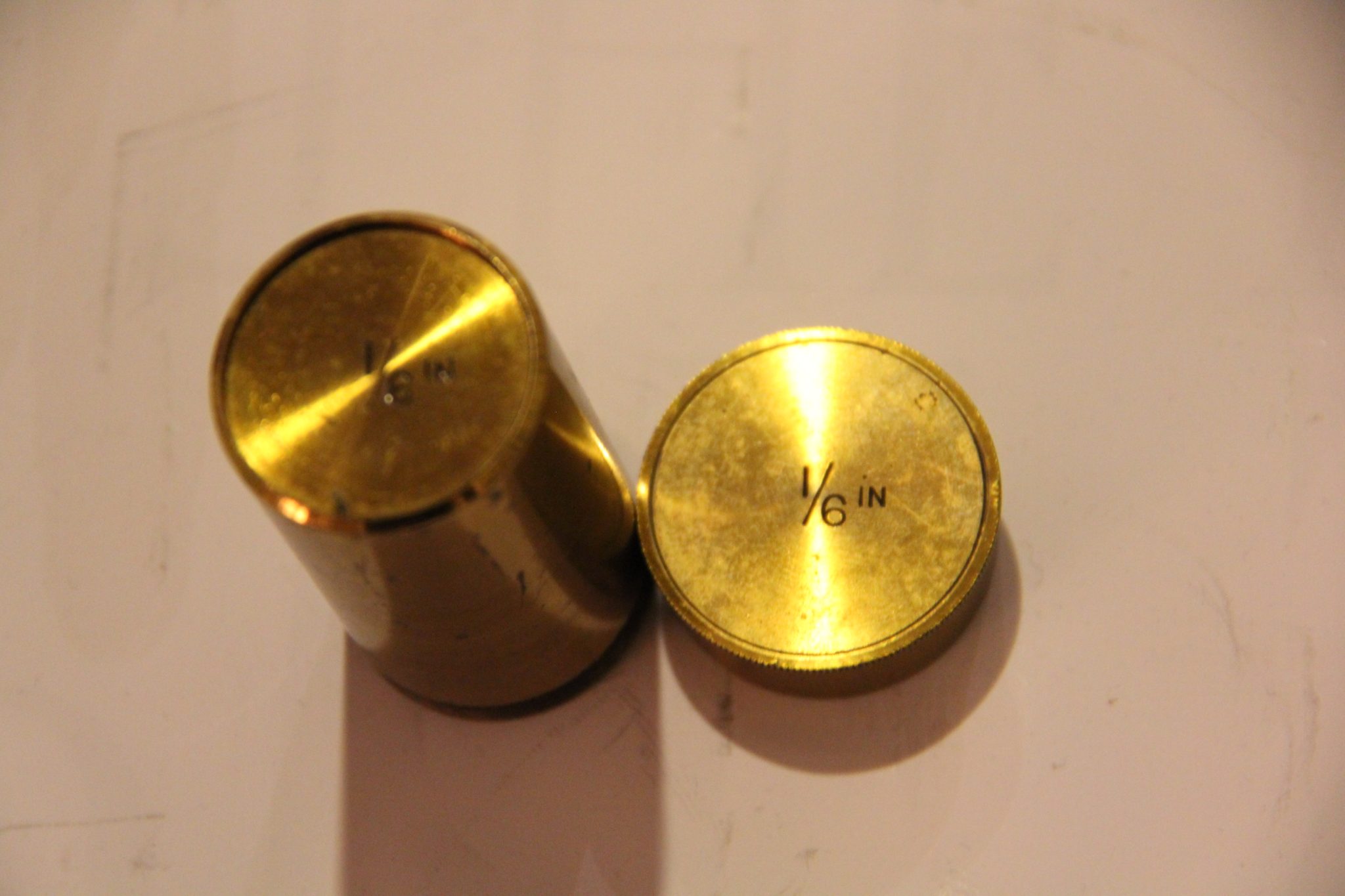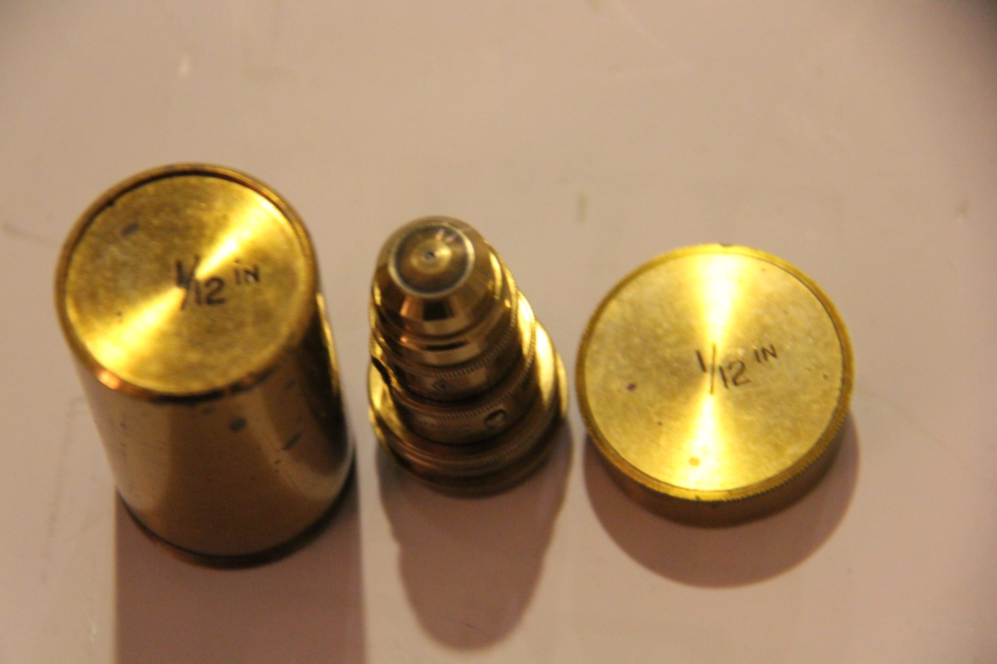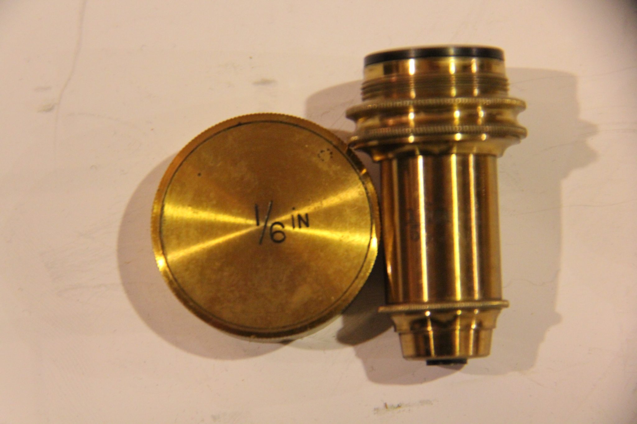 Two fine RMS objectives marked 1/6 and 1/12 (with correction collar) in canisters.