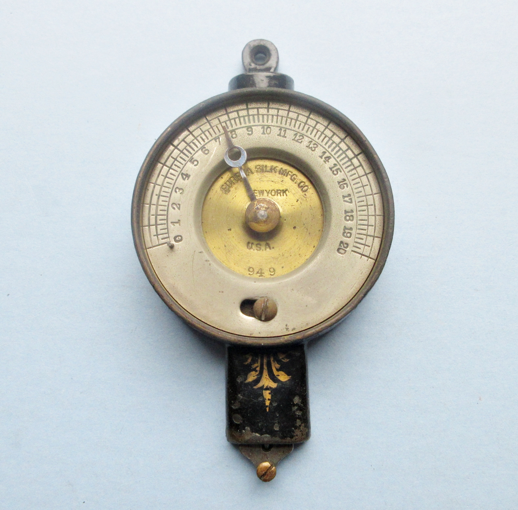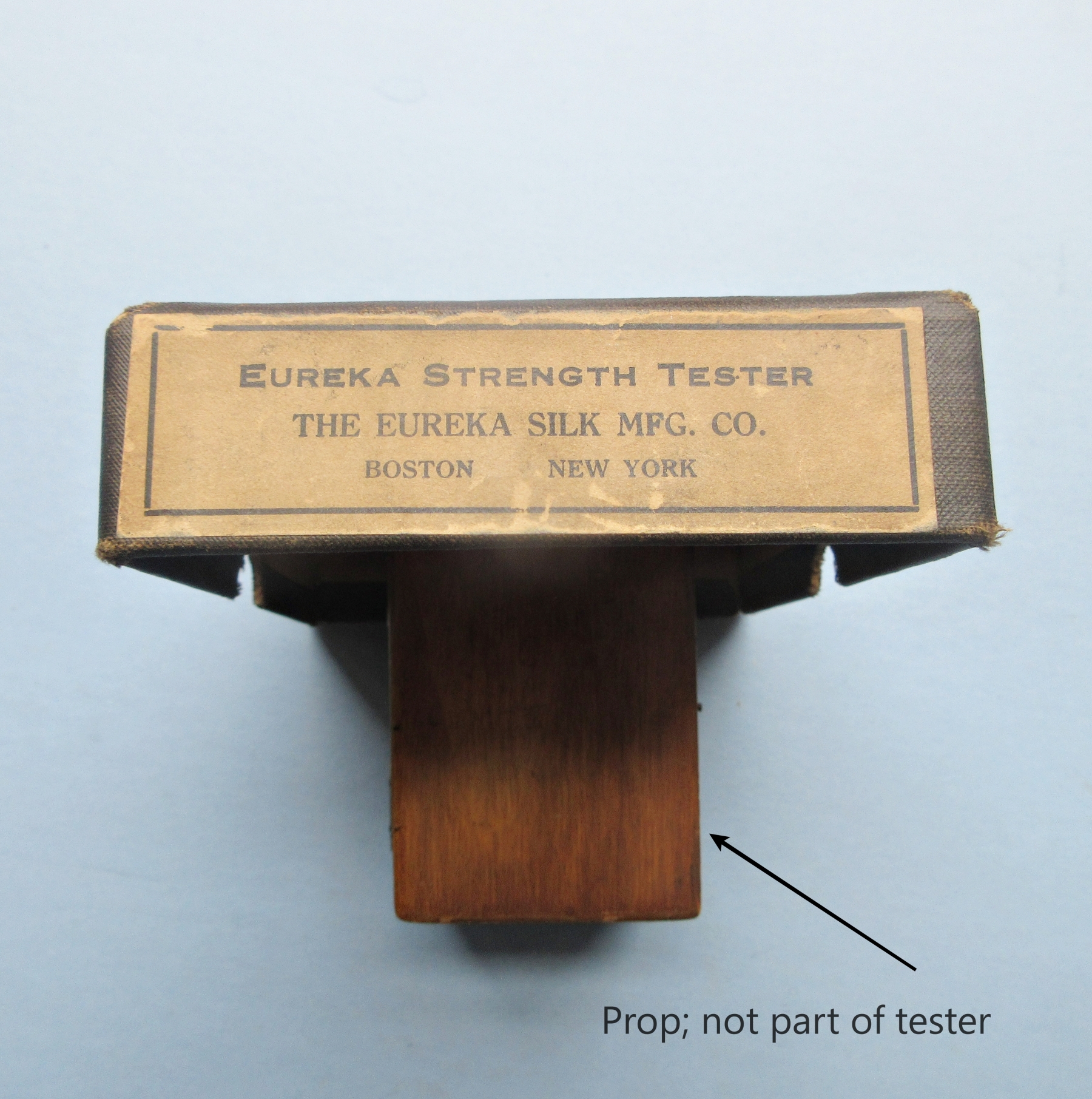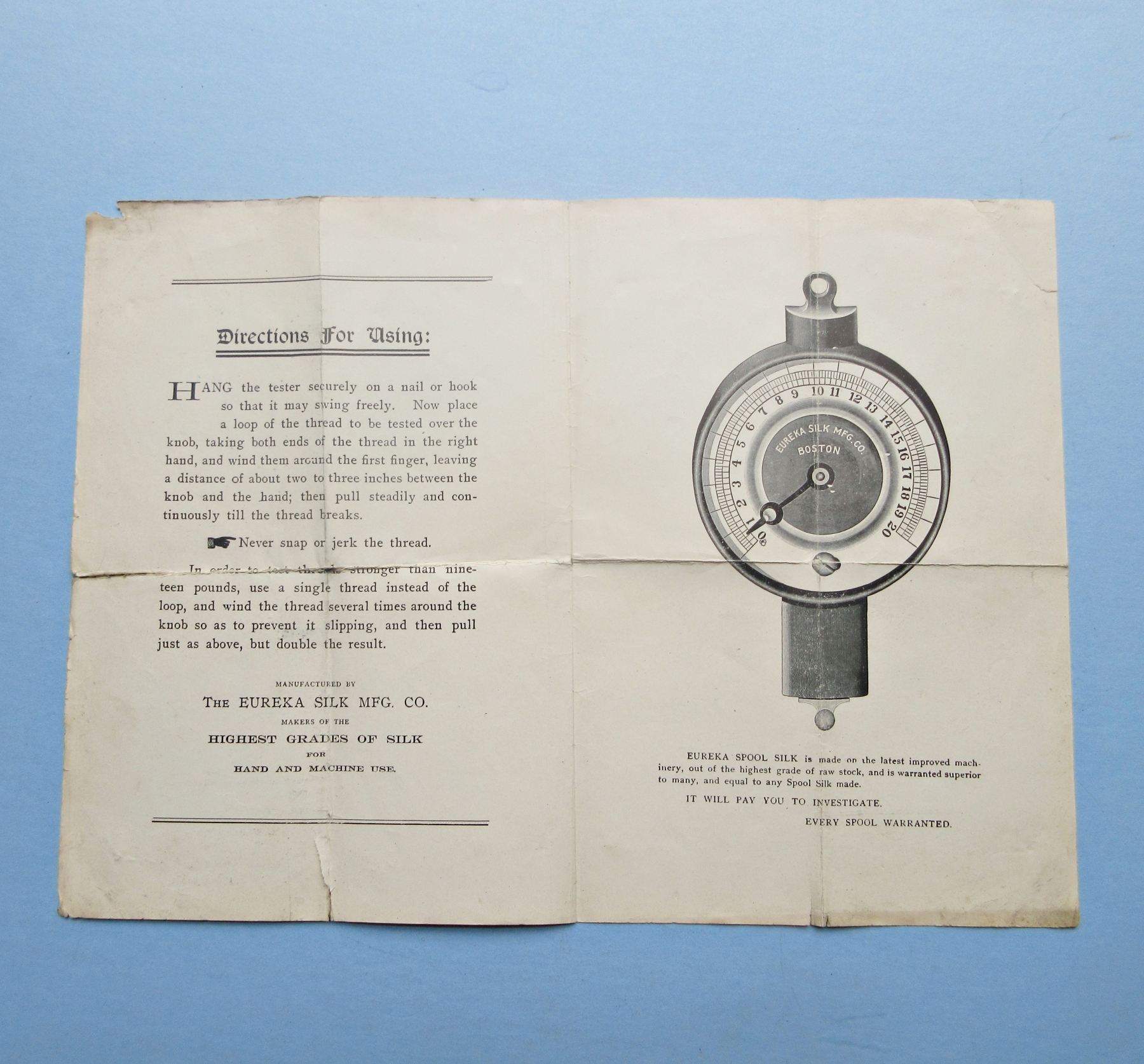 A C1917 Eureka Thread Tester that retains its original labeled box and paperwork. Appears to be in working order. Height of instrument :6″. There is a February 1917 date hand stamped on the interior base of of the box.The company was renamed the Eureka Silk Manufacturing Company in 1881. Thus we can assume that this device was produced between that date and 1917. The company advertised it as follows: “for testing the strength of silk, linen and cotton thread. “