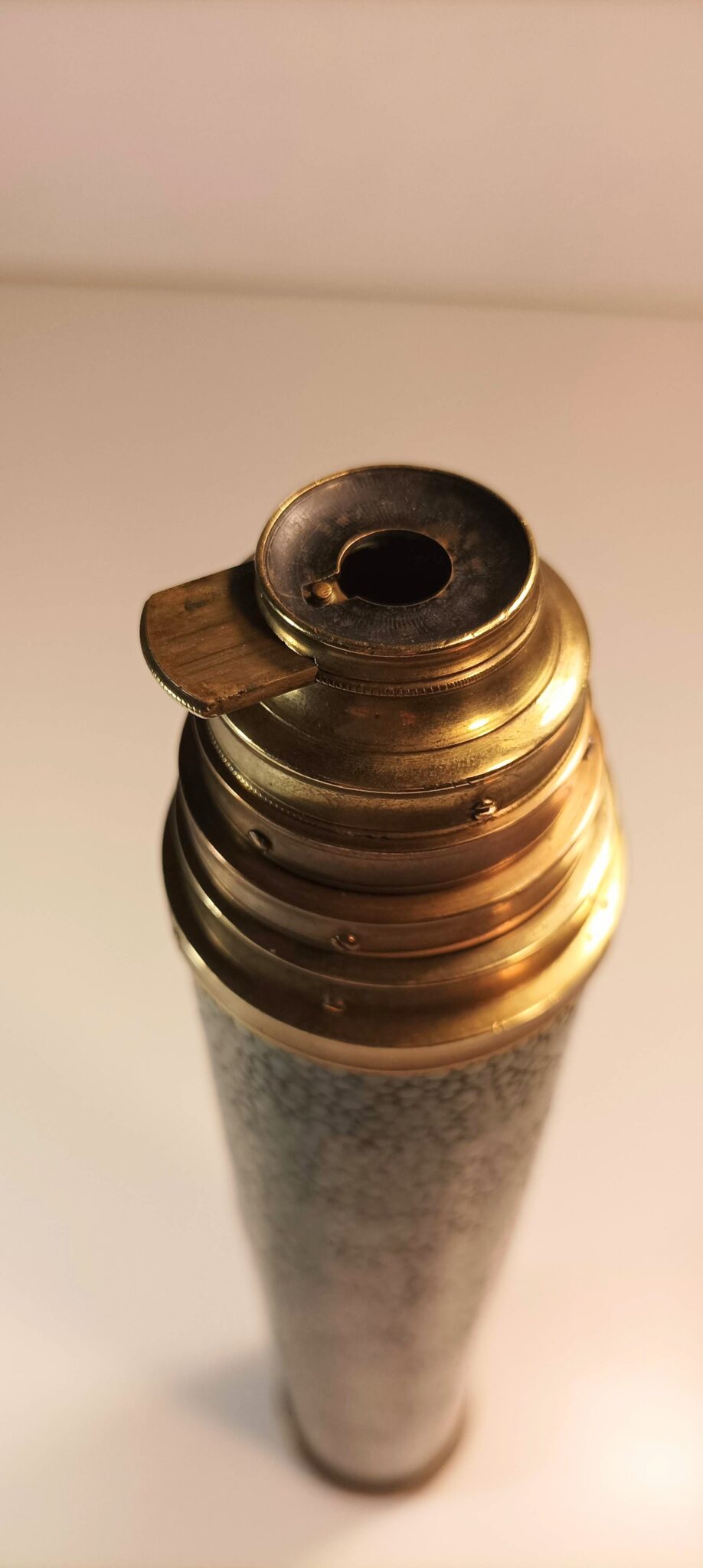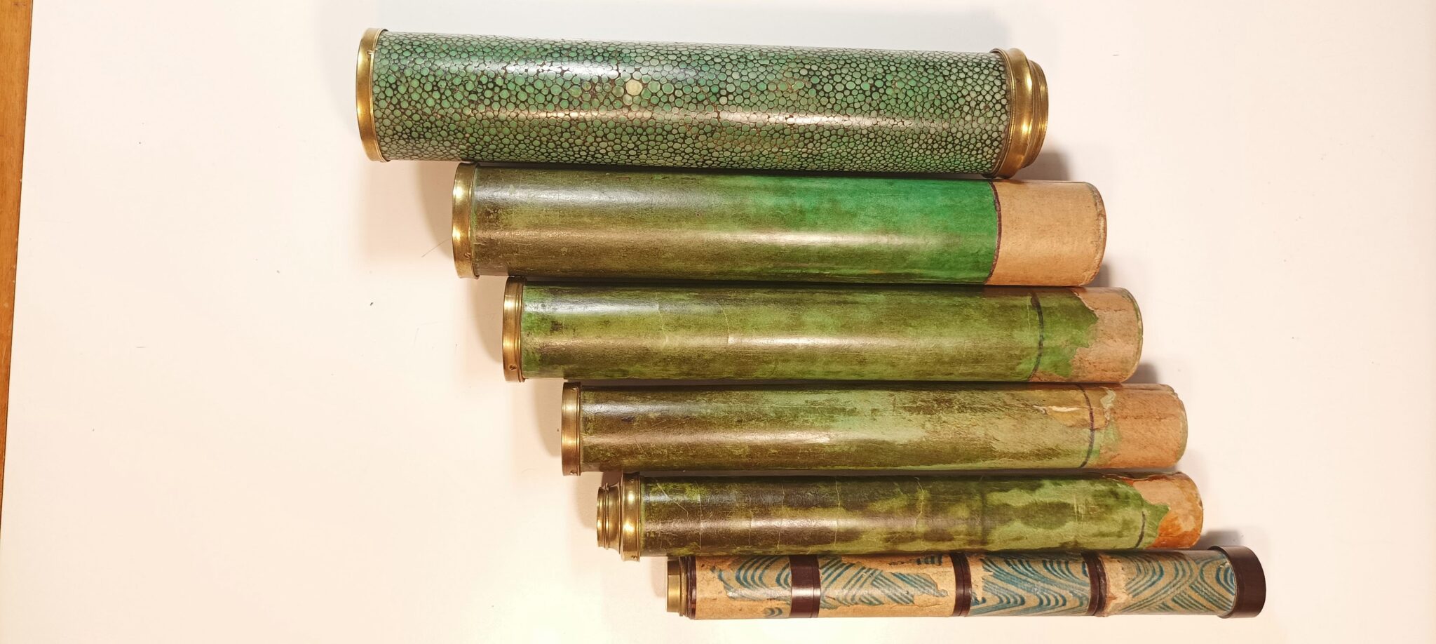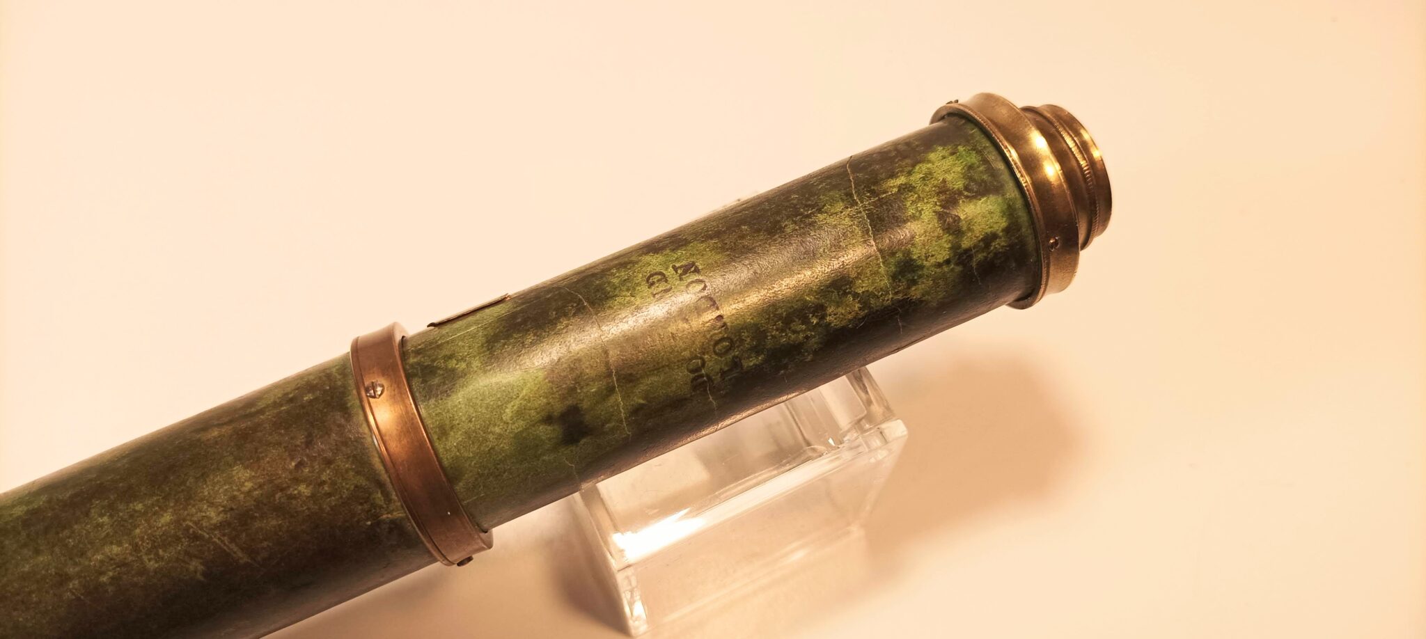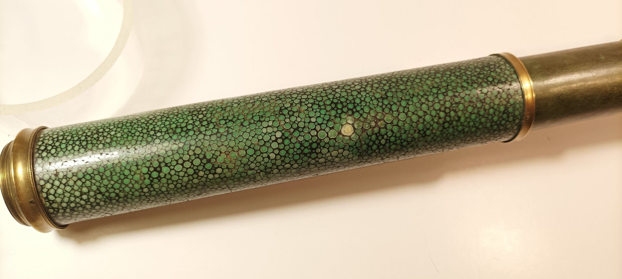 A good “Dollond London” four-draw tubes refracting telescope in green ray skin (shagreen) and green vellum tubes with brass fittings.