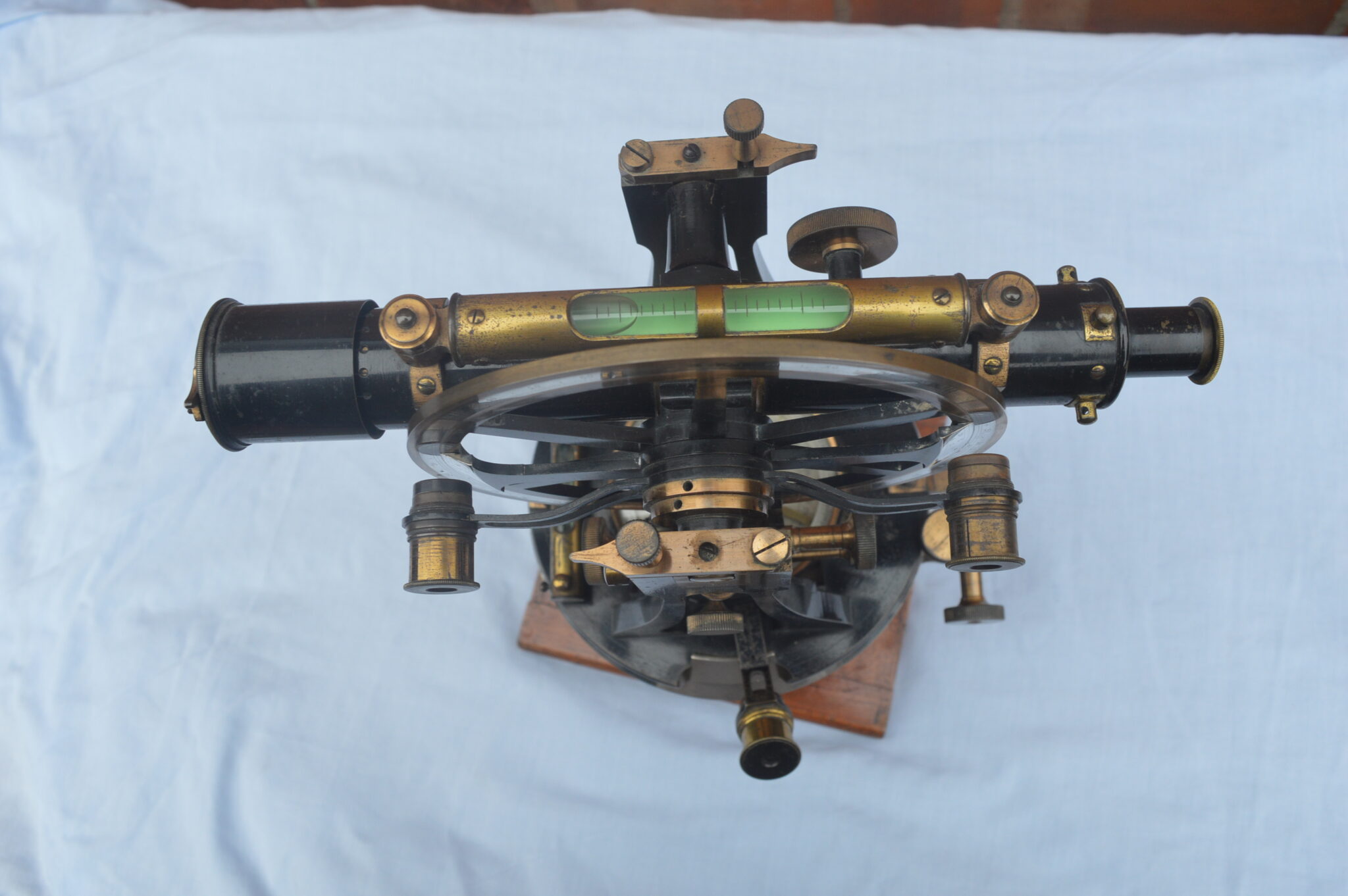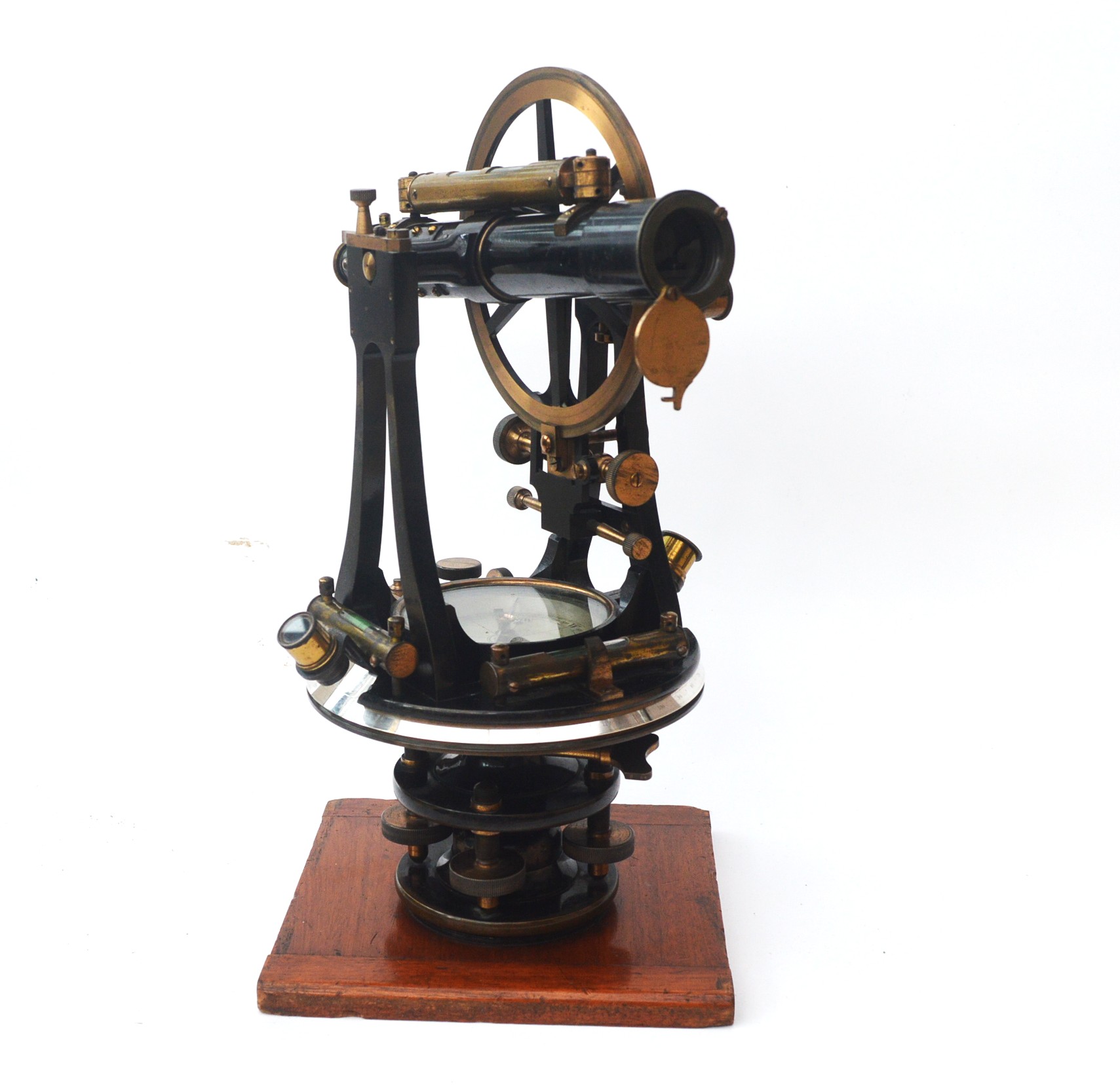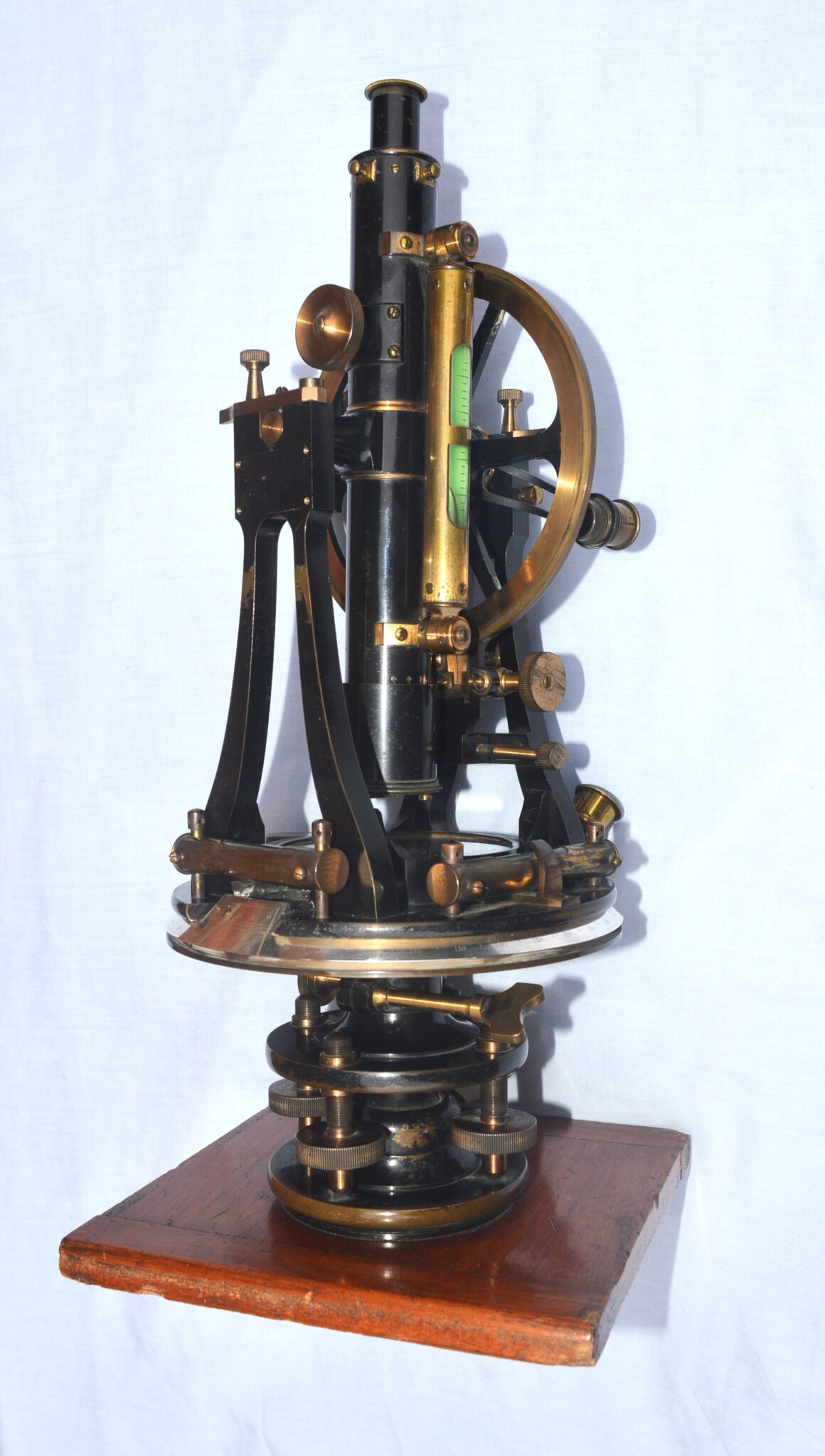 The instrument stands on a four screw adjustable base and there are various bubble levels, all intact. The telescope gives a clear inverted image with intact cross-hairs.