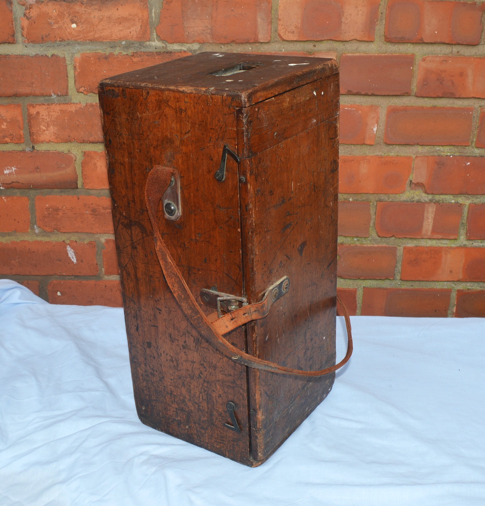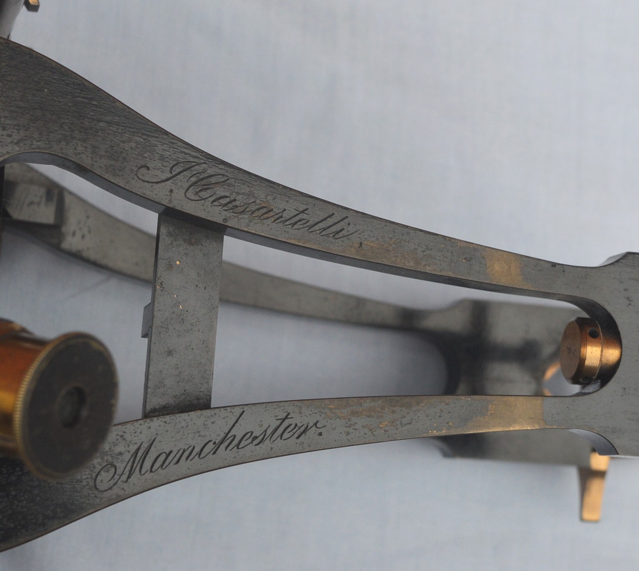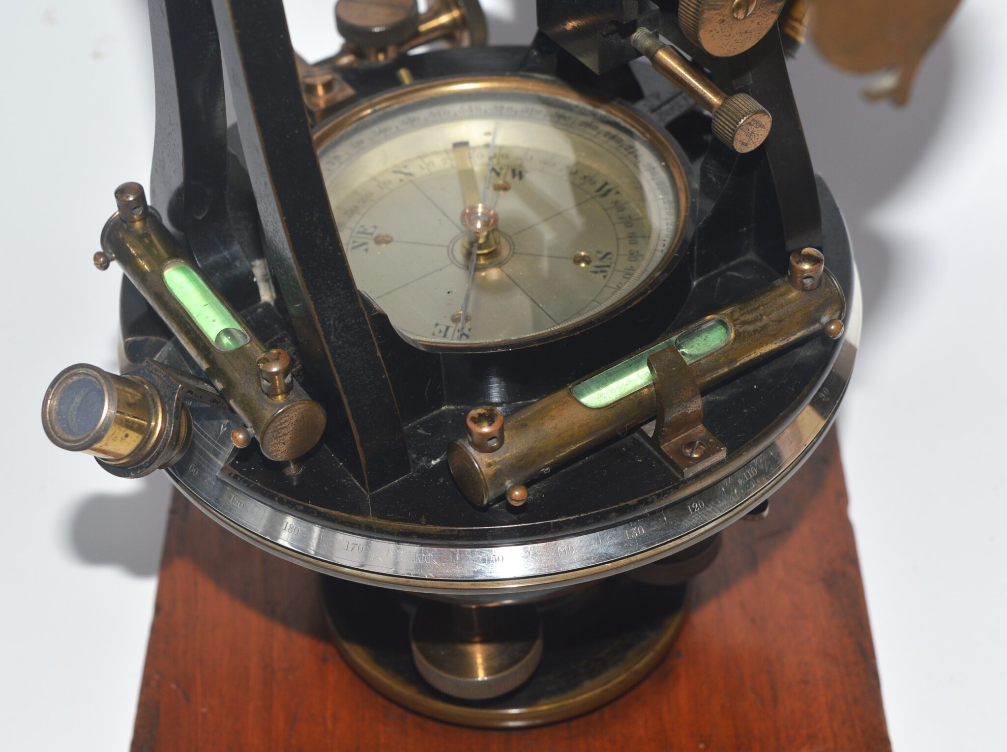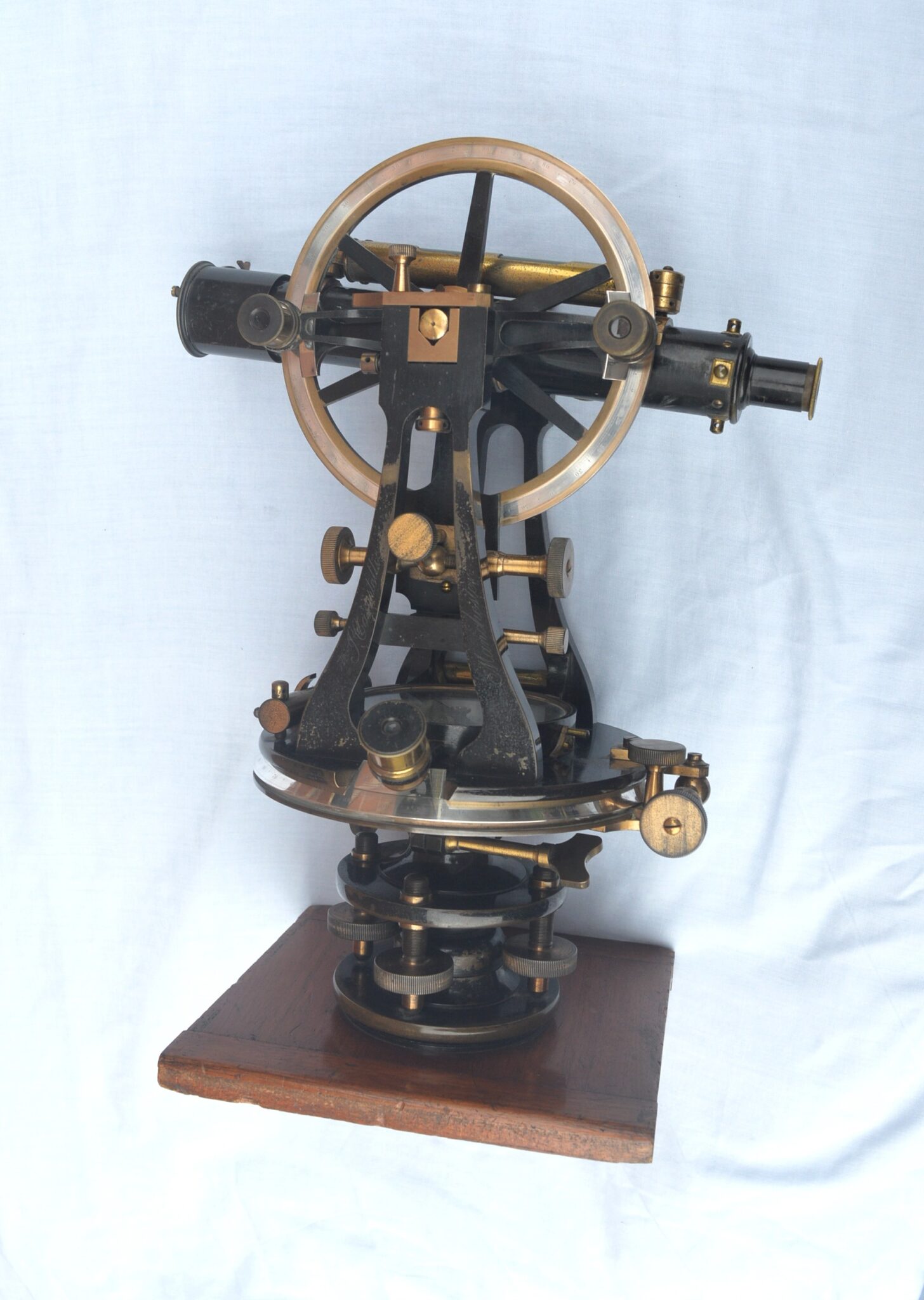 A large, late Victorian, brass theodolite engraved on one of the upright ‘A’ frames, ‘Casartelli, Manchester’. It stands 14 inches high on the the wooden plinth, the vertical plate has a diameter of 5.5″ and the horizontal plate 6.5″. The compass dial is 3.5″.