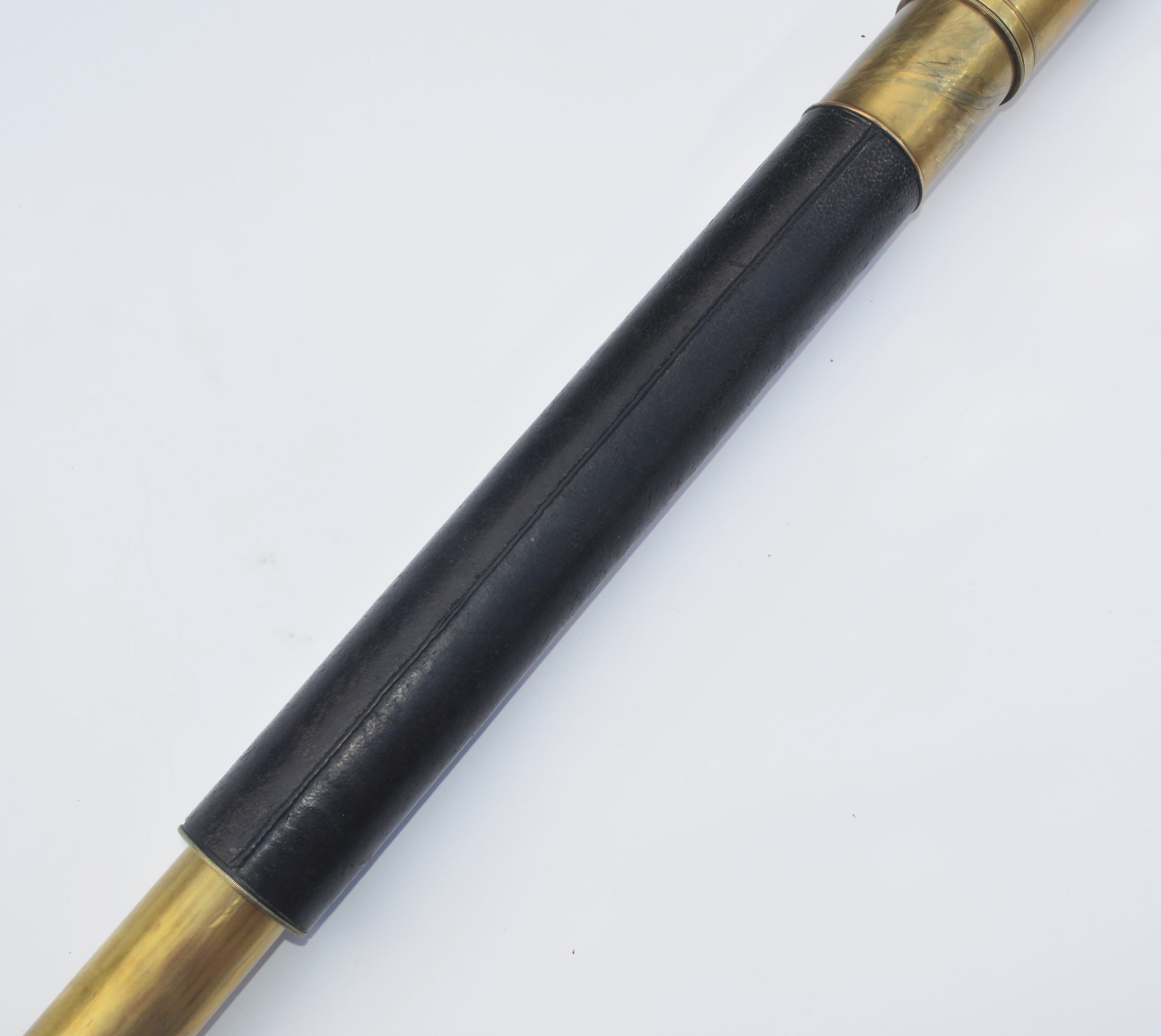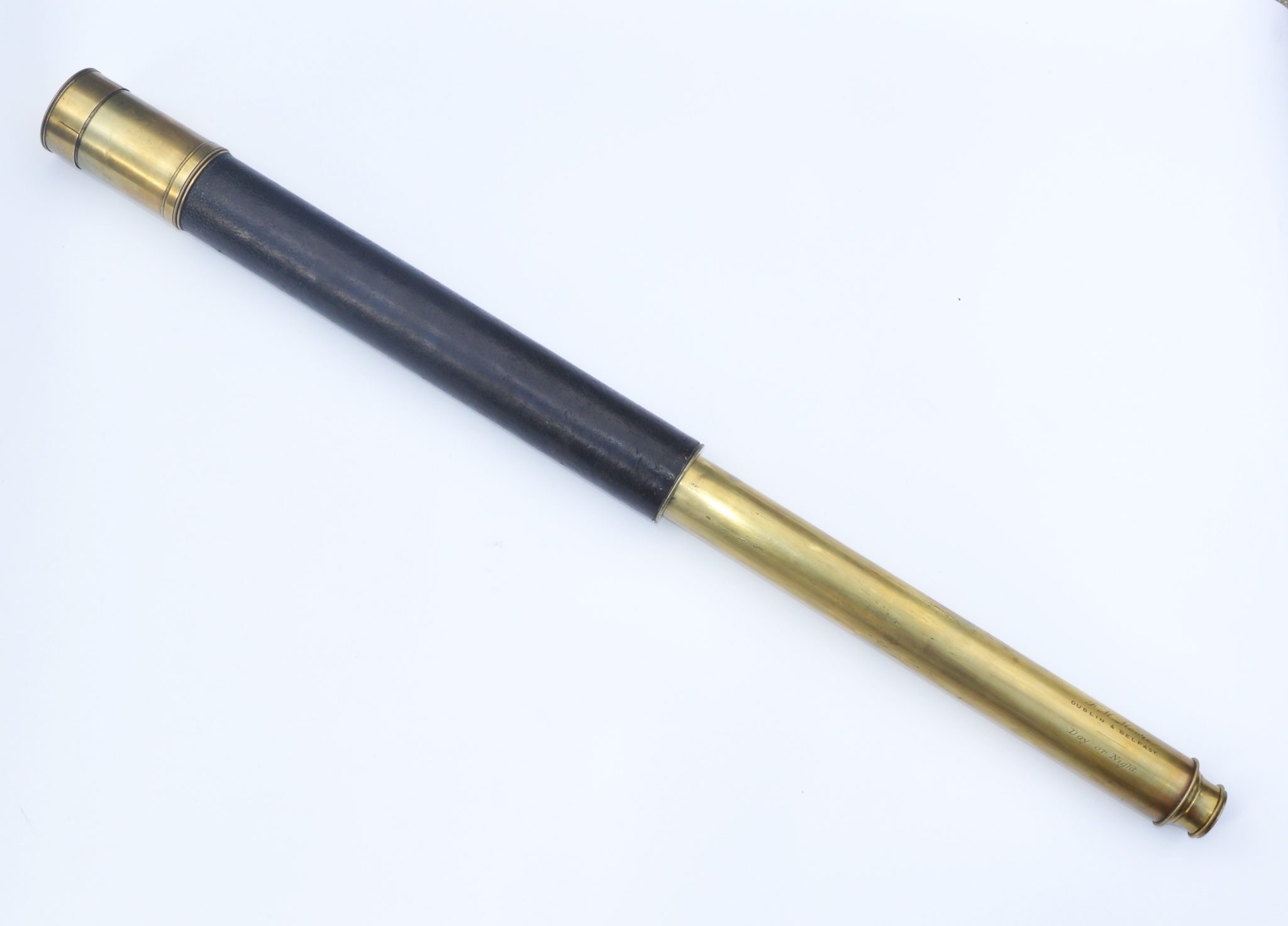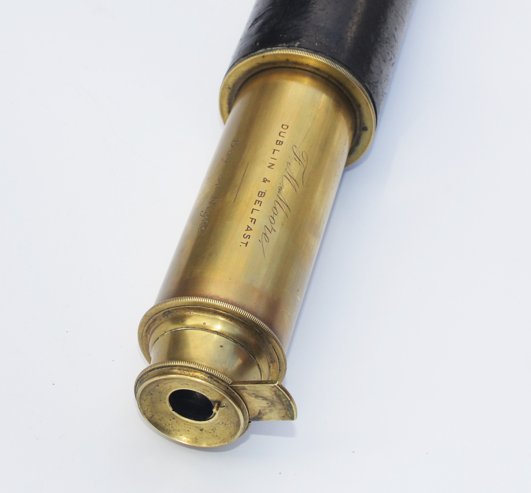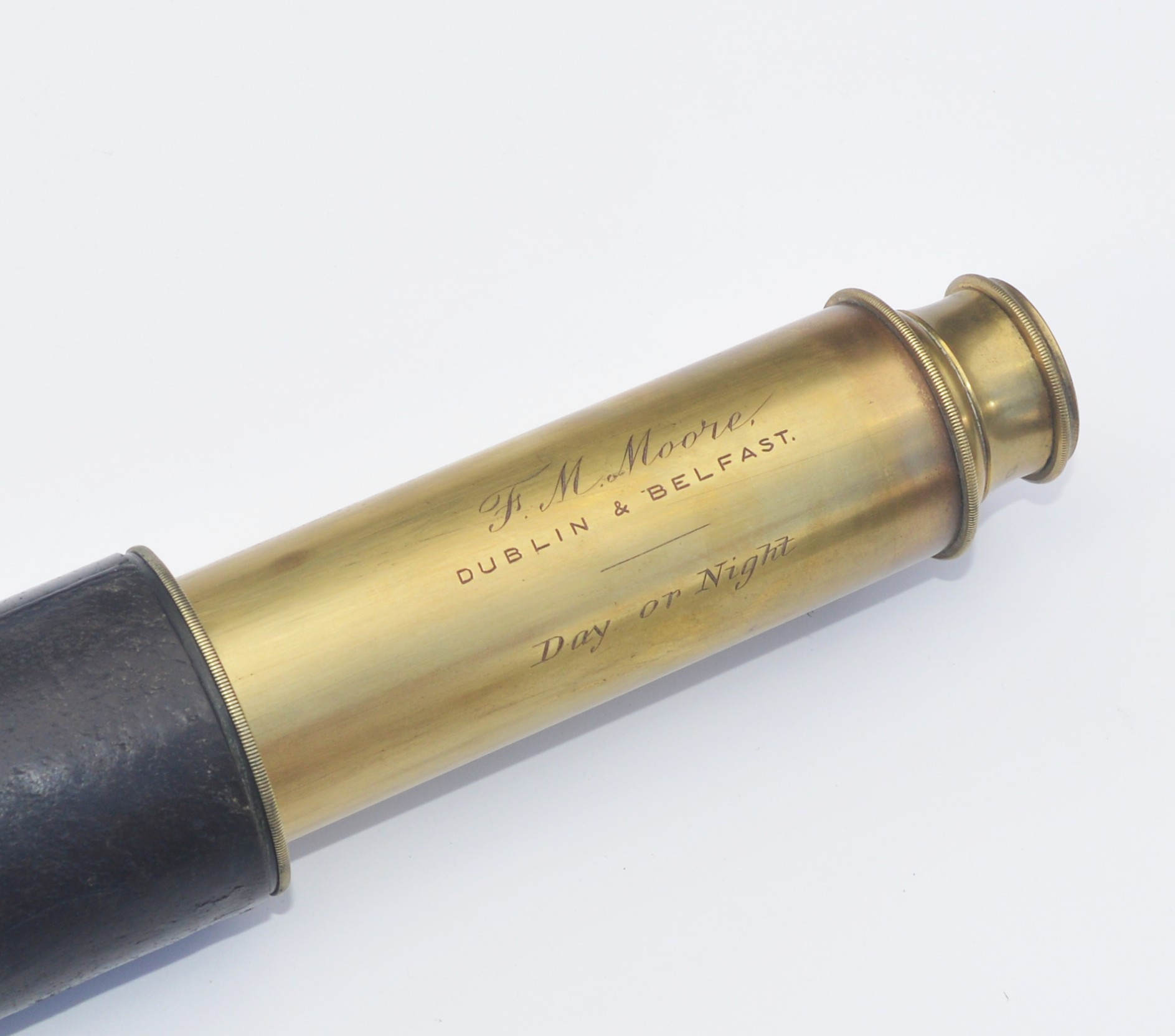 SOLD – A good example of a single draw marine telescope signed, ‘F.M. Moore. Dublin & Belfast. Day or Night’, measuring 20.25 inches long when closed and opening to 35.5 inches with a main lens aperture of 2″, slide covers to both ends, sliding sun visor with intact original leather barrel. All lenses are damage free and the telescope gives a good, clear image when viewed through. Small dent underneath the sun visor, so hidden, otherwise all as good as perfect.