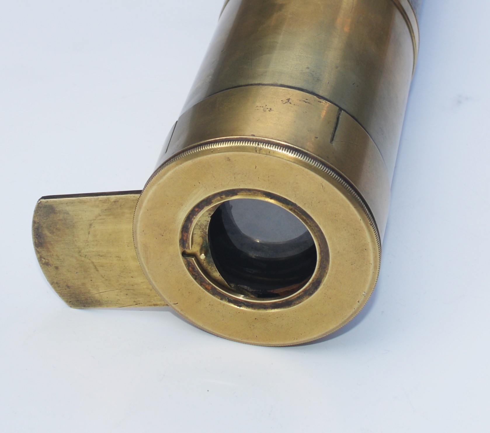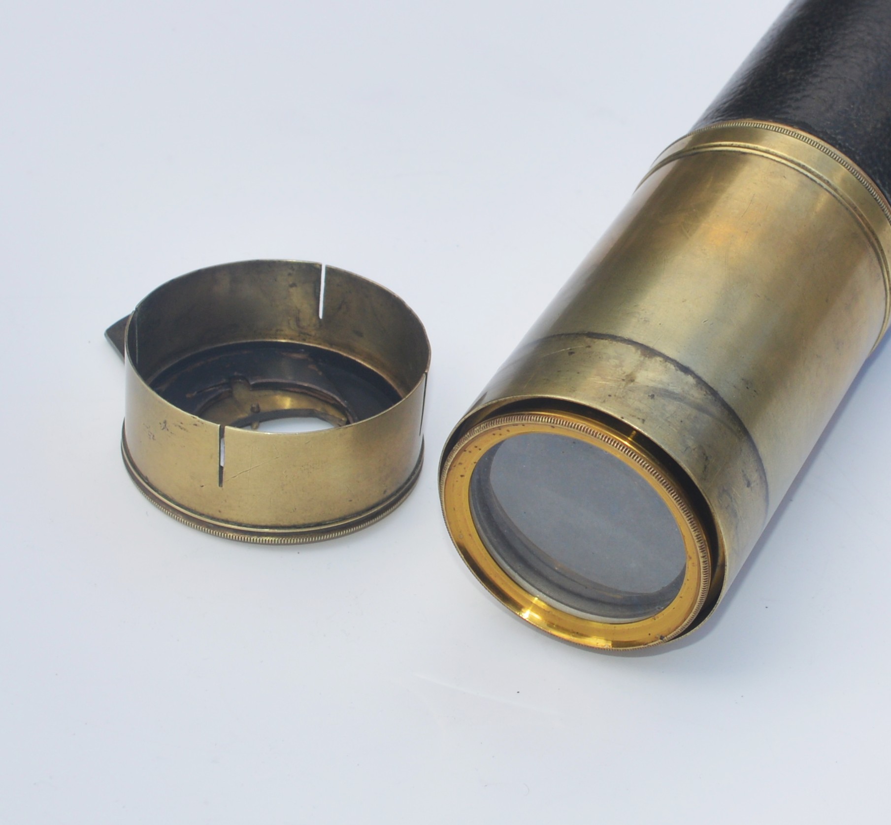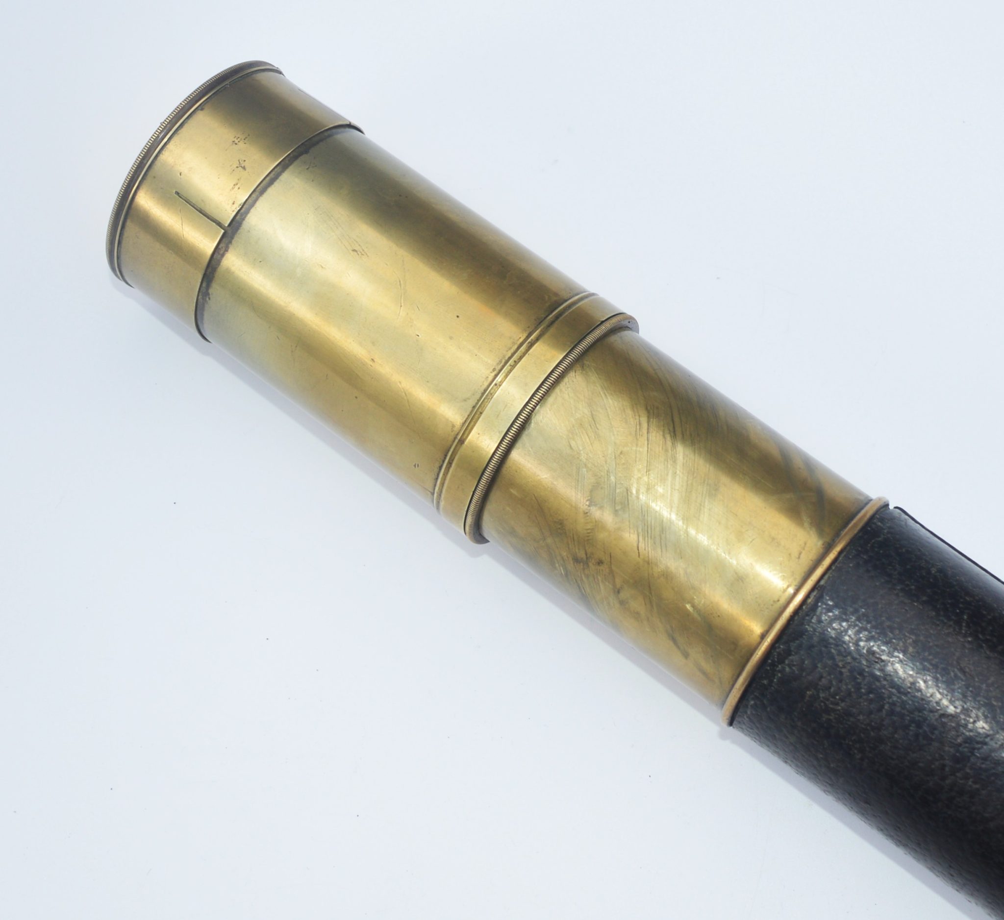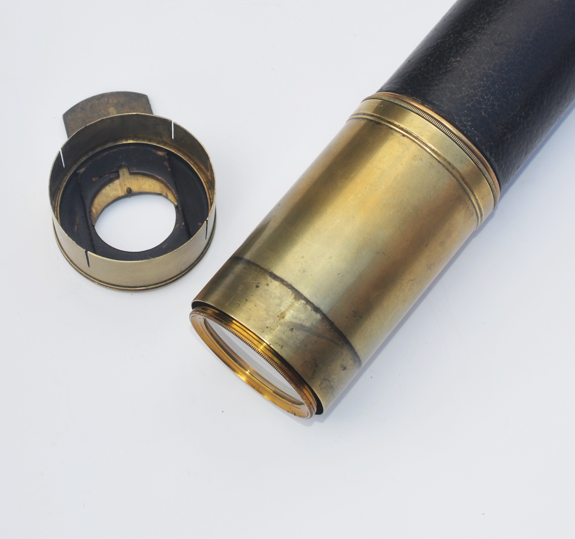 SOLD – A good example of a single draw marine telescope signed, ‘F.M. Moore. Dublin & Belfast. Day or Night’, measuring 20.25 inches long when closed and opening to 35.5 inches with a main lens aperture of 2″, slide covers to both ends, sliding sun visor with intact original leather barrel. All lenses are damage free and the telescope gives a good, clear image when viewed through. Small dent underneath the sun visor, so hidden, otherwise all as good as perfect.