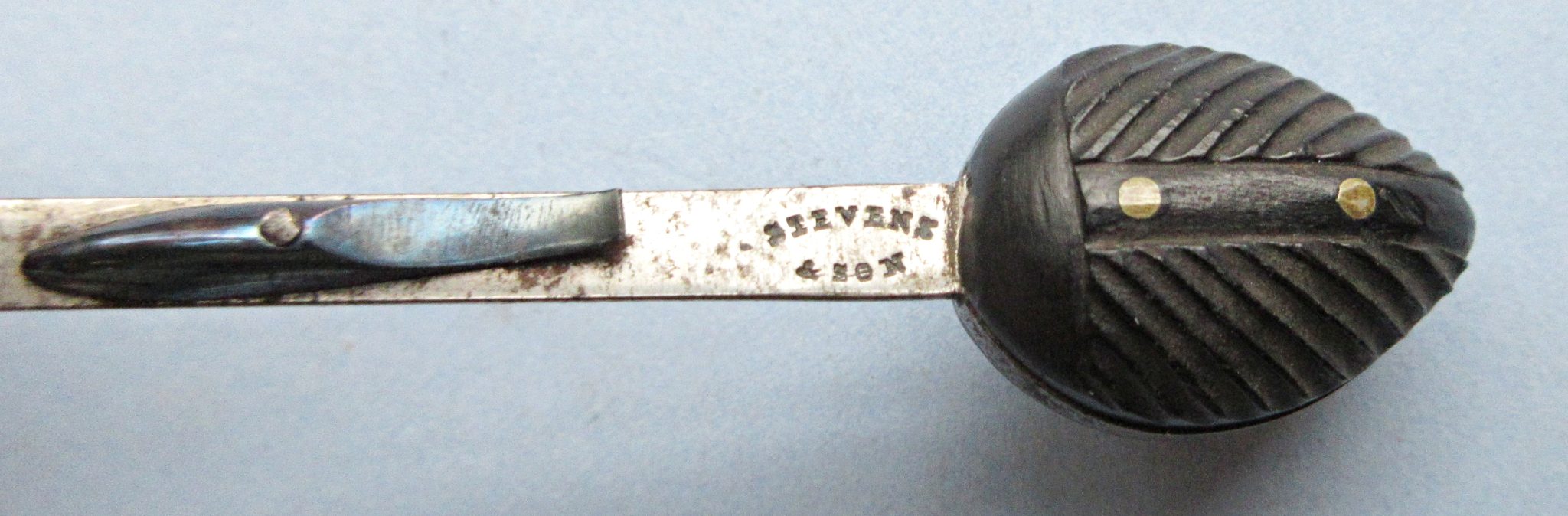 Stevens & Son forceps with an olive-shaped ebony handle. The spring is partially broken and thus the instrument will not lock. $100.00