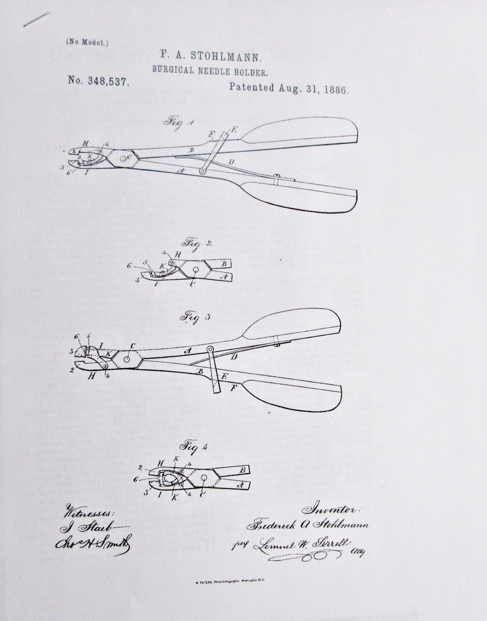 The 1889 Tiemann Armamentarium ( page 4654, fig. 3304) shows this model and describes it as “Tiemann & Co’s New Need;e forceps (adapted for Hagedorn Needles).” However it was patented by F.A. Stohlmann in 1886 , patent number 349,and presumably this patent was subsequently assigned to Tiemann. It is marked :”TIEMANN” and “PATENT APPLIED FOR”, so presumably Tiemann was selling it before Stohlmann received his patent. $295.00