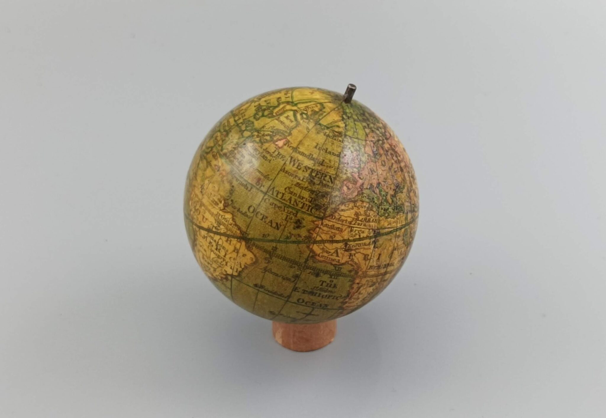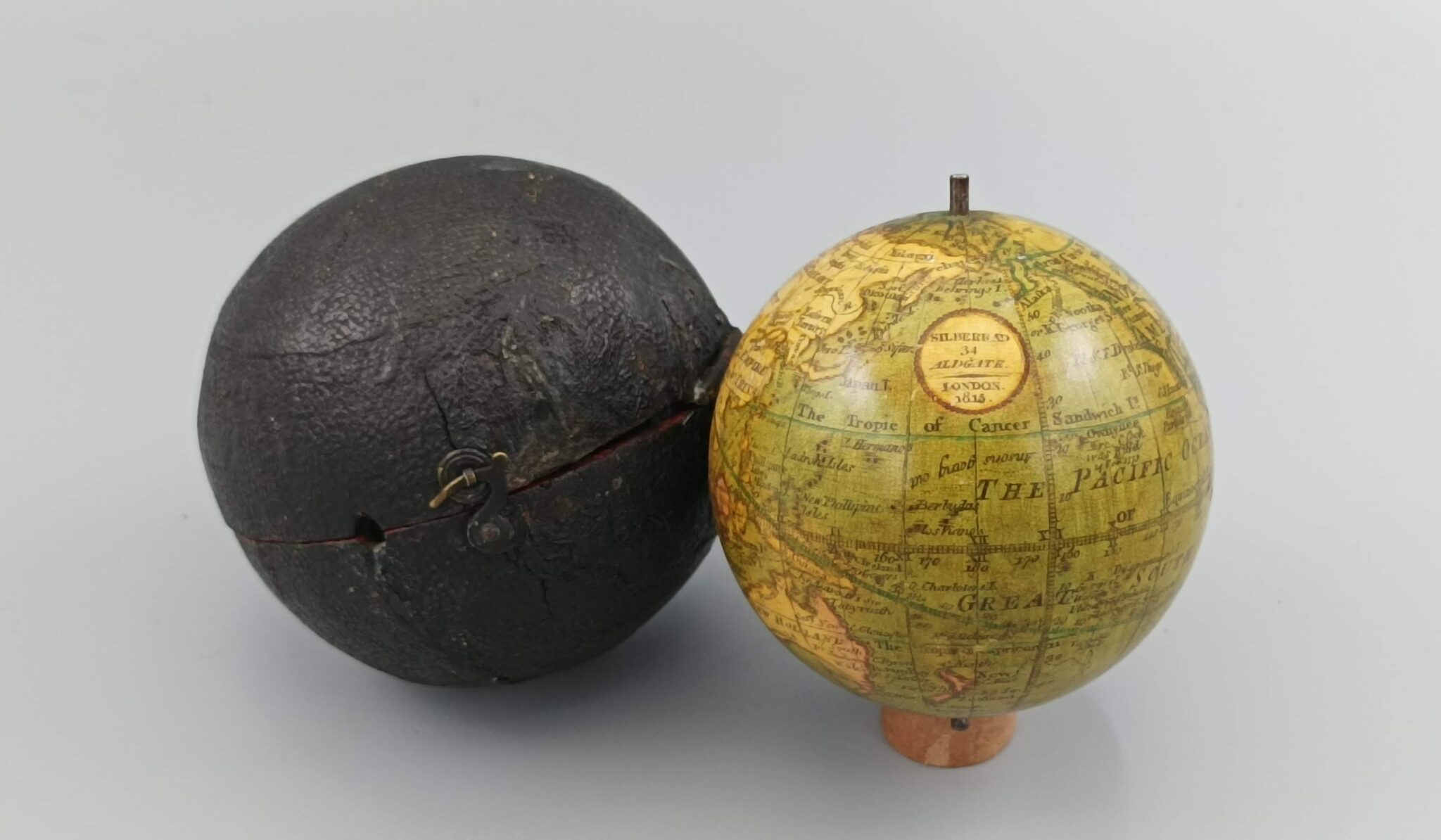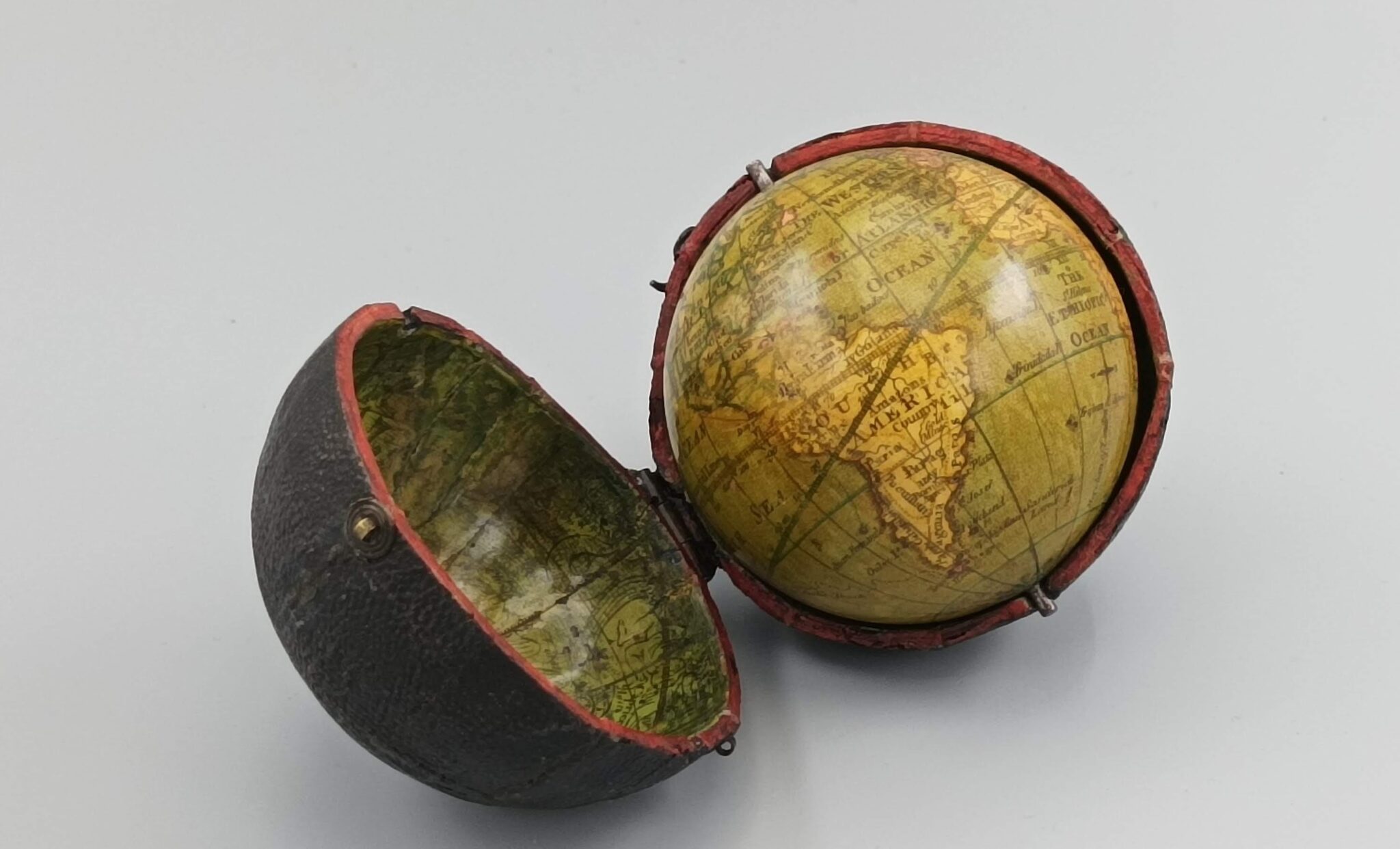 A 2 ¾” (7cm) terrestrial pocket globe made up of twelve hand-coloured engraved gores, the equator graduated in hours twice and degrees, the ecliptic graduated in days with symbols for the houses of the Zodiac, the Meridian of London graduated in degrees, the oceans showing trade winds and Cook’s Track, the continents delicately coloured in green, pink and yellow, no North Canadian coastline, China with Great Wall, South Africa labelled Country of the Hottentots, no Antarctic with steel axis pins[al1] in spherical fishskin-covered case with one hook.
