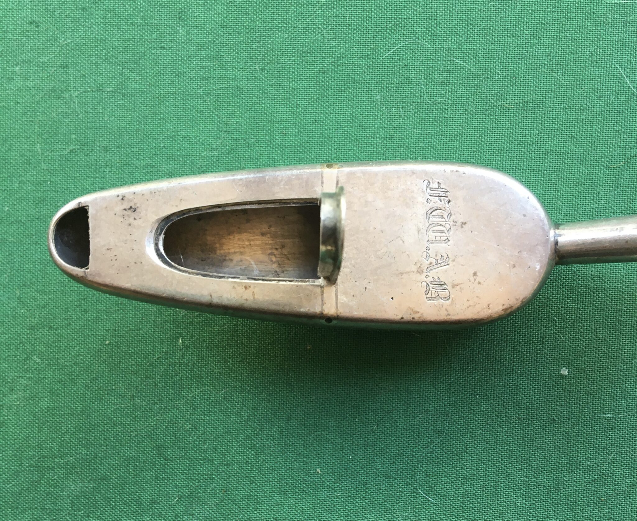 A silver colured metal (tests as Silver but without hall marks) Gibson spoon, in good condition, marked with initials for owner, FWAB