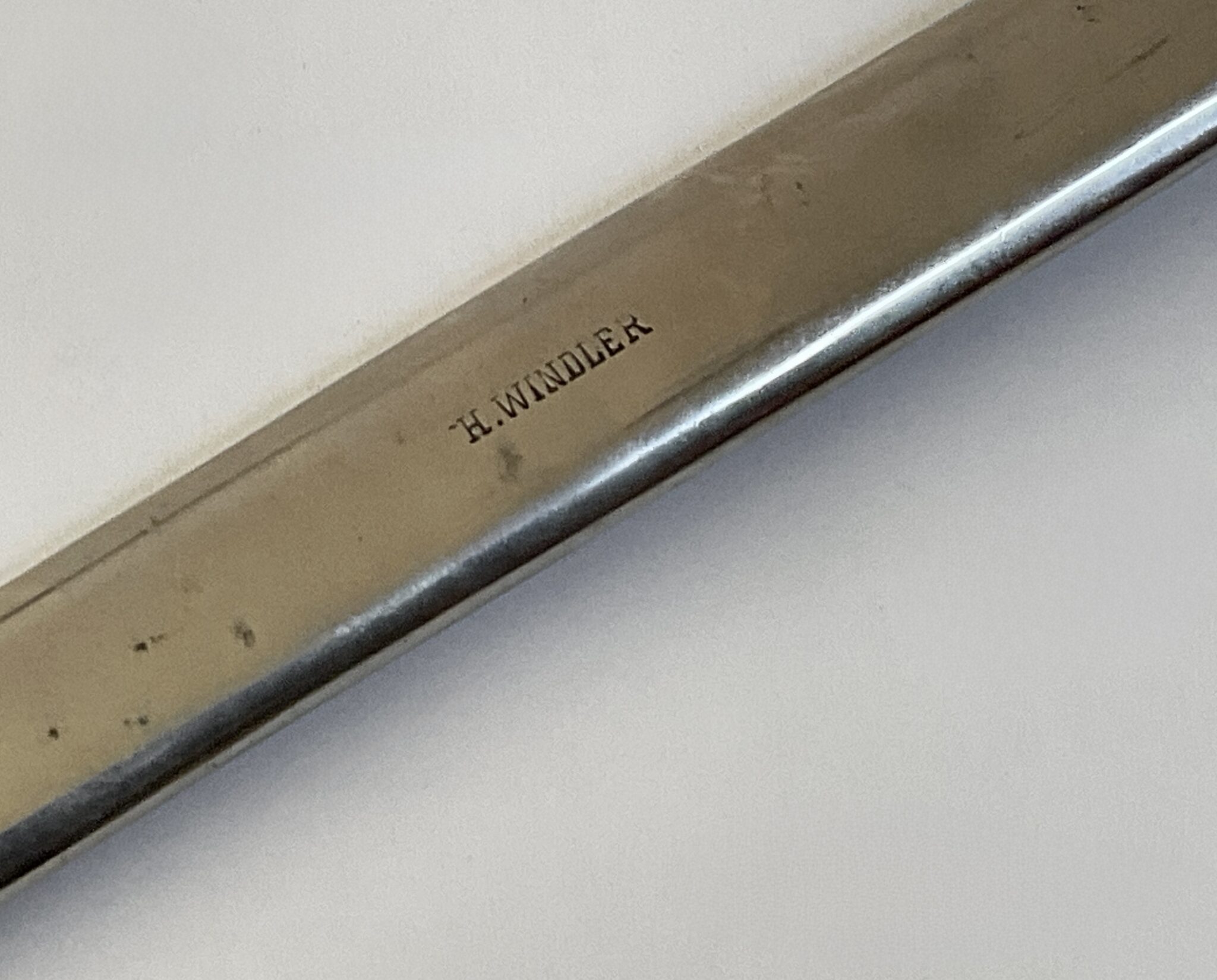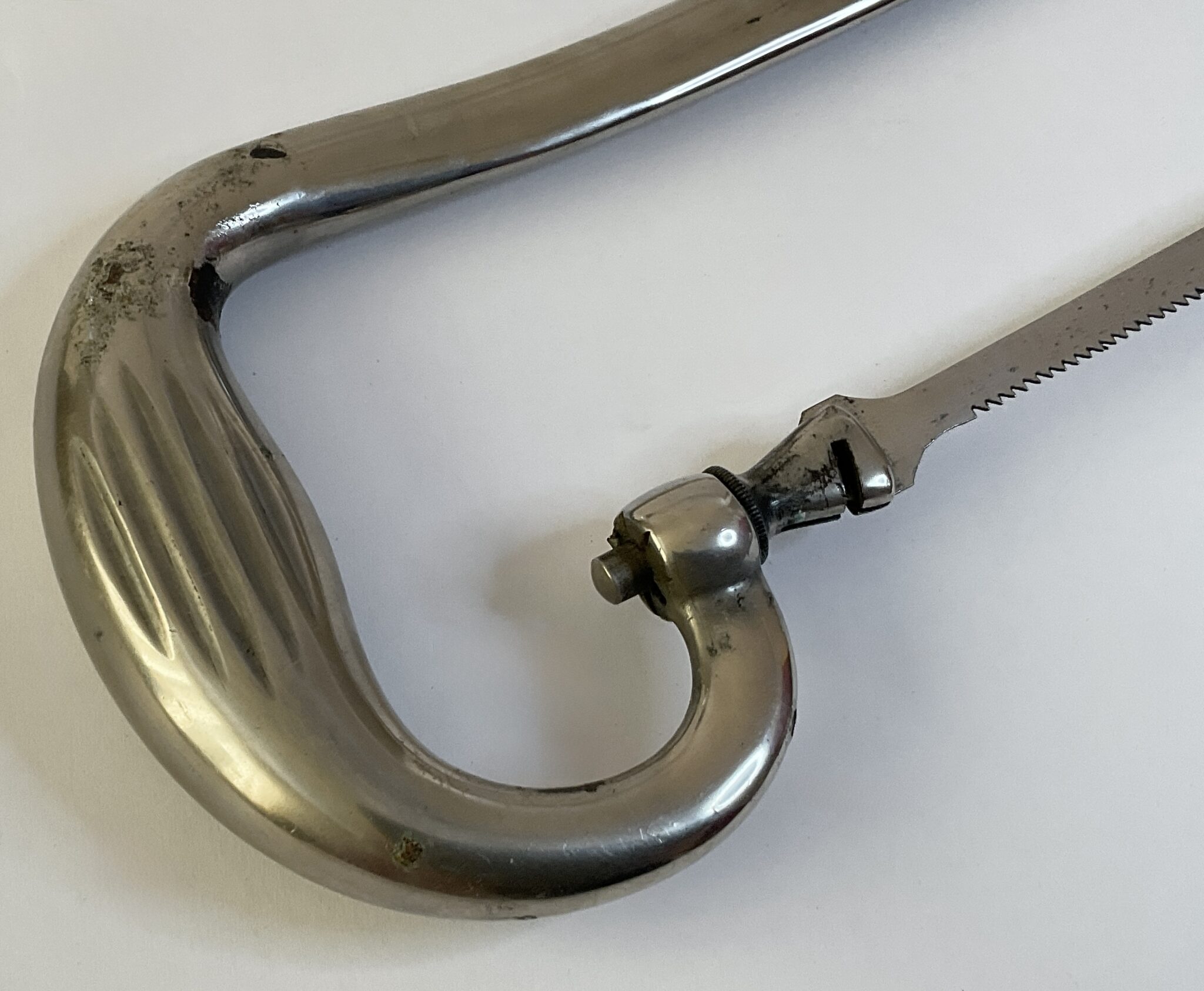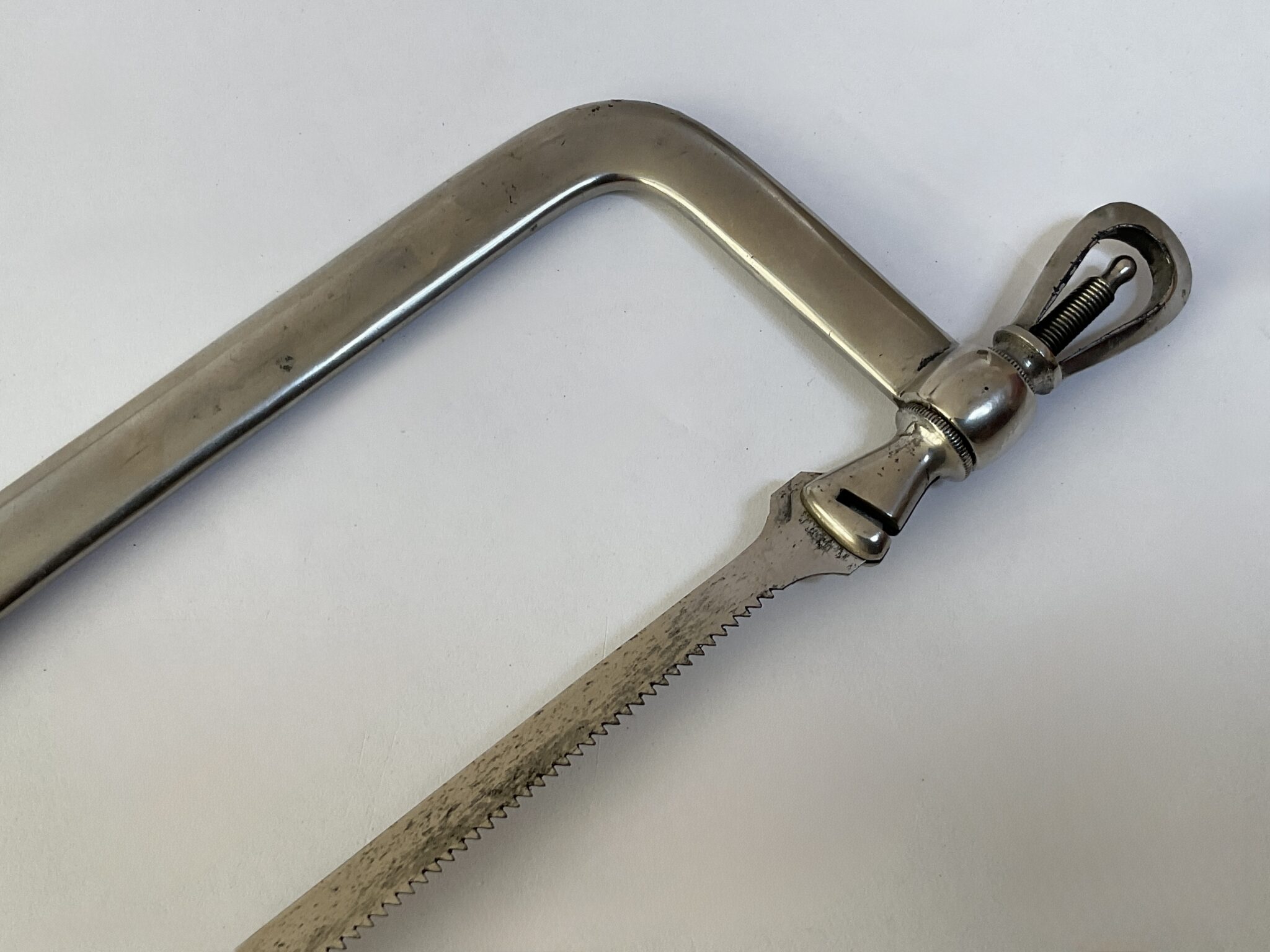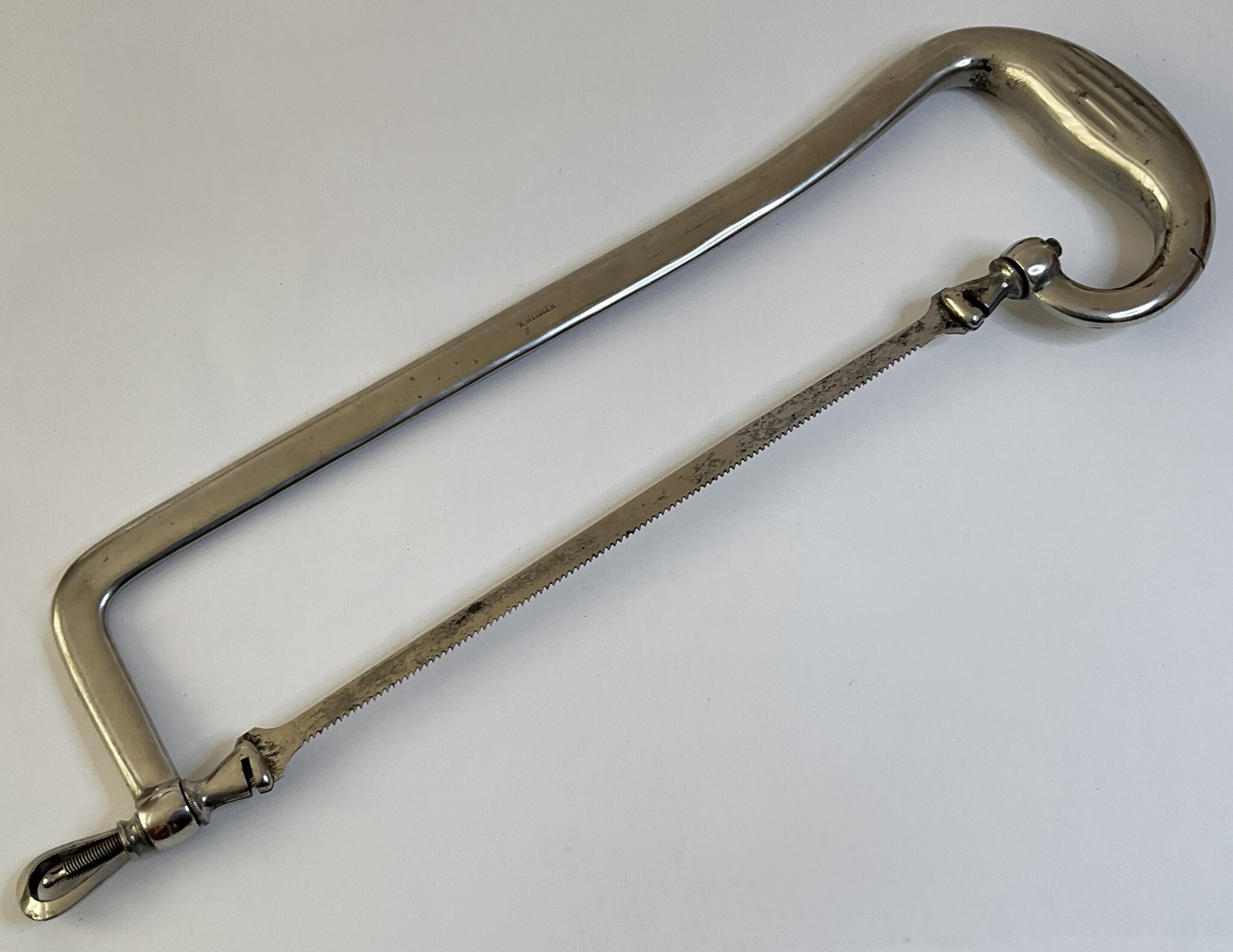 A Charrière amputation saw is by ‘H. Windler’, in good solid condition with small losses to the chrome plating in places, mainly the inside top of the handle. The saw measures 38cm (15″). H. Windler was a German surgical instrument maker active between 1850-1900, based in Berlin known for high quality surgical instruments which were often included in sets and cases.