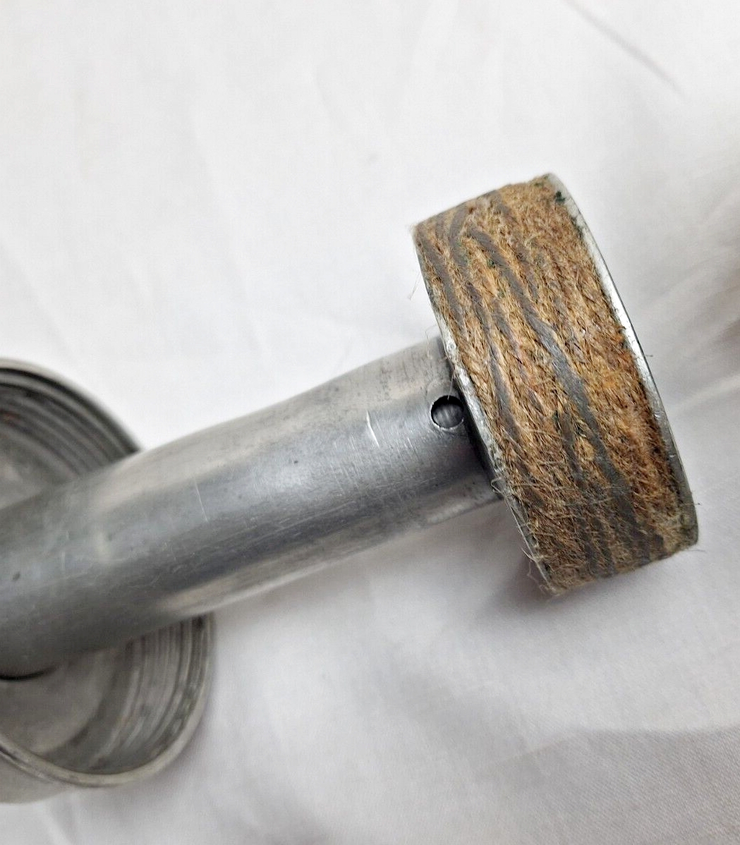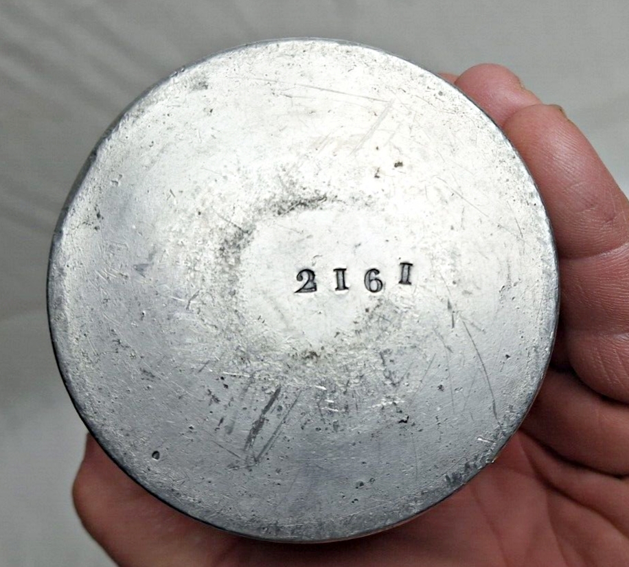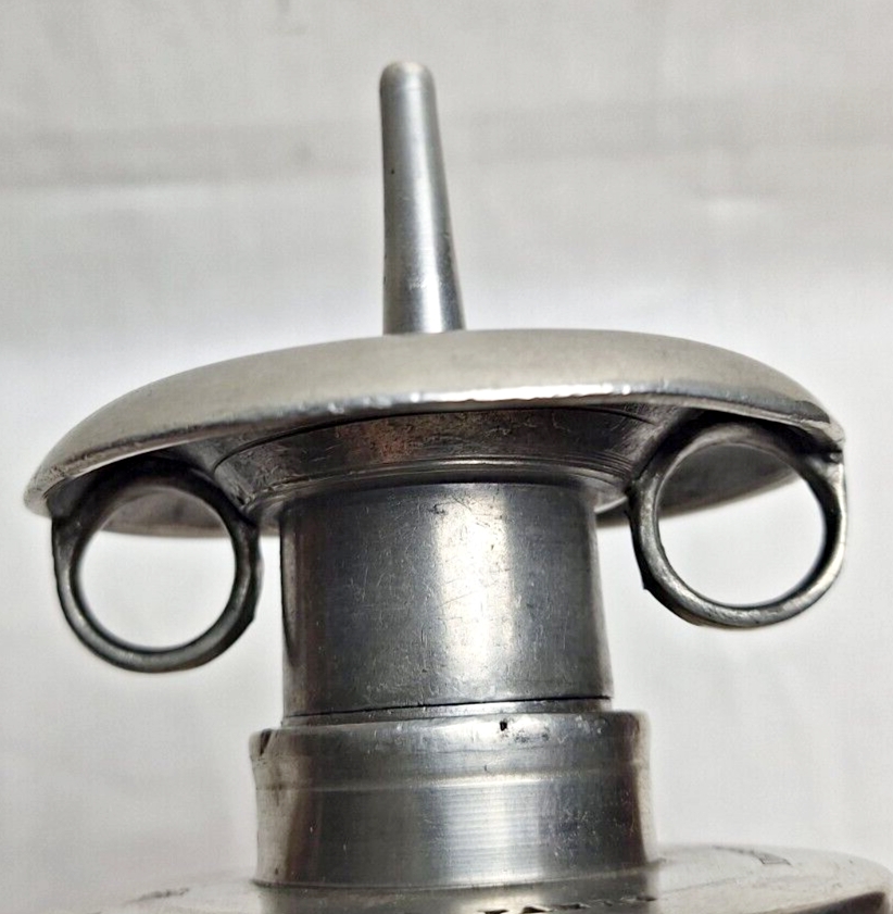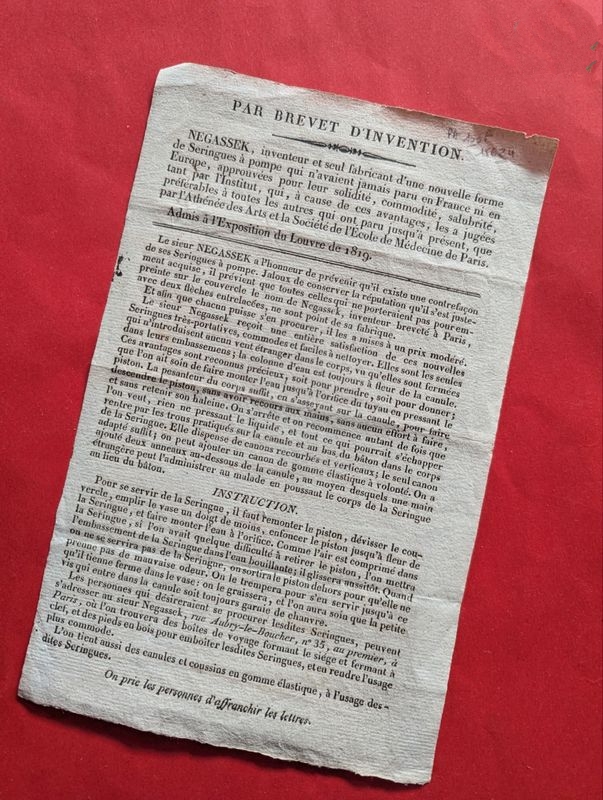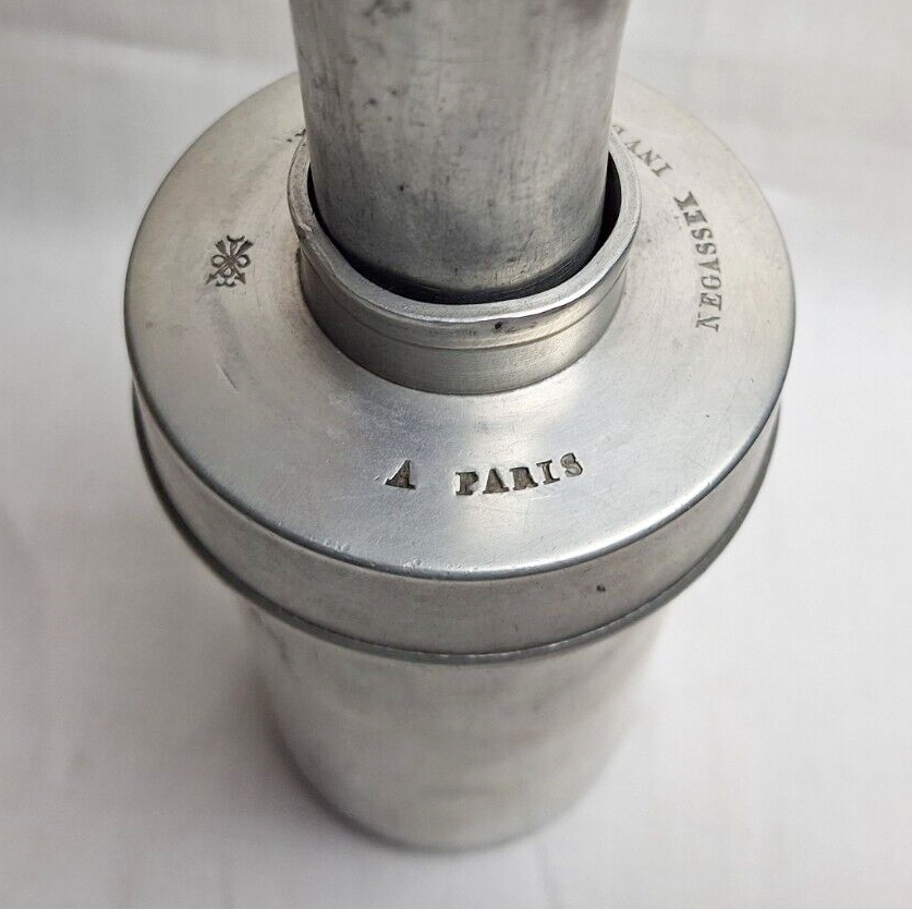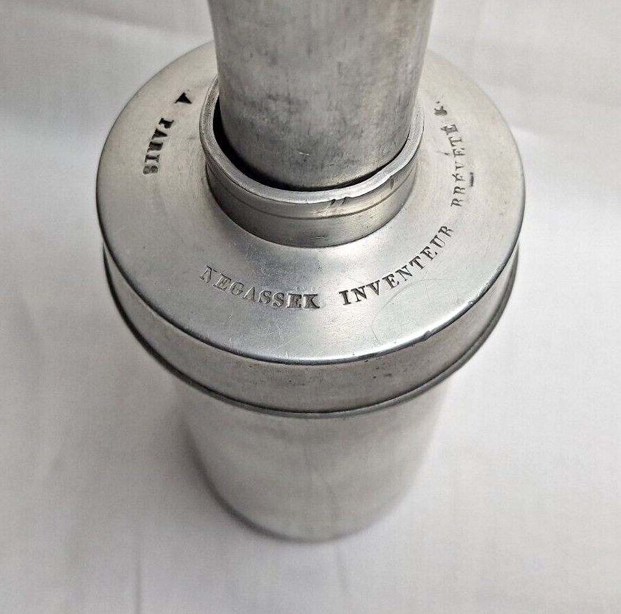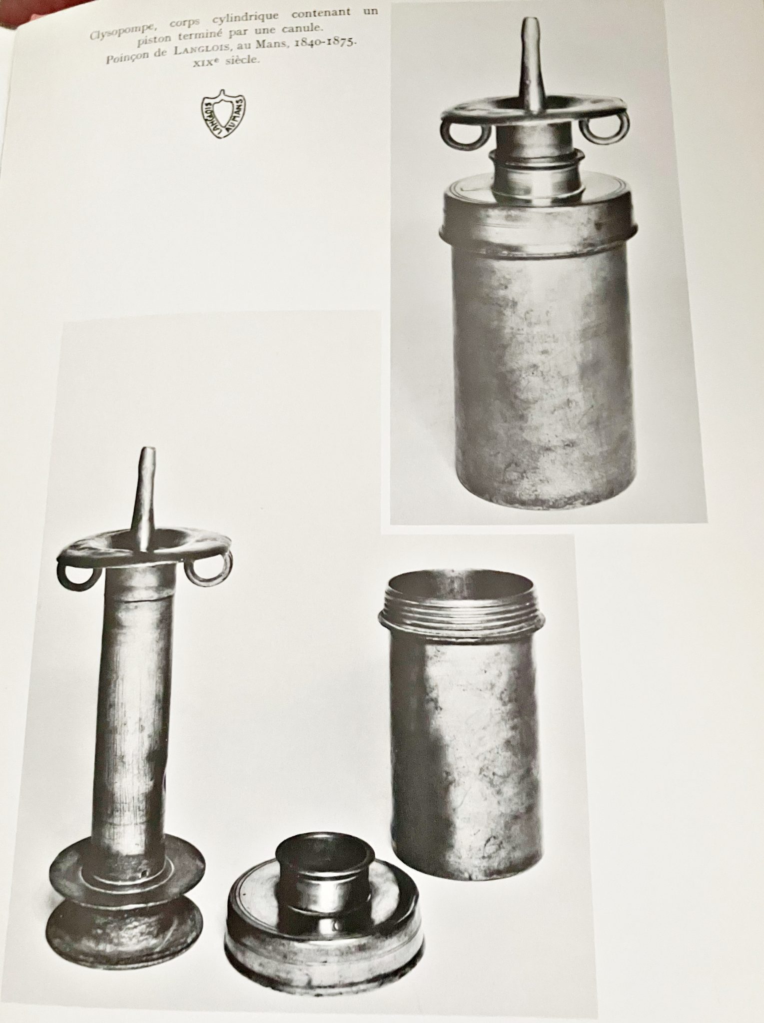An early 19th-century, patented, cylindrical enema with a sit-down mechanism. Height as in first image: 10″ or 25cm.The cap is stamped “NEGASSEK INVENTEUR BREVETE PARIS with his hallmark. A copy of his 1819 patent claim is shown in the last image.After filling the well and raising the flange, the user sits down on the latter, driving the piston into the well and expelling the liquid into the rectum.. A near identical device is shown in Bidaux & Lepart’s Étains Médicaux et Pharmaceutiques (N.D., c1960: p. 83)–see 7th image.