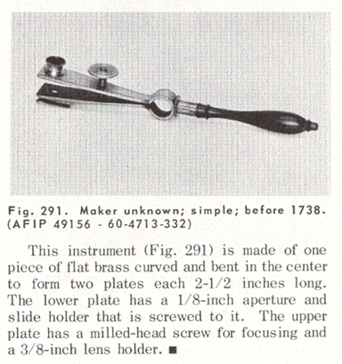 This instrument is made of one piece flat brass curved and bent in the center to form two plate each 2-1/2 inches long. The lower plate has a 1/8 inch aperture and slide holder that is screwed to it. The upper plate has a milled-head screw for focusing and a 3/8-inch lens holder.”