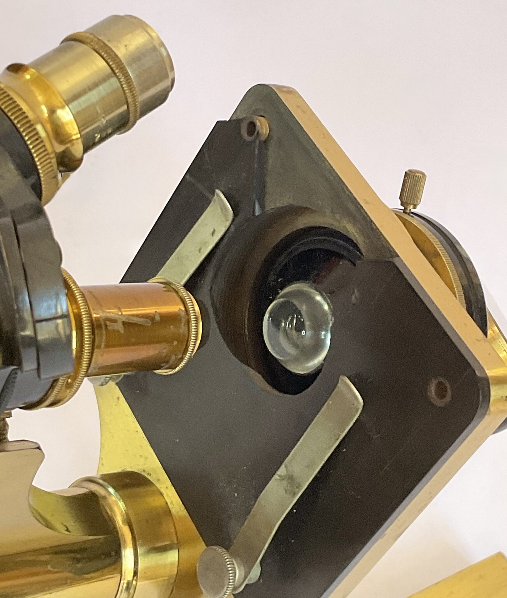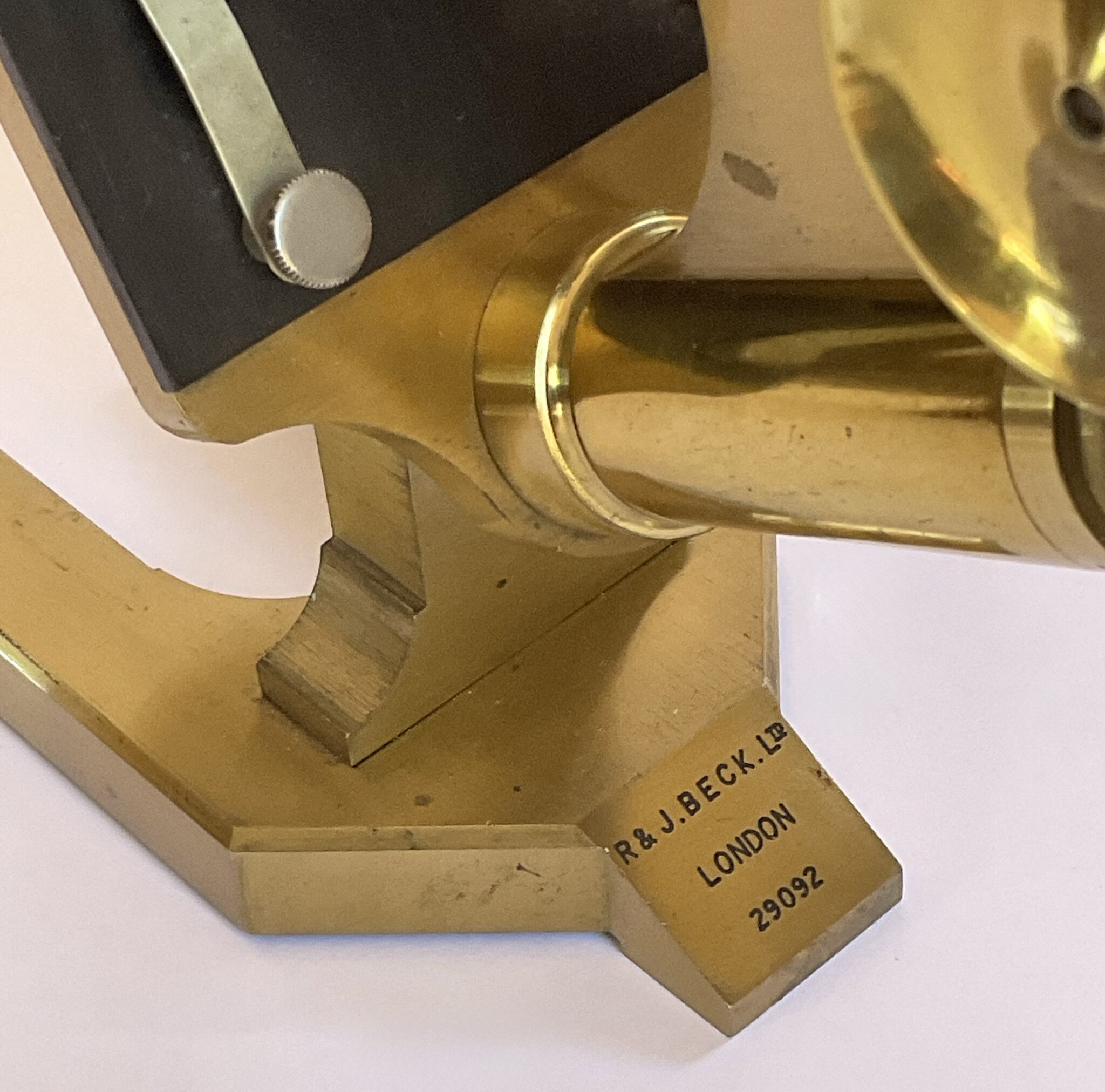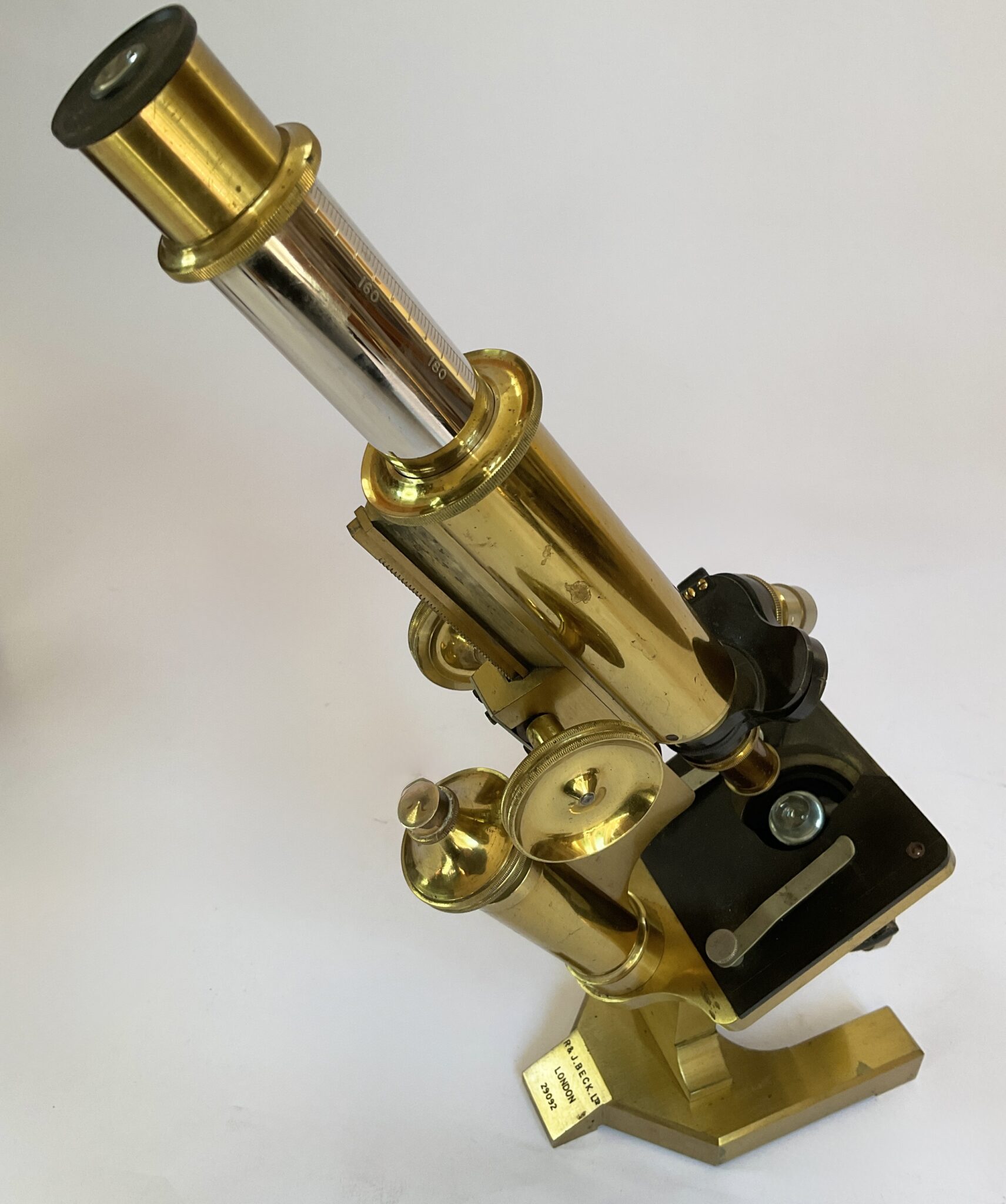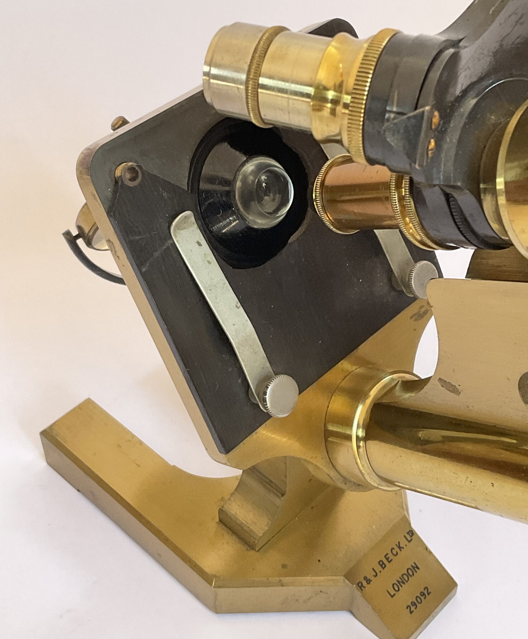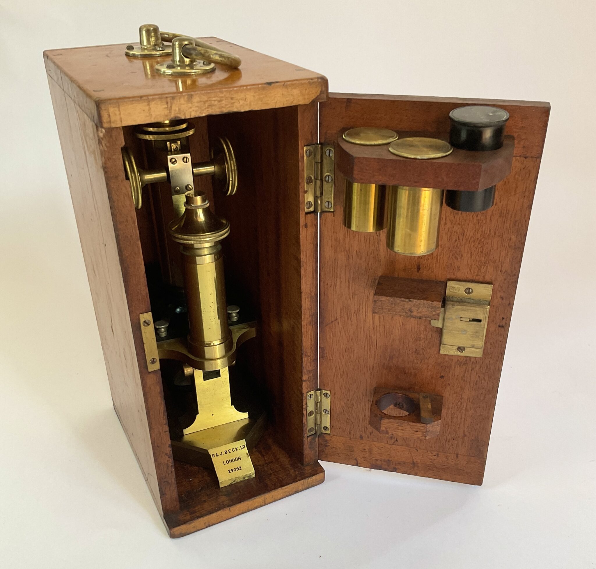 An antique cased brass microscope by R & J Beck Ltd (London) with the number 29092 and with three objectives in metal cases. A really nice example of precision engineering in working order. There is a break to the front of the slide plate, otherwise in good order. This is a compound microscope made from lacquered brass with a continental horseshoe base which is solid brass. The substage double-sided mirror is attached via a gimbal arm to a swinging tailpiece that is connected to the pillar. The square, mechanical stage is painted black and has two metal clips to secure a specimen. There are two holes on both corners of the stage in which accessories such as stage forceps can be attached. The coarse focusing functions via a rack and pinion mechanism which moves the body tube closer or further away from the stage. The fine focusing mechanism is controlled by a thumbscrew located at the top of the pillar. The case has a key which fits but does not operate the lock. This microscope dates from around 1900.