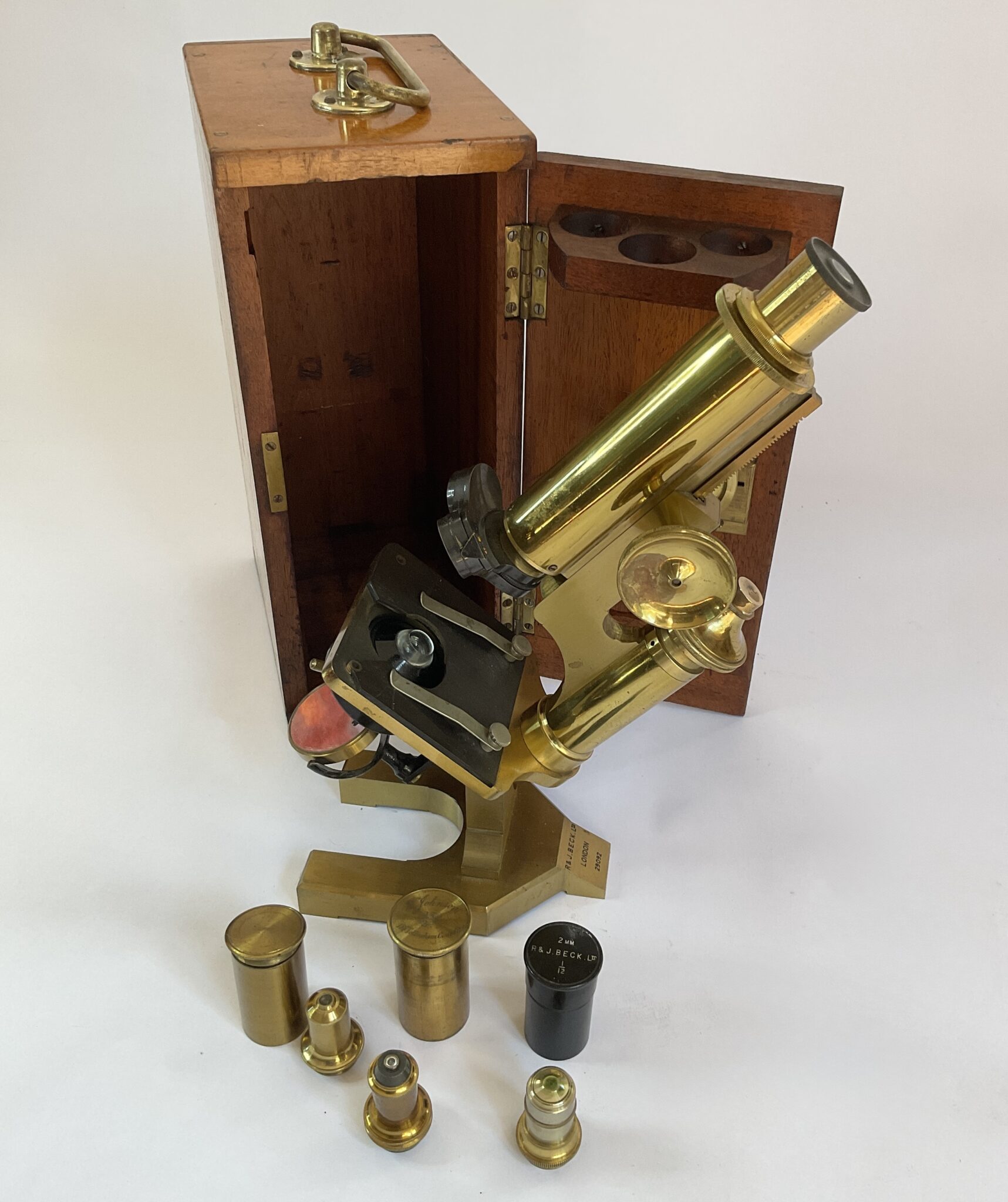 An antique cased brass microscope by R & J Beck Ltd (London) with the number 29092 and with three objectives in metal cases. A really nice example of precision engineering in working order.