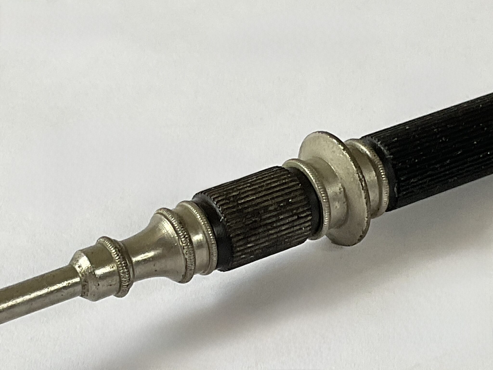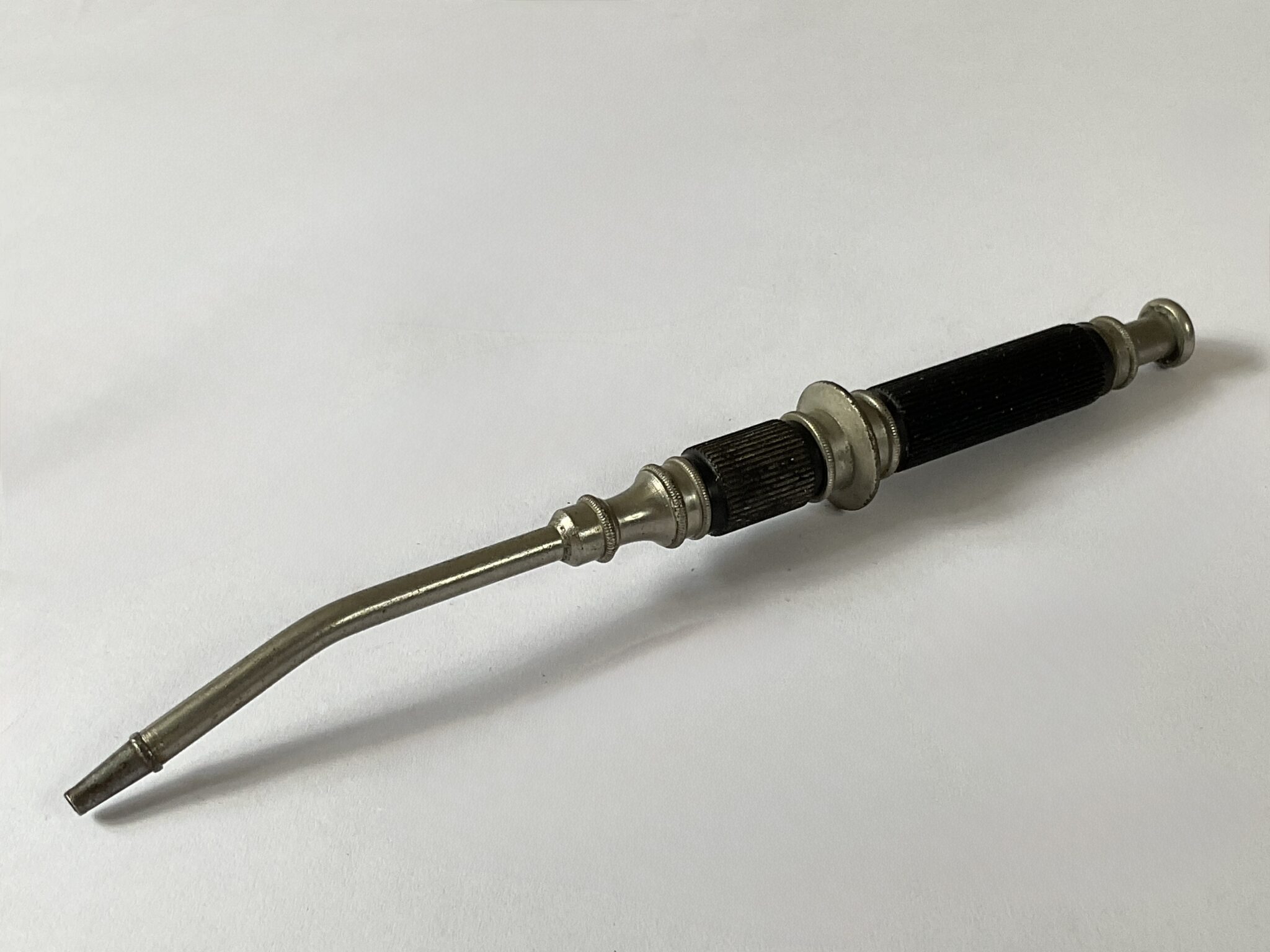 An antique dental amalgam carrier dating from the late 19th century, characterised by its elaborate knurled handle design and precision construction typical of the era when amalgam fillings became the standard dental restoration material. At this time amalgam carriers were essential tools in every dental practice. This instrument was used to pick up, transport, and precisely place amalgam (mercury-silver alloy) filling material into prepared tooth cavities. The robust construction was designed for daily professional use and repeated sterilisation. This example was made by Claudius Ash & Sons, the makers mark being stamped on the top.