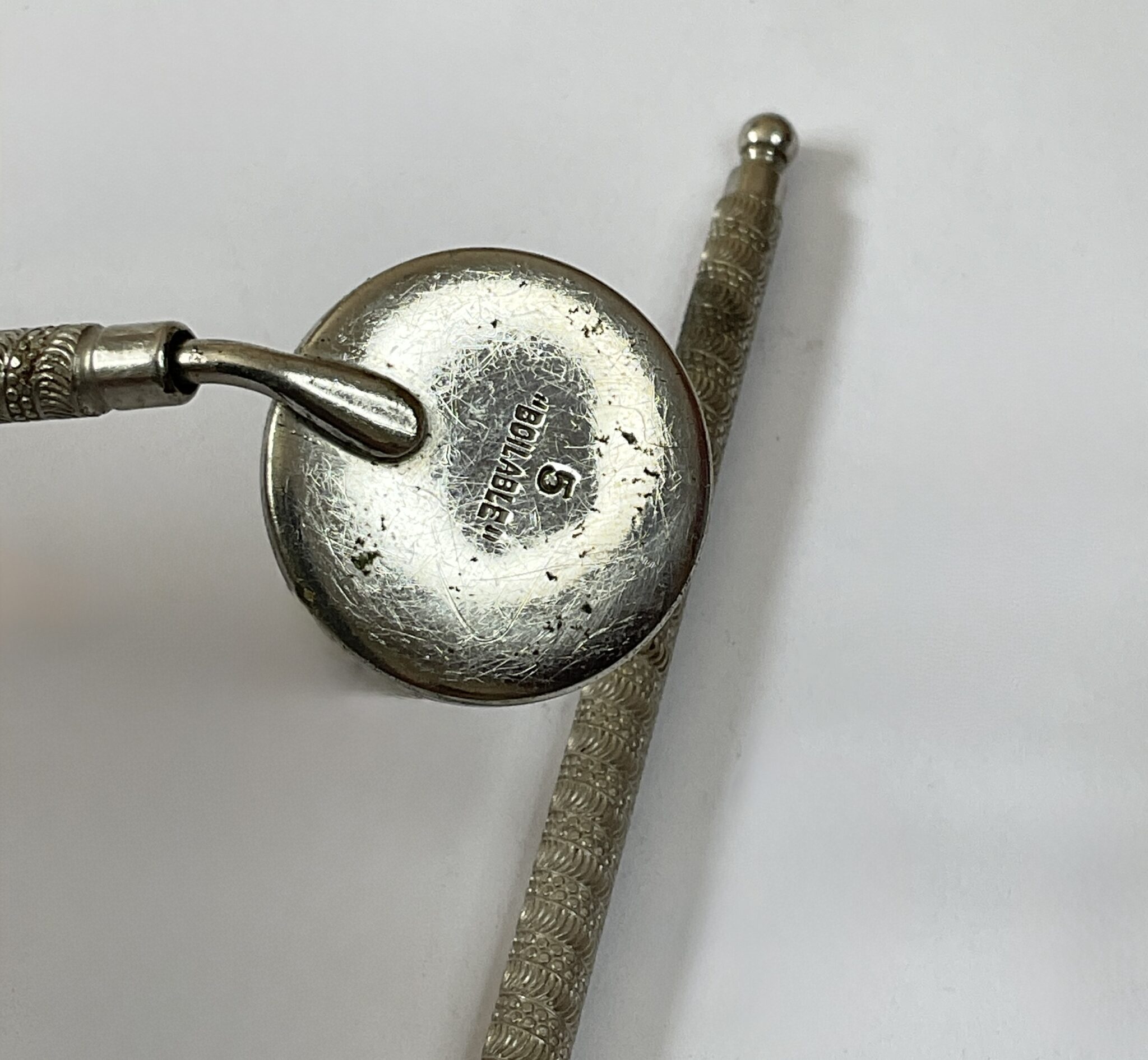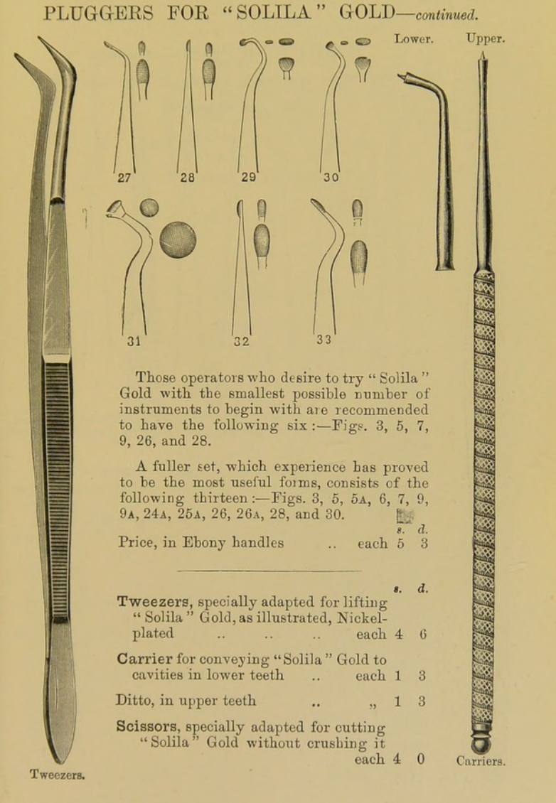 Two antique dental tools dating from 1870, a mirror and matching probe, the probe is marked ‘Ash Eng’ for Claudius Ash & Sons, the reverse of the mirror is marked ‘5 Boilable’ indicating that these would have been made at a time when the importance of sterilisation was beginning to be recognised. The catalogue page has been taken from the Claudius Ash catalogue for 1871, the distinctive handle style can be clearly seen. The two items measures 14 and 15.5cm in length respectively, some light scratches to the mirror, otherwise both in good order.