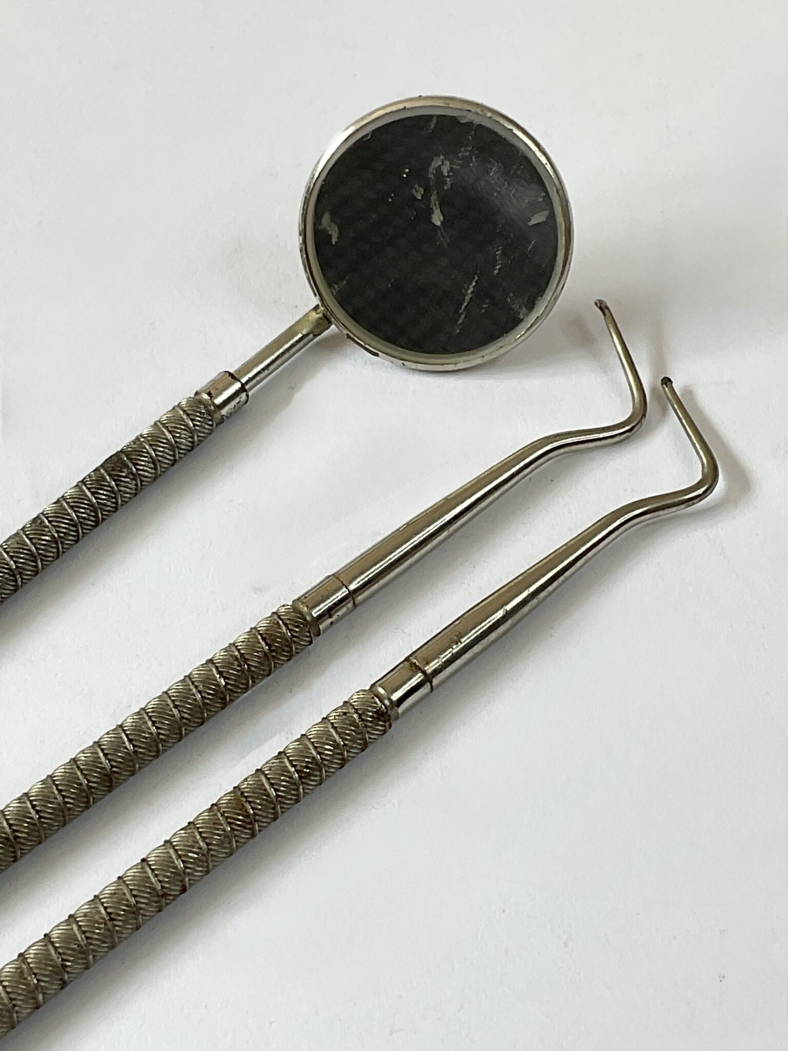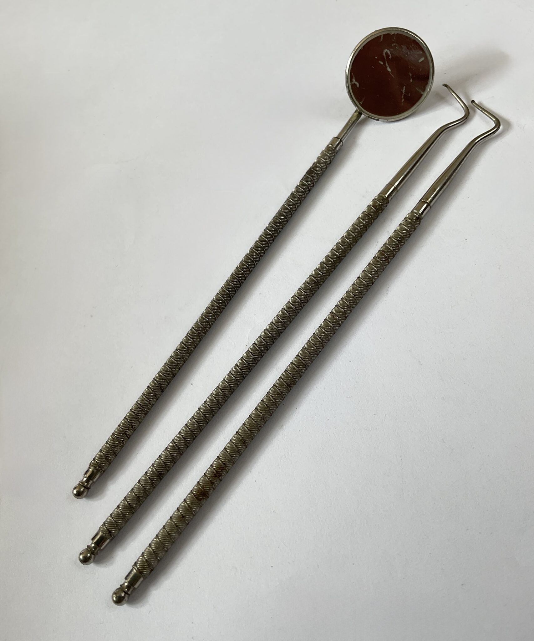 Three antique dental tools dating from 1870, a mirror and matching probes, the probes are marked 'DMC' for the Dental Manufacturing Company
