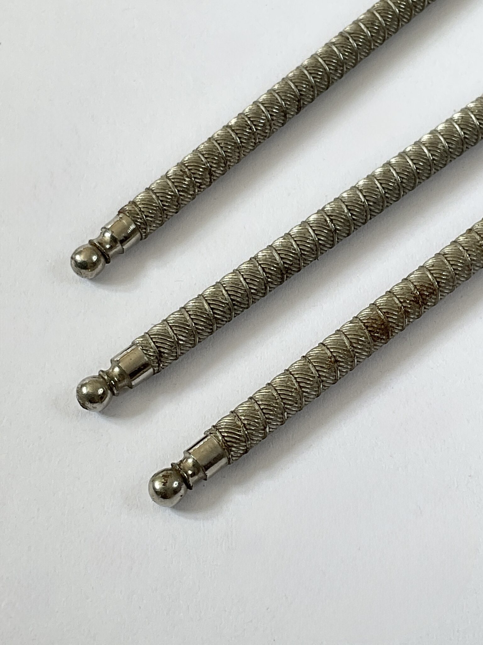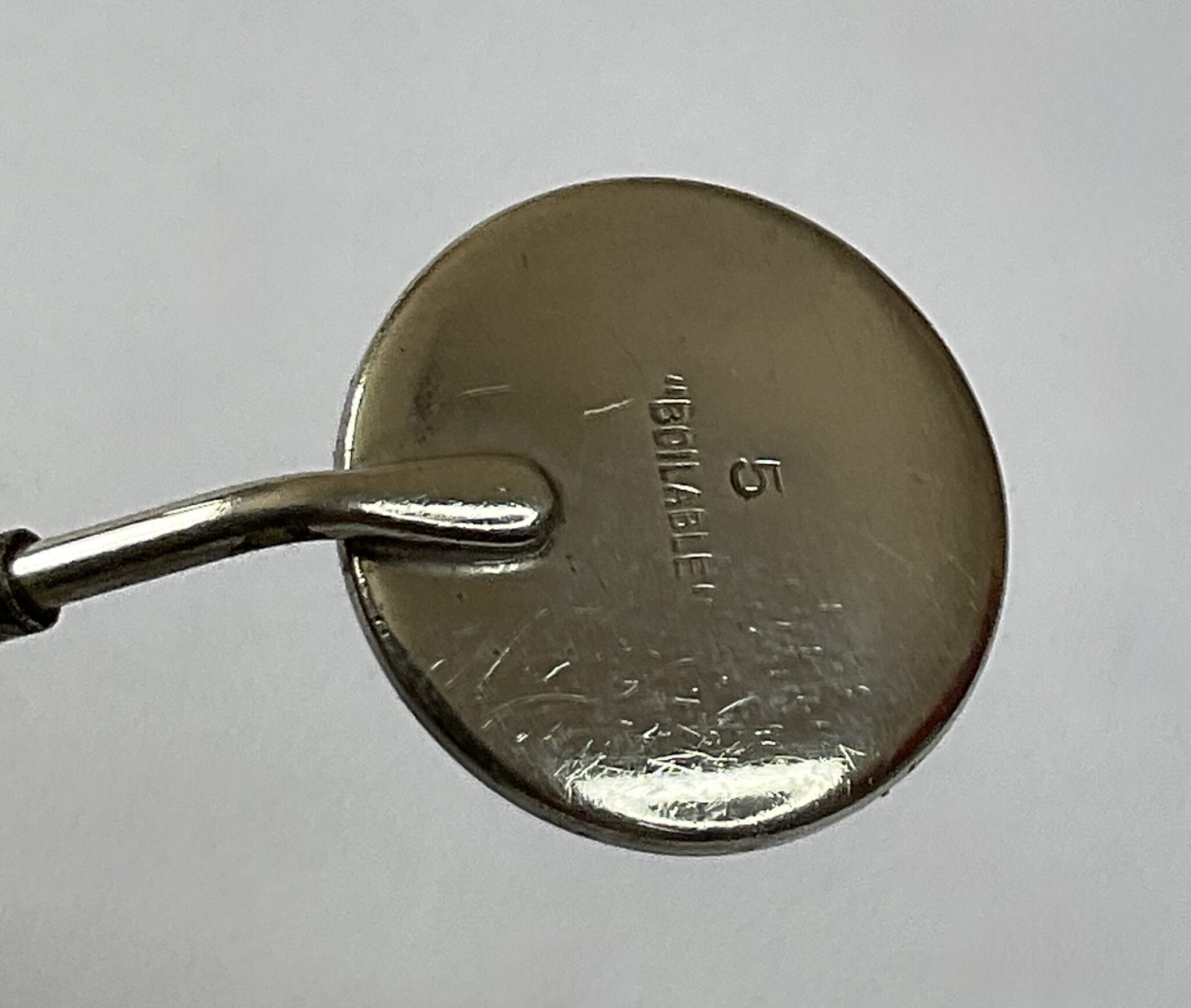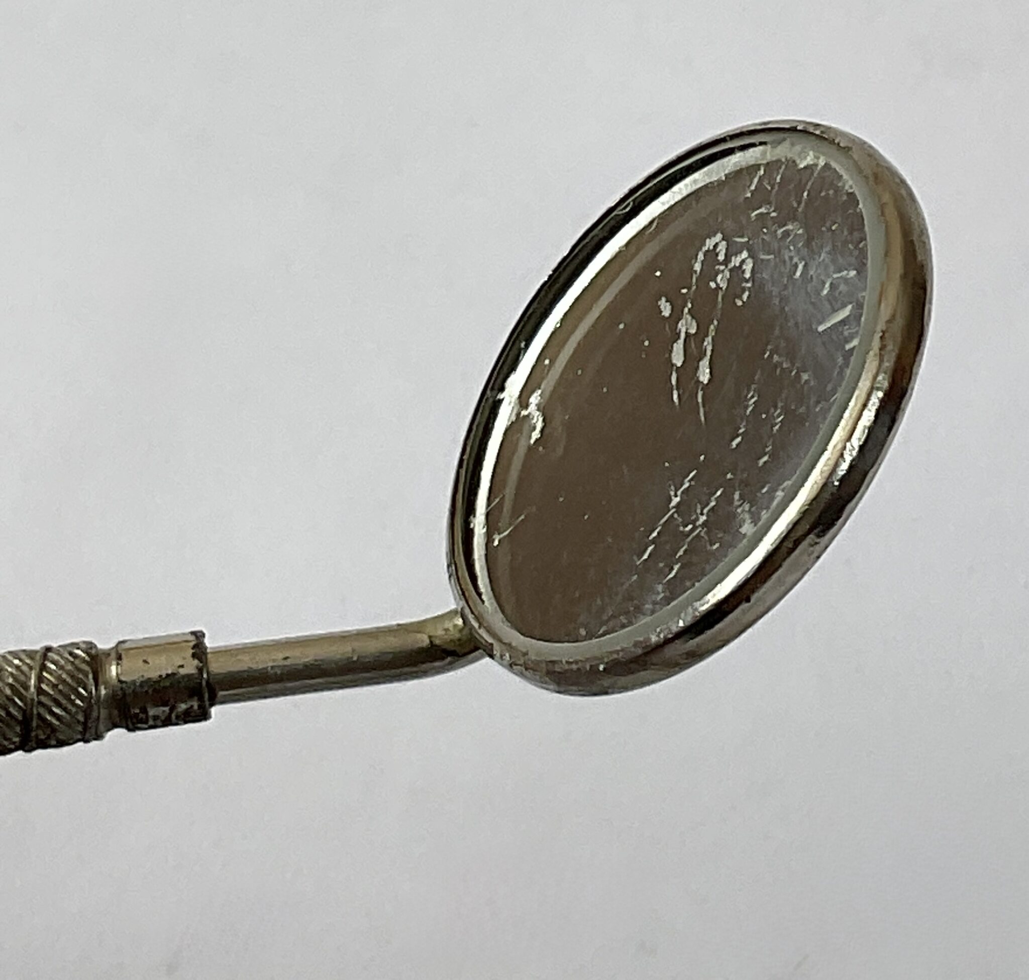 Three antique dental tools dating from 1870, a mirror and matching probes, the probes are marked ‘DMC’ for the Dental Manufacturing Company the reverse of the mirror is marked ‘5 Boilable’ indicating that these would have been made at a time when the importance of sterilisation was beginning to be recognised. The catalogue page for similar items has been taken from a late 19th century catalogue. The three items measure 16 and 15cm in length respectively, some light scratches to the mirror, otherwise all three in good order.