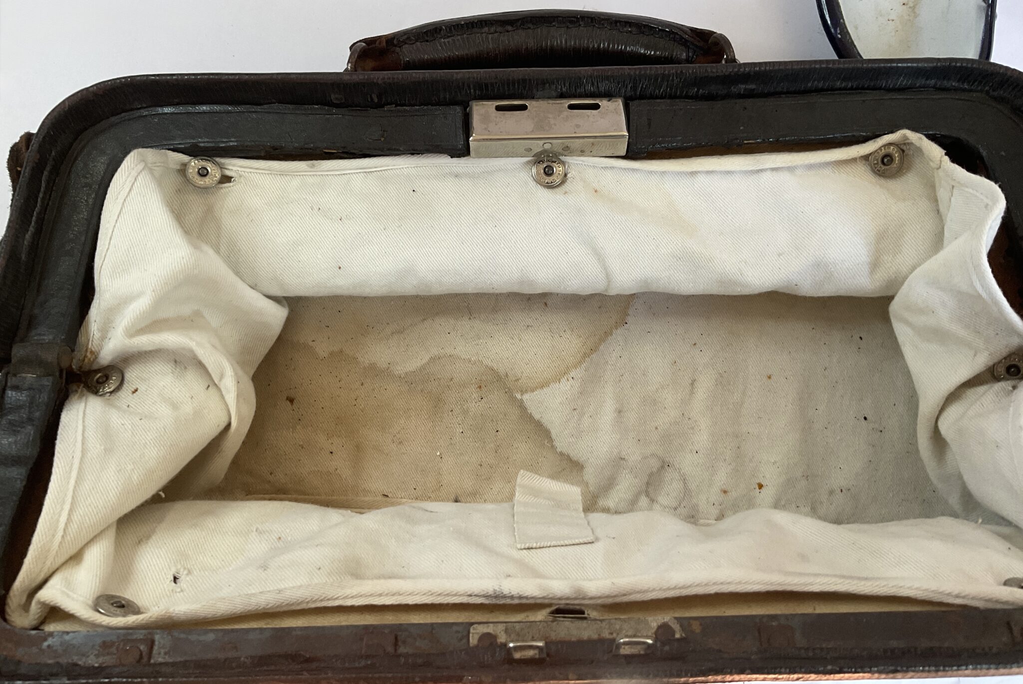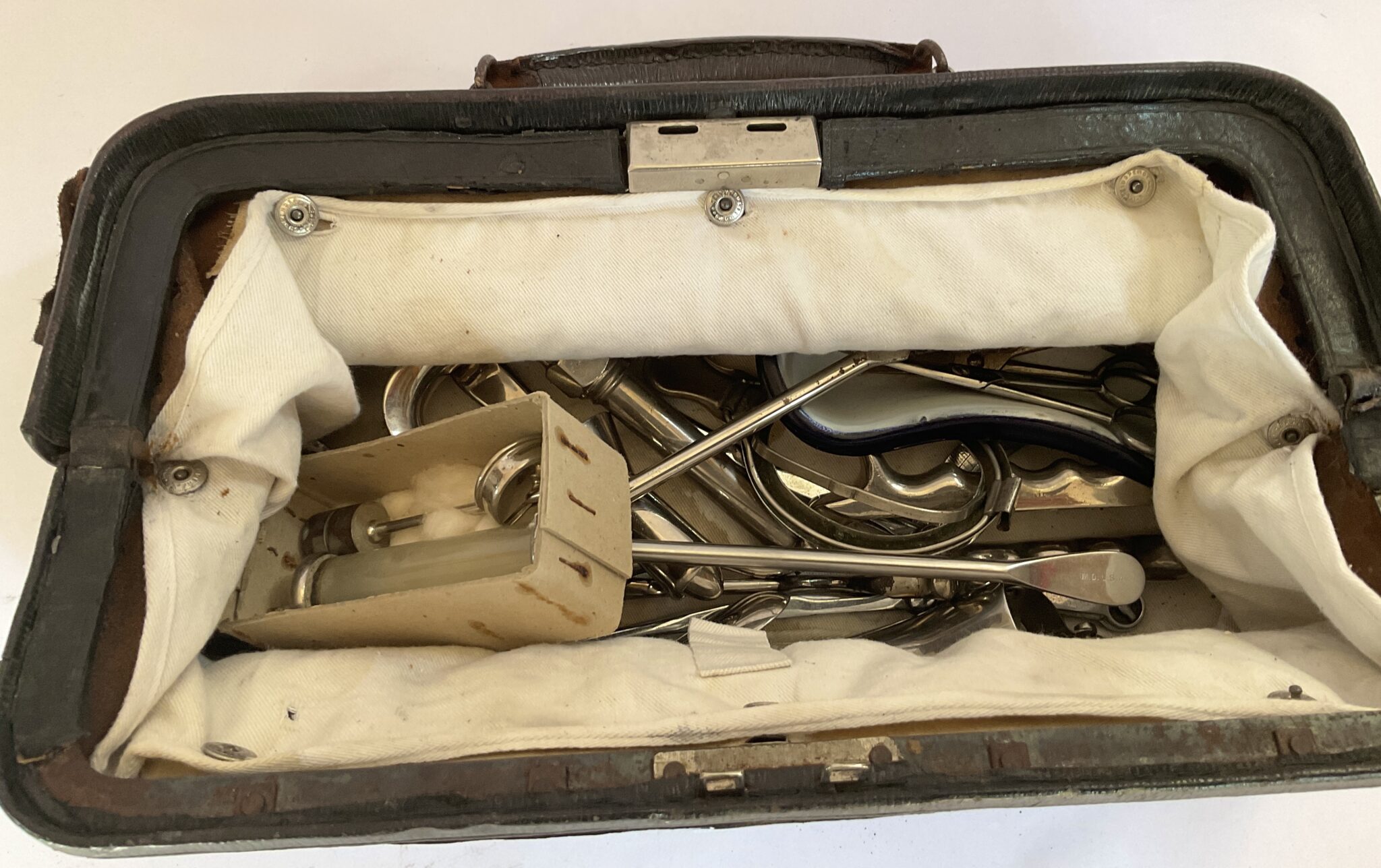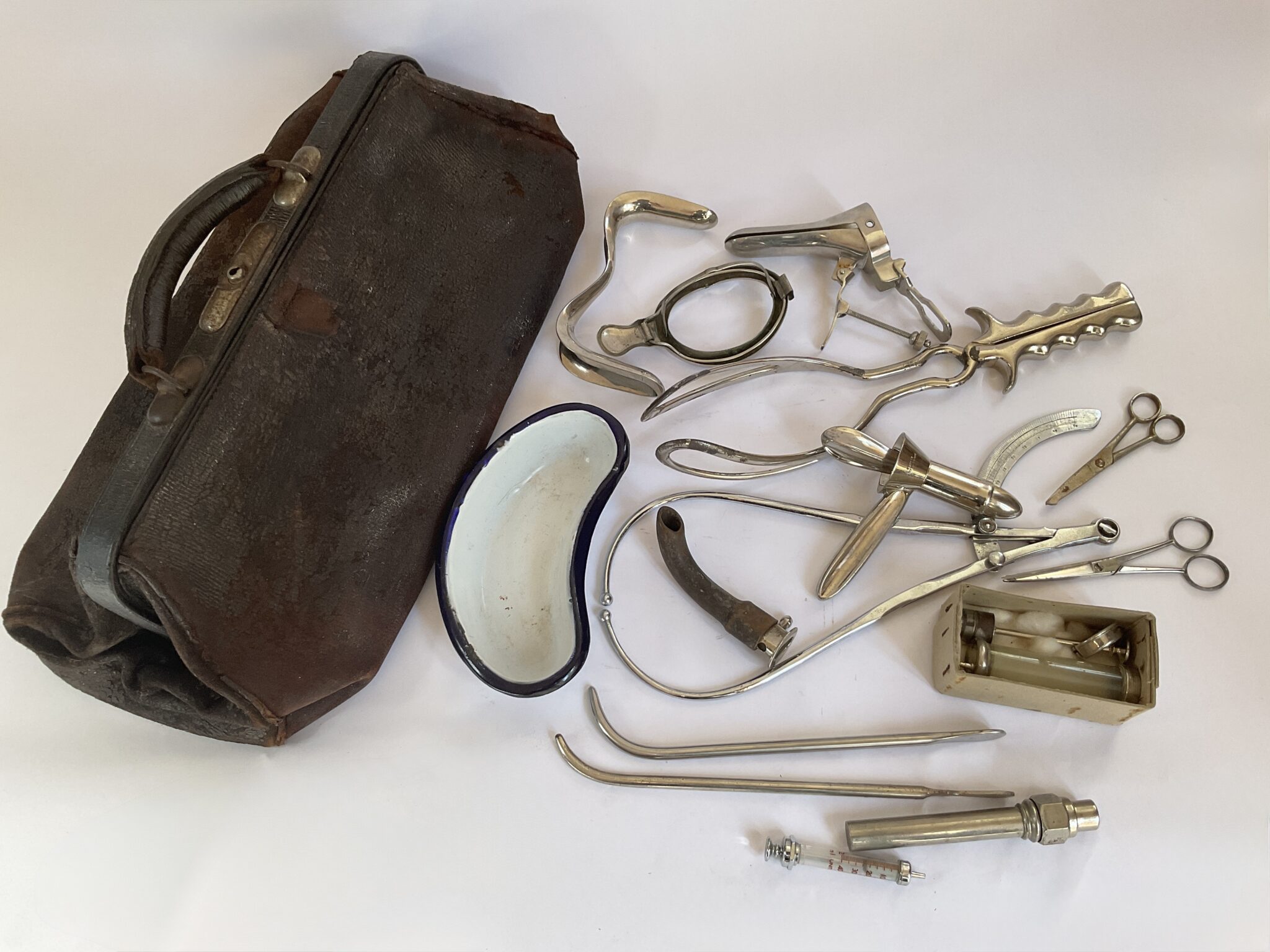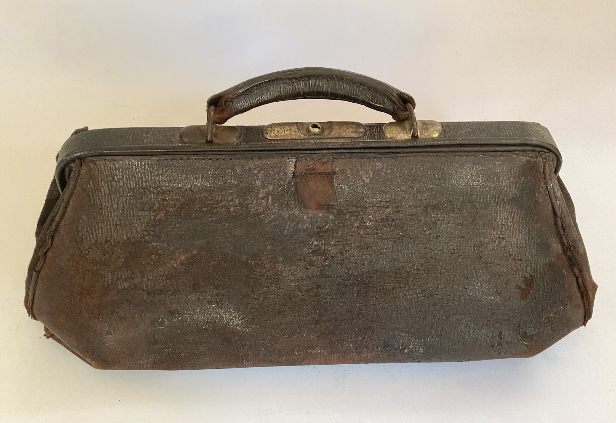 An antique Gladstone bag by Holborn Surgical of London complete with contents including a pair of obstetric forceps, a pelvimeter, a cased record syringe, three speculums, an early anaesthetic mask, a further cased syringe, two urethral sounds and other items. The bag dates from the late 19th or early 20th century, it has the original liner (with some marks) and bears the Holborn Surgical logo, the bag is solid but there has been flaking to the top surface, the bag opens by depressing the lock. The catalogue page is taken from a late 19th century surgical instruments catalogue.