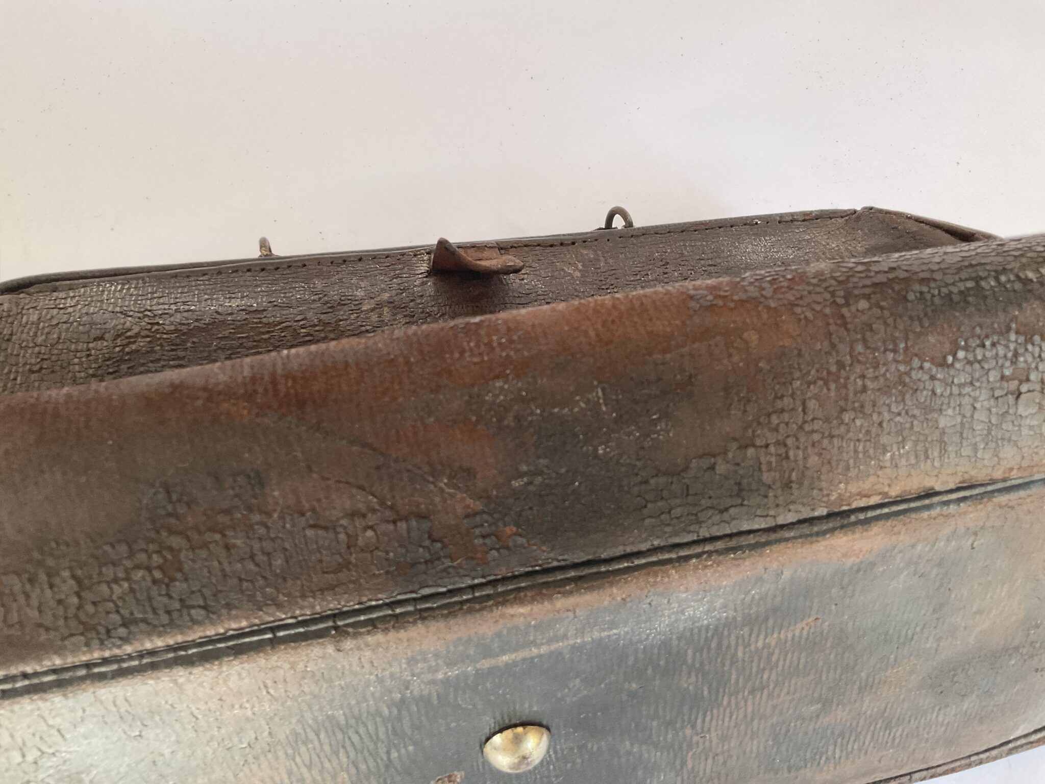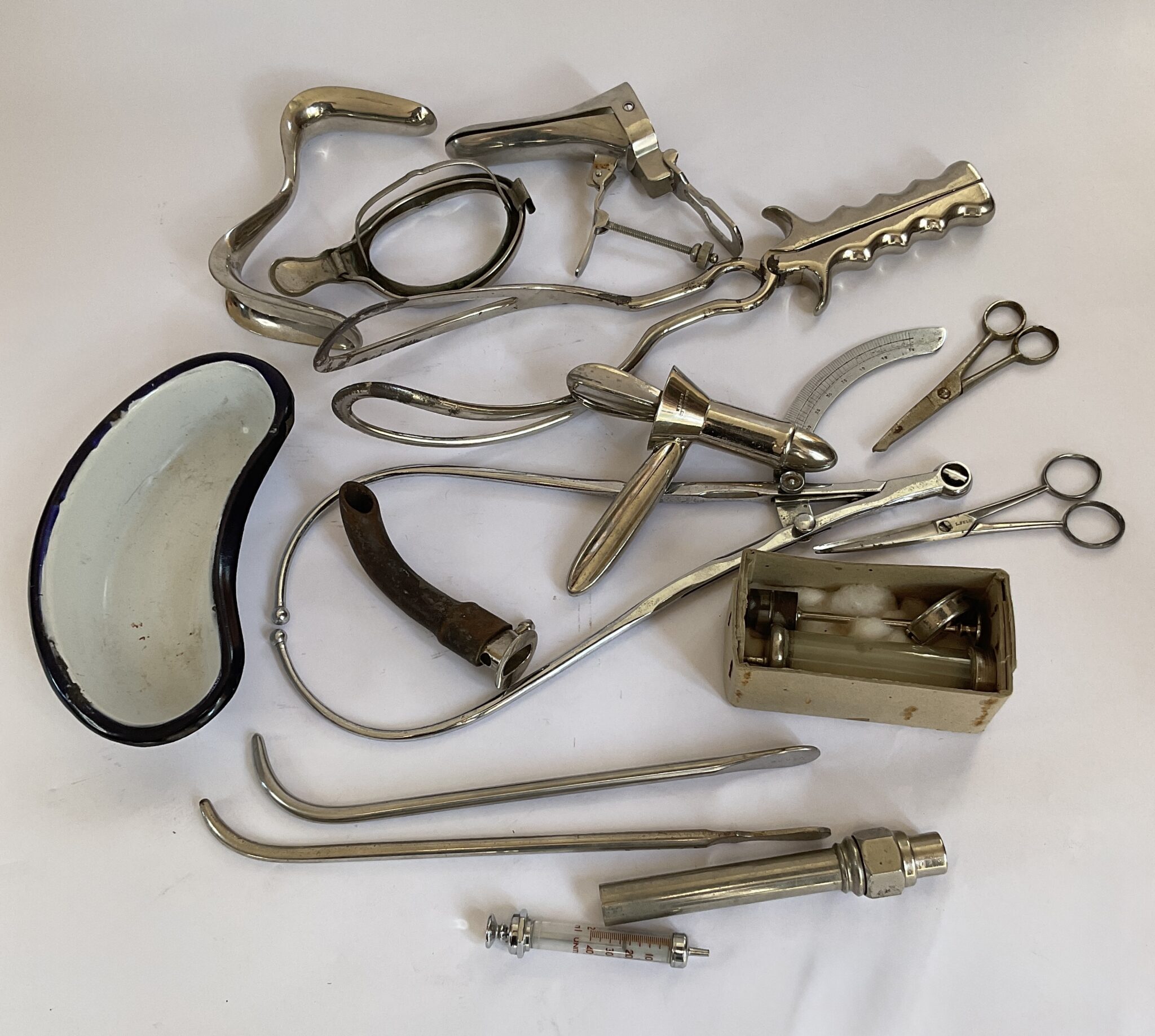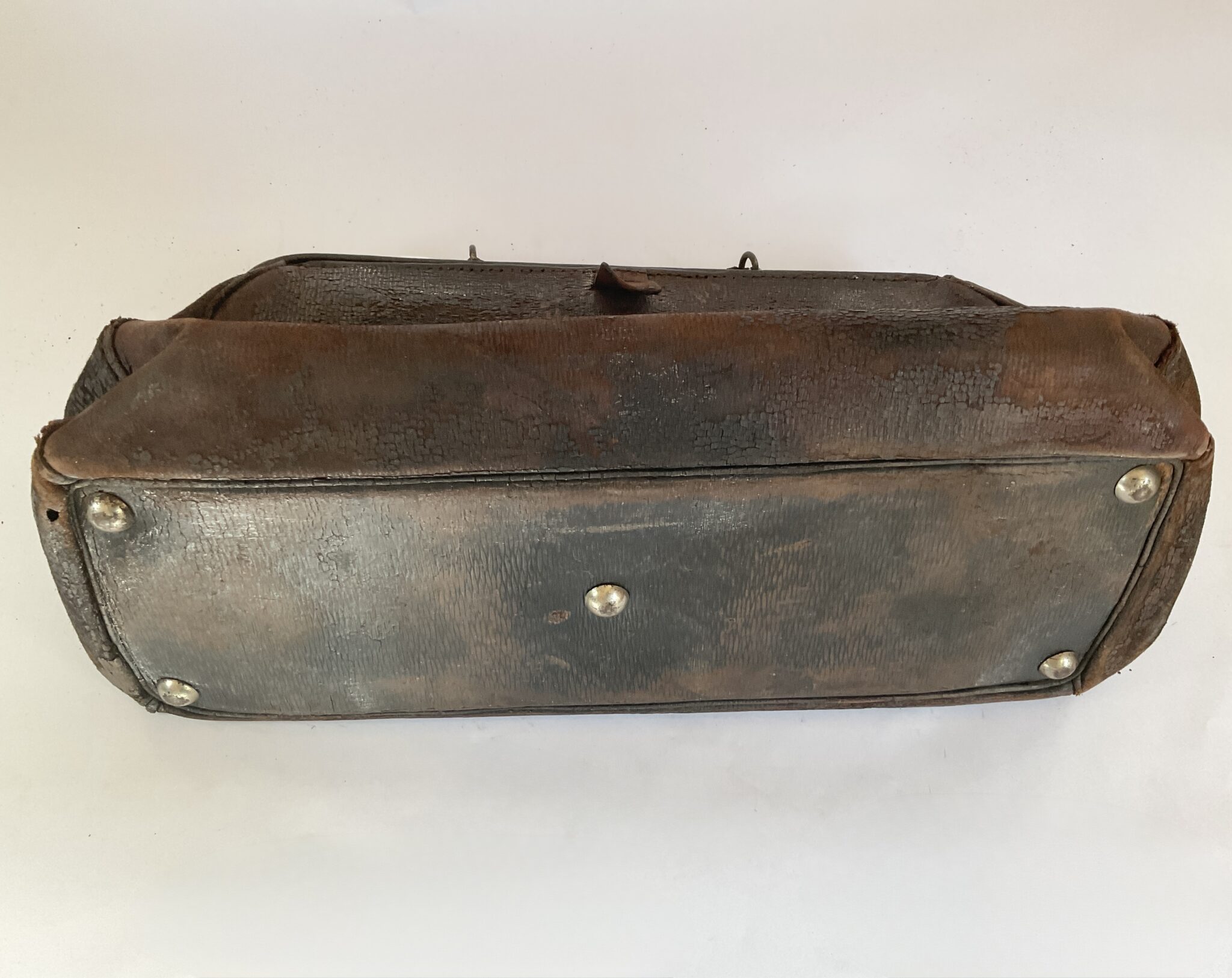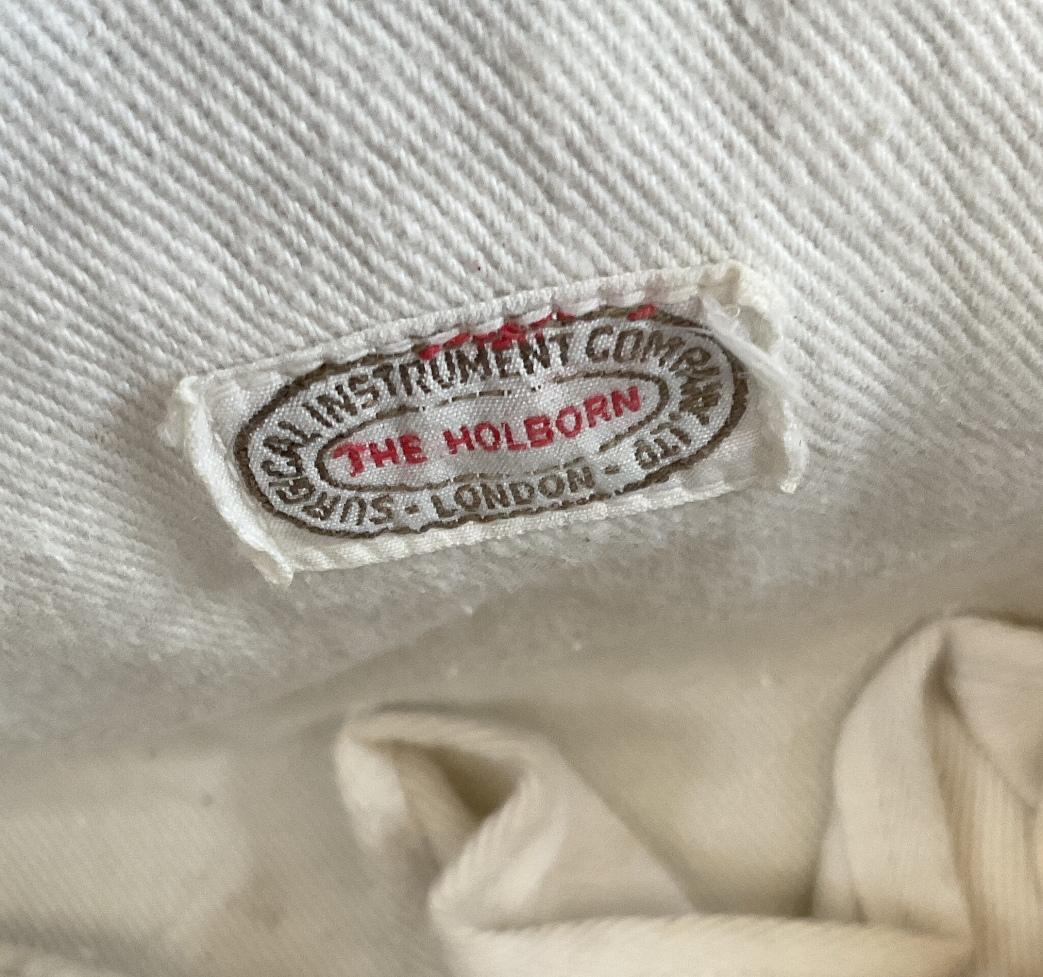 An antique Gladstone bag by Holborn Surgical of London complete with contents including a pair of obstetric forceps, a pelvimeter, a cased record syringe, three speculums, an early anaesthetic mask, a further cased syringe, two urethral sounds and other items. The bag dates from the late 19th or early 20th century, it has the original liner (with some marks) and bears the Holborn Surgical logo, the bag is solid but there has been flaking to the top surface, the bag opens by depressing the lock. The catalogue page is taken from a late 19th century surgical instruments catalogue.