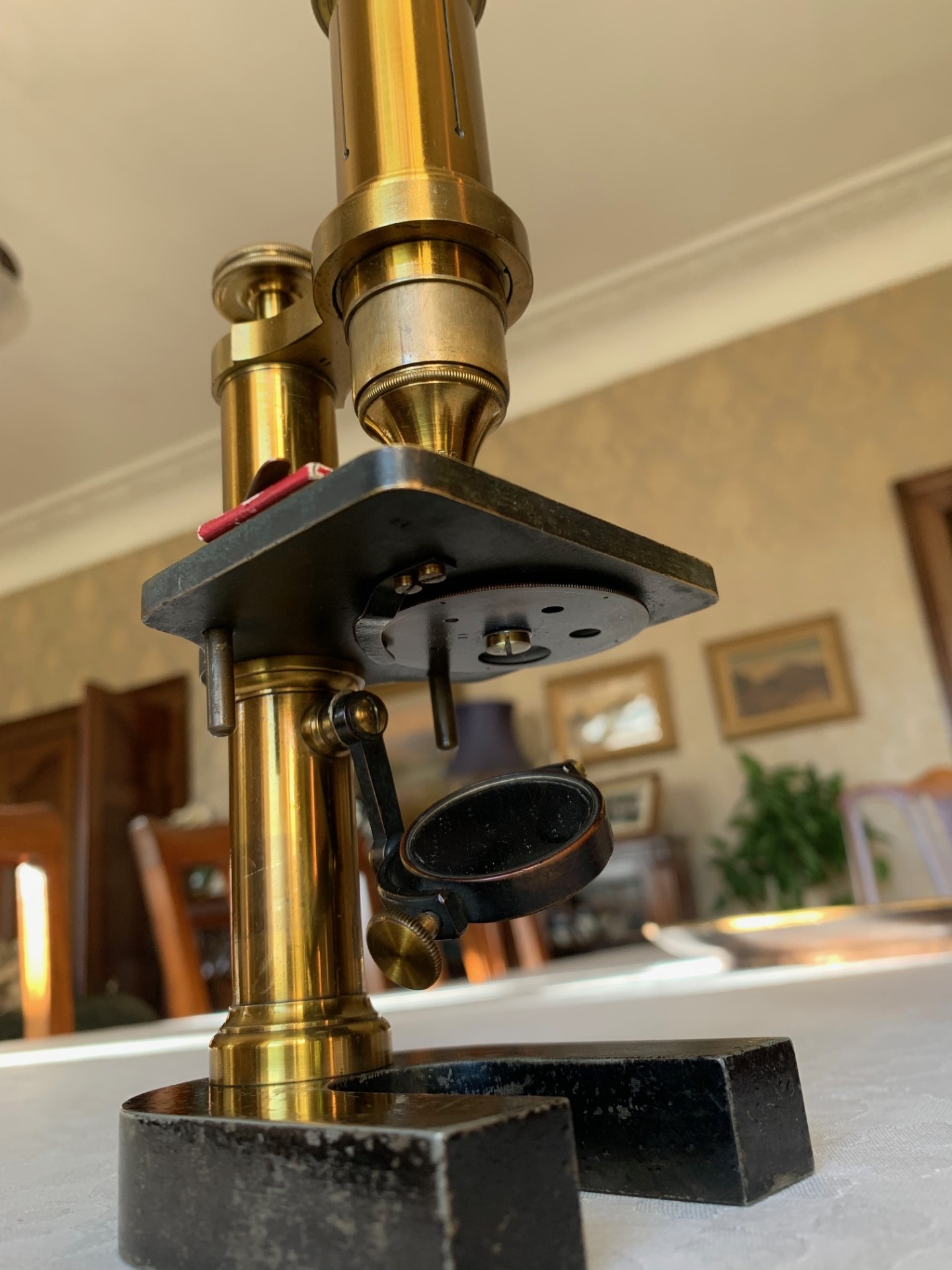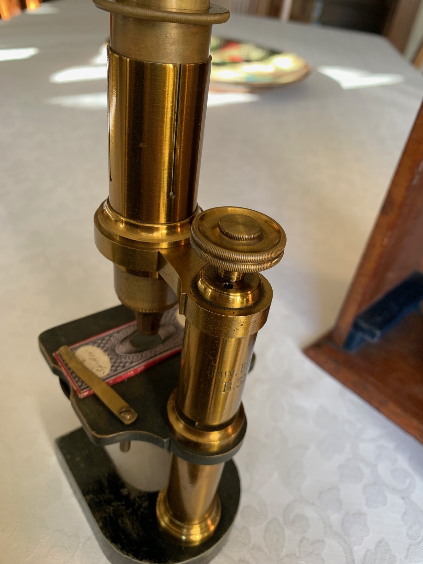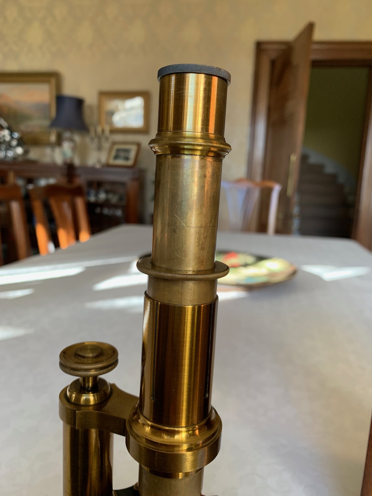 In summary, this is a very good clean example of a compact antique monocular microscope from the Victorian period by a quality French maker, that’s in good working and cosmetic condition for its age. This example may therefore appeal to collectors as well as specialists seeking a quality compact brass instrument for use and/or display. Being compact it’s also a perfect desk-top accessory, especially when set up with an appropriate antique slide – it’s working height is between about 10 and 12 inches.