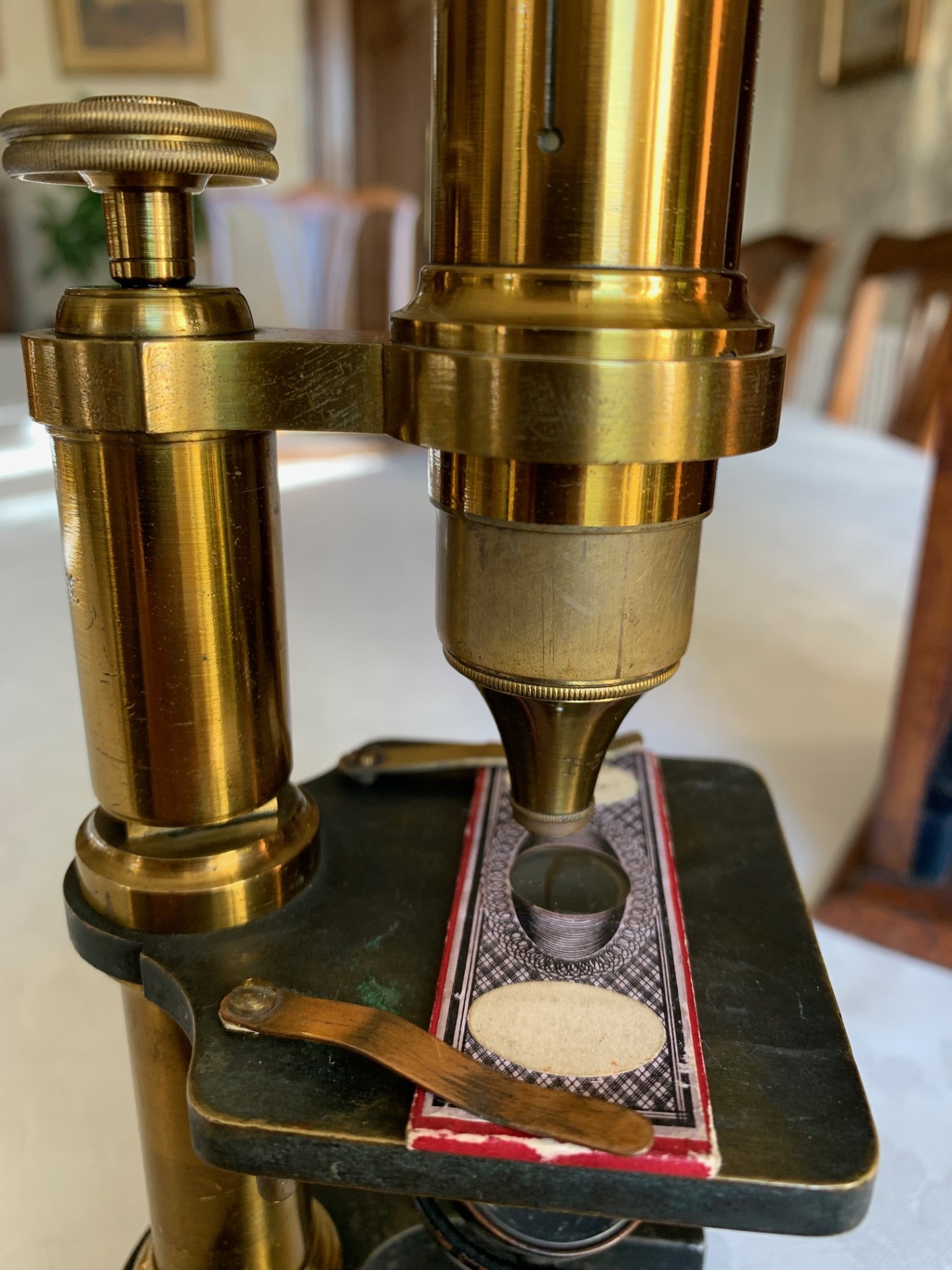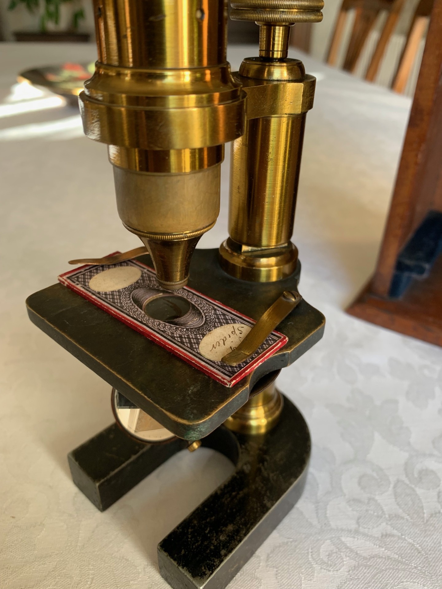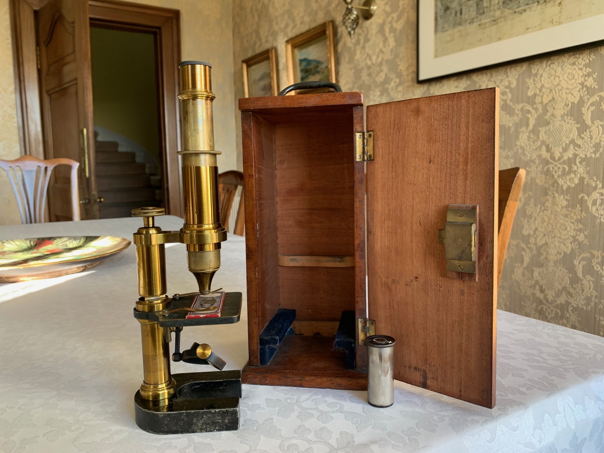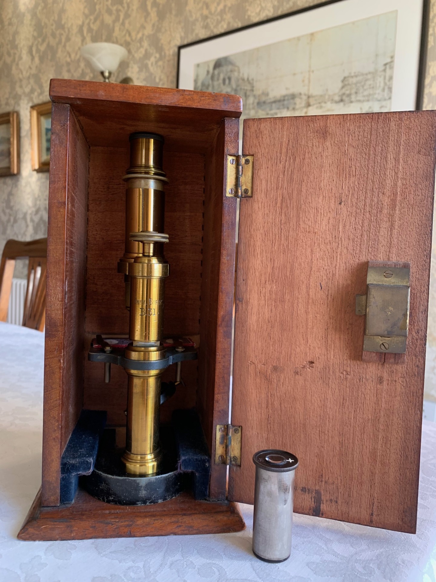 In summary, this is a very good clean example of a compact antique monocular microscope from the Victorian period by a quality French maker, that’s in good working and cosmetic condition for its age. This example may therefore appeal to collectors as well as specialists seeking a quality compact brass instrument for use and/or display. Being compact it’s also a perfect desk-top accessory, especially when set up with an appropriate antique slide – it’s working height is between about 10 and 12 inches.