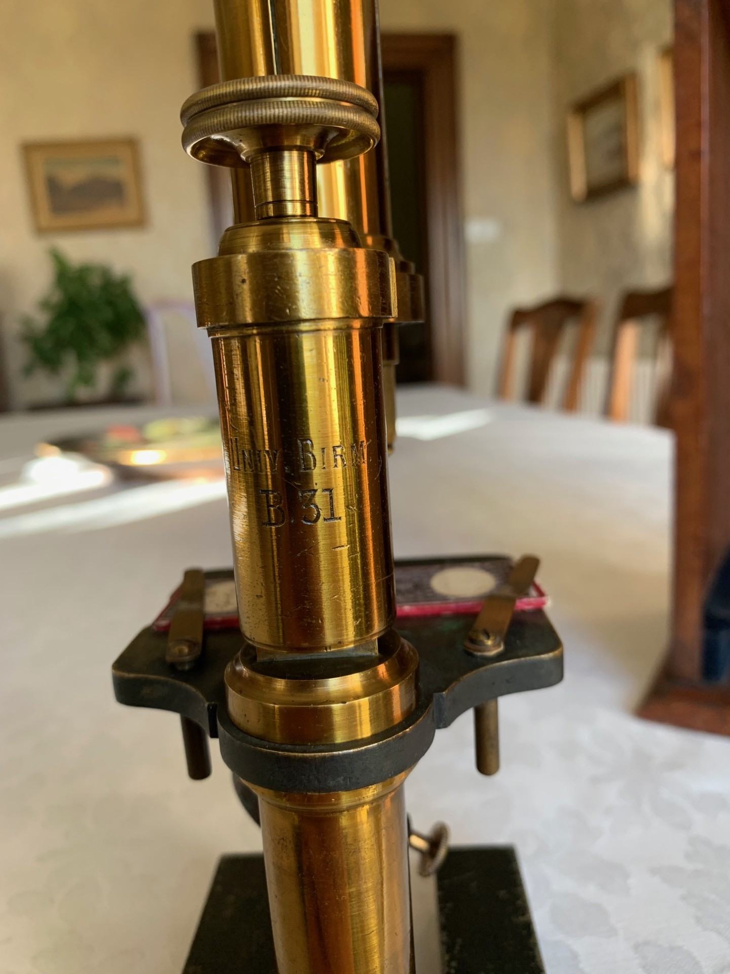 This instrument is Hartnack & Prazmowski’s Stand III Compact model and there’s an image from an 1882 publication at the end of the listing photo-stream showing this model of microscope. This example has some provenance with University of Birmingham markings on both stand and objective, along with an inventory number “B31”. Turning to the main technical details of this Victorian period compact monocular microscope, we have the following: