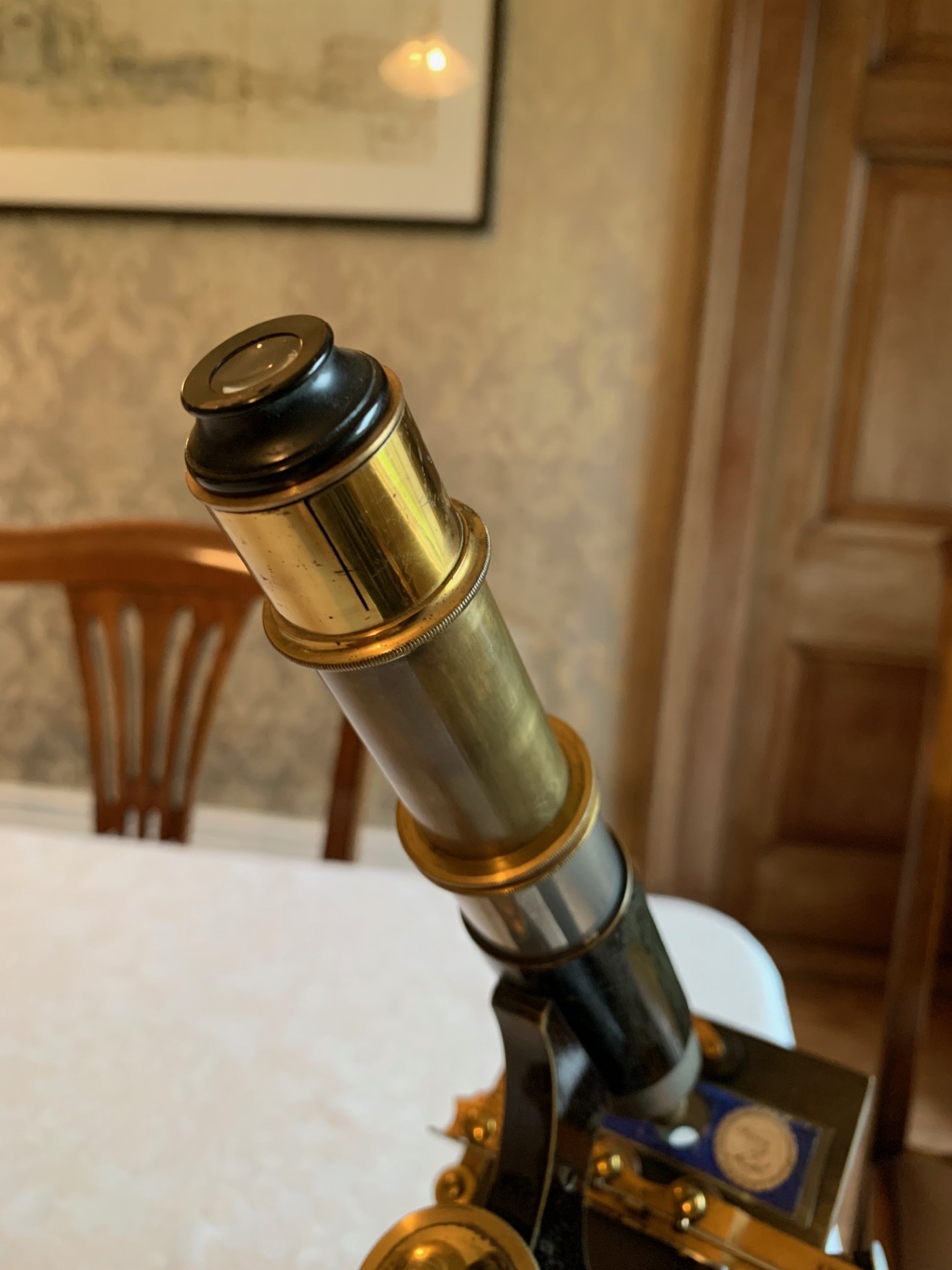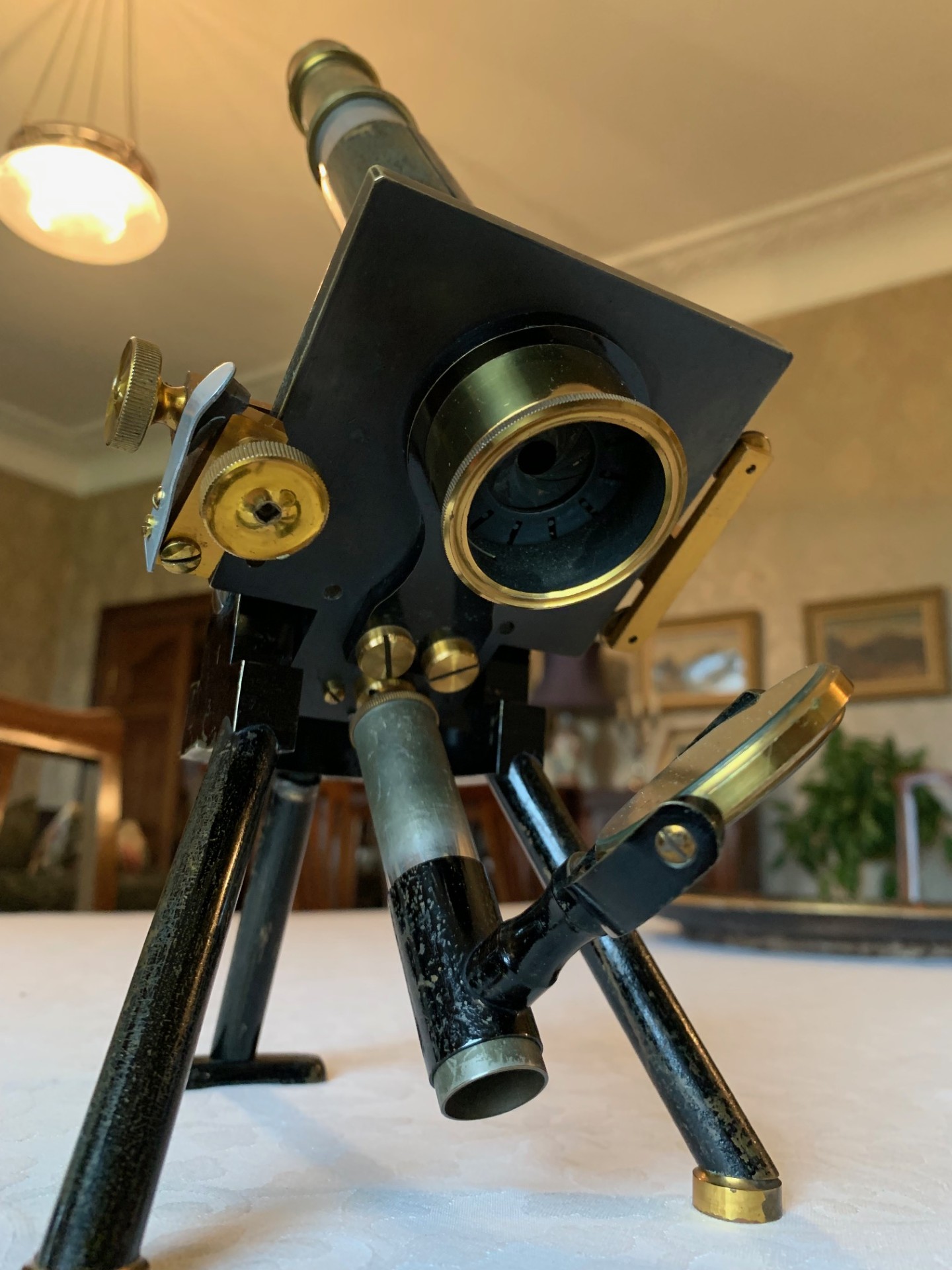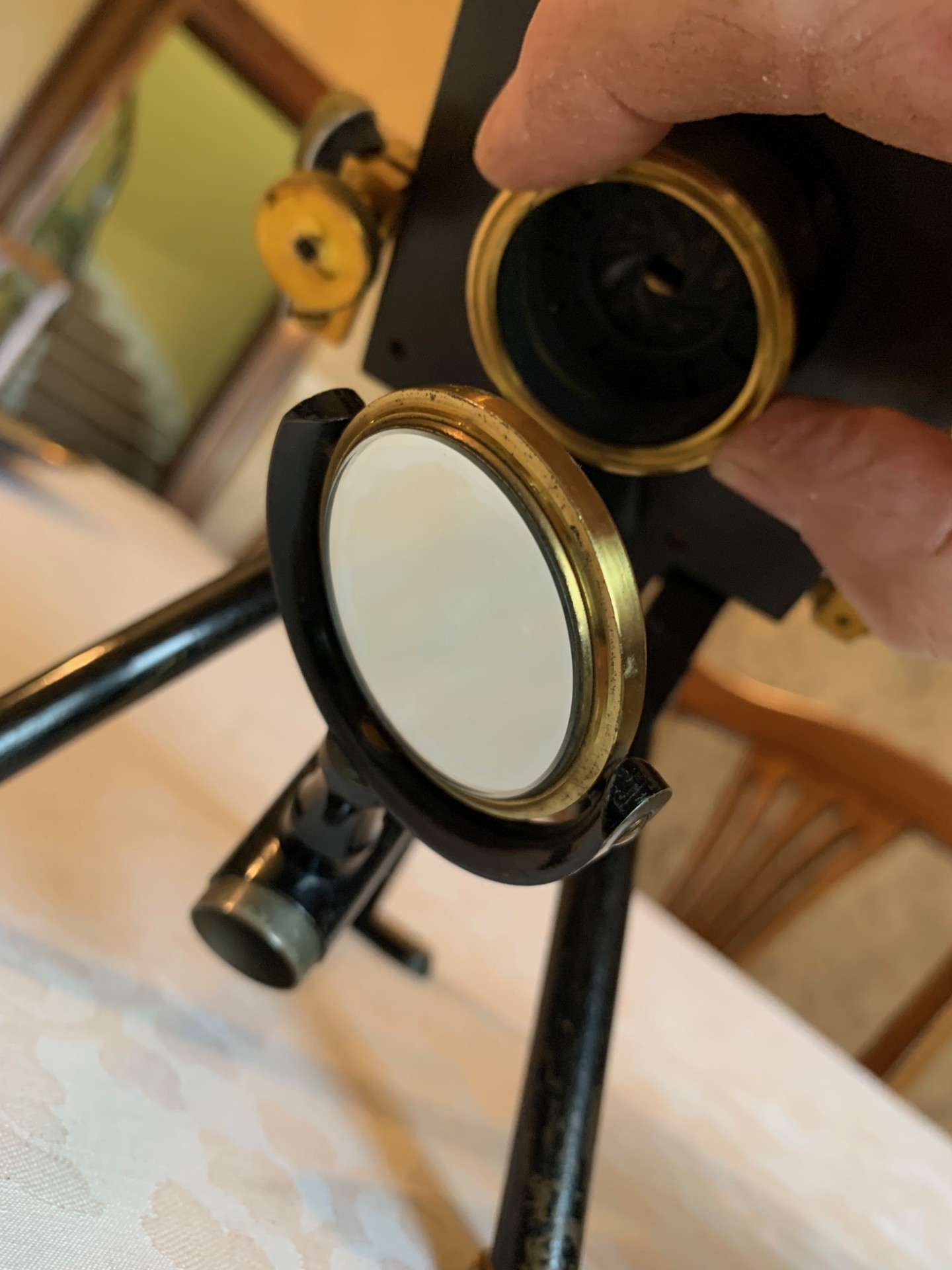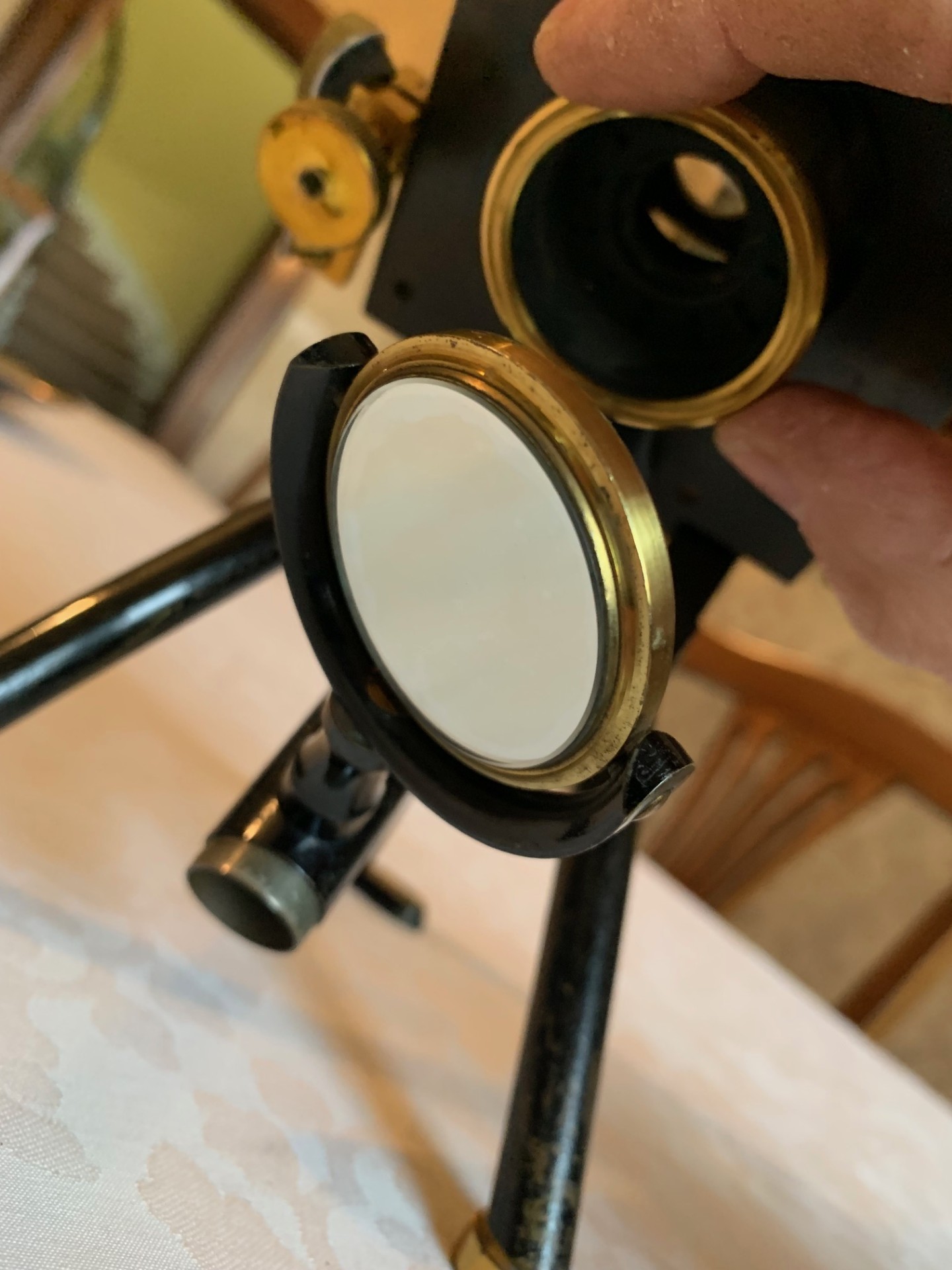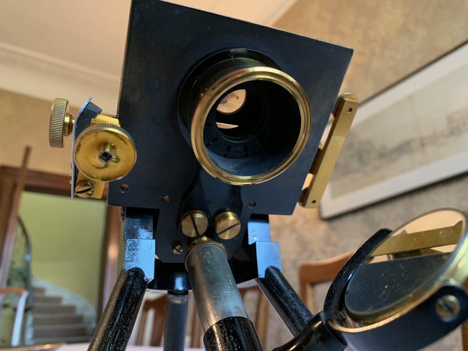 Technical details – the construction is a black-painted brass tripod foot, with twin brass bun-feet at the front and a heavier flat foot at the rear giving extra stability. From the tripod twin uprights supporting a pivot and a continental pillar-style upper limb. Coarse focus is by a friction-fit optical tube in brass with additional draw-tube also in brass. This sits in a mount held in place by friction and the focusing technique is by push-pull sliding of the main optical tube, which works surprisingly well giving smooth control of coarse focus adjustment with a nice intuitive tactile feel. Fine focus is controlled by a brass thumb-wheel atop the continental pillar, which also works well with some resistance and good smooth fine adjustment.