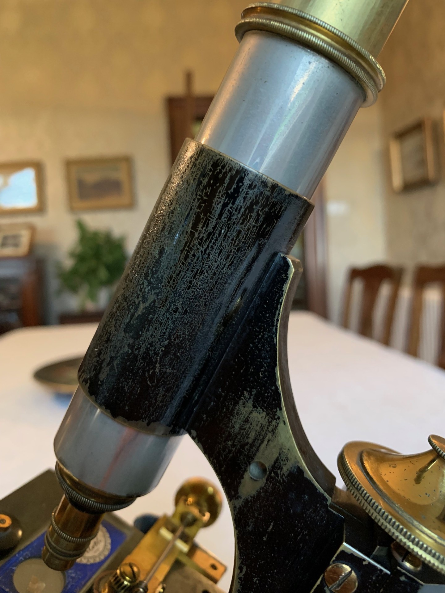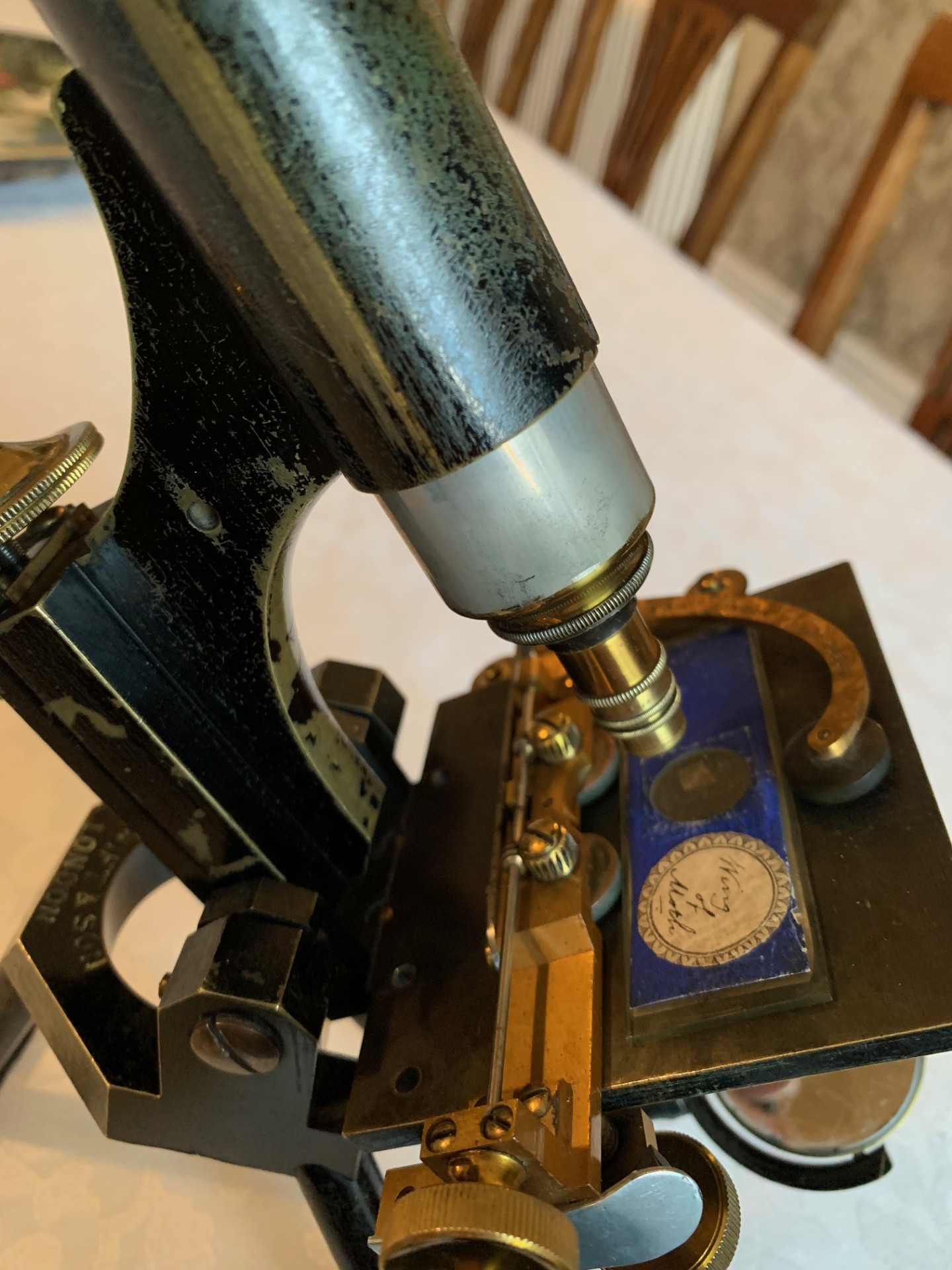 The instrument has been very lightly lubricated with non-hardening grease where necessary, so that the controls operate smoothly. This example of a late Victorian Swift microscope while being usable with care in view of both age and condition issues as noted, essentially makes an interesting technical display piece and the listing price-point reflects its present condition. It could be displayed in a library or home office type of setting, especially when set up with an appropriate antique slide such as the Victorian paper-covered slide I was using for testing purposes as shown in the listing photos.