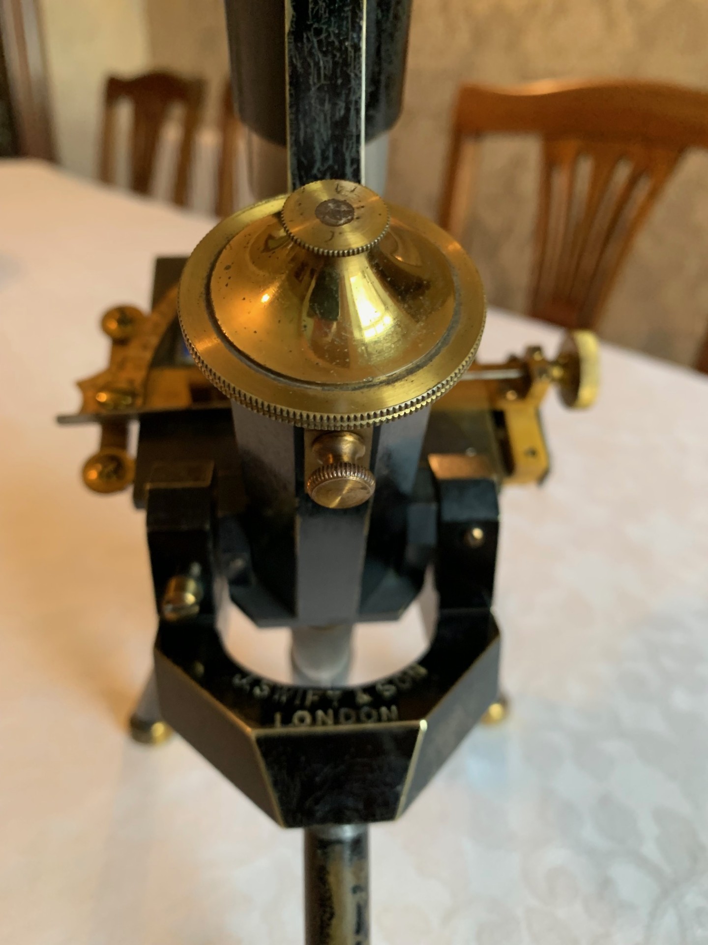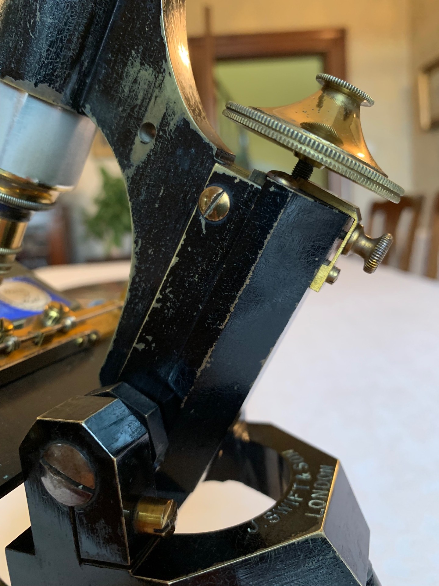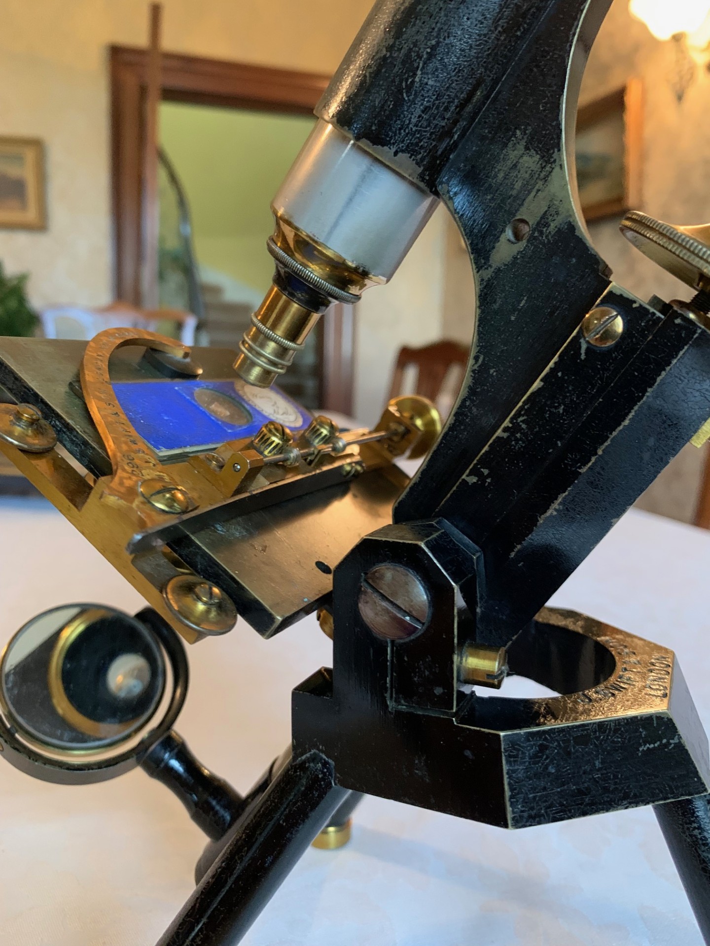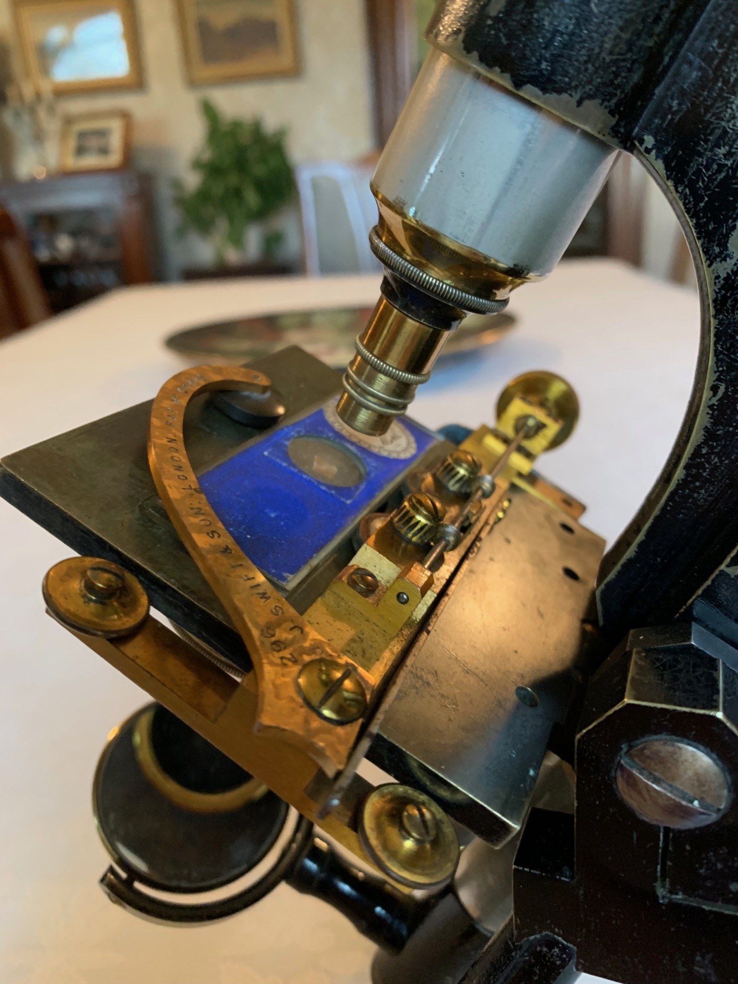The instrument tilts for inclined viewing and holds in position through its working range as it should. The specimen stage is square and solid brass, with holes for stage clips. As an alternative to conventional slide clips, I’ve added an antique early version of the patented Swift roller-stage, which is a great visual addition. This mechanical over-stage fits the brass stage, although there are no alignment grooves on either side of the stage for the over-stage wheels to run in. Therefore, while it’s partially functional, the over-stage is really a visual enhancement.
