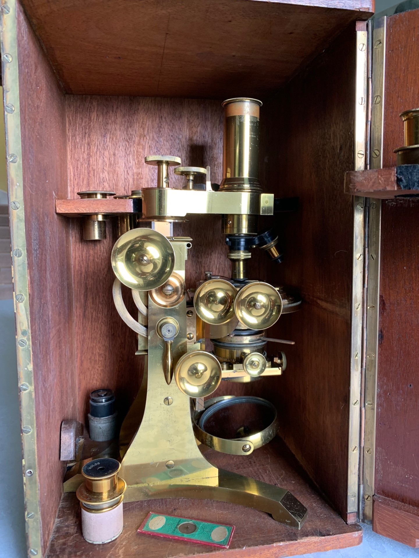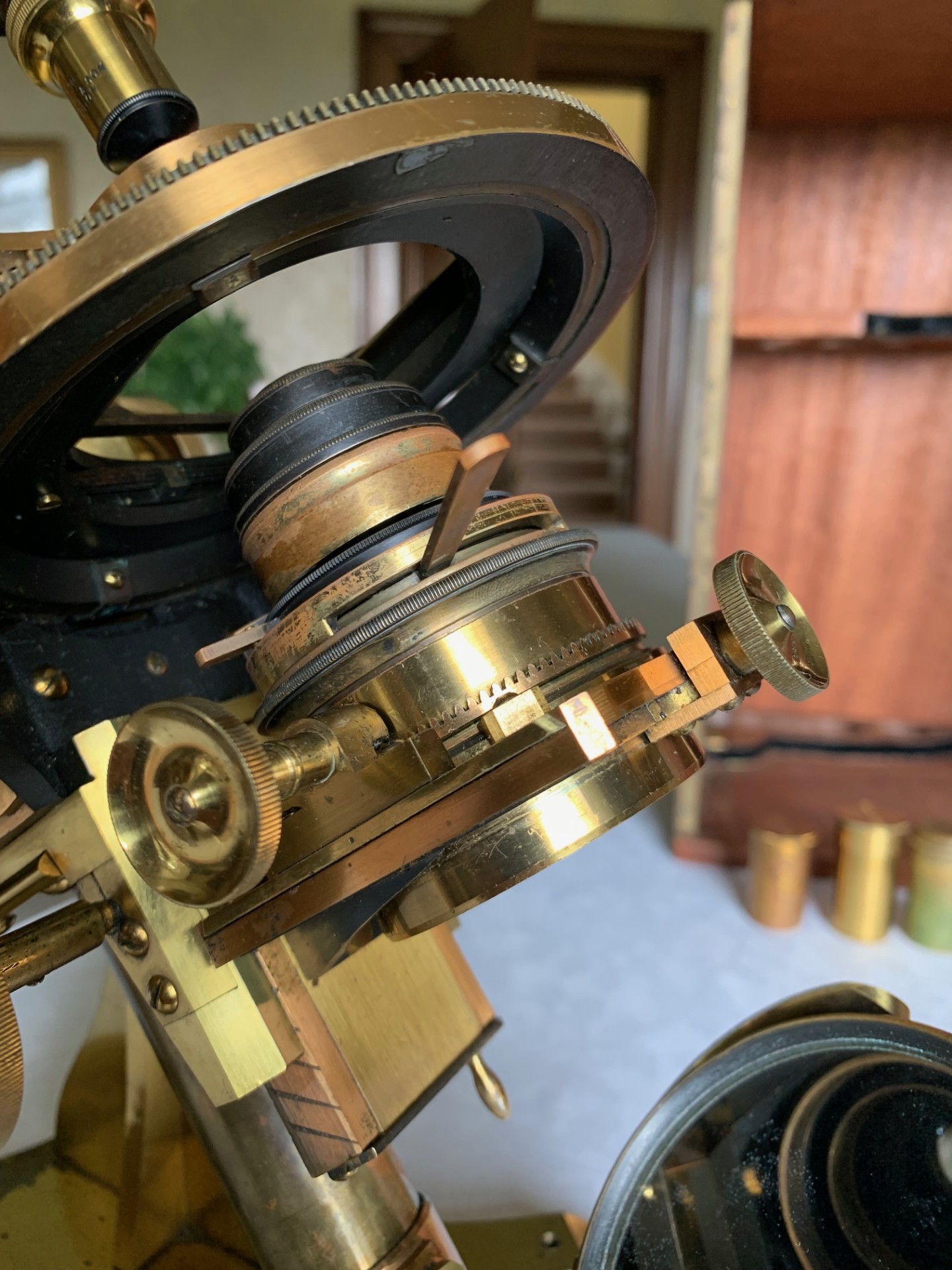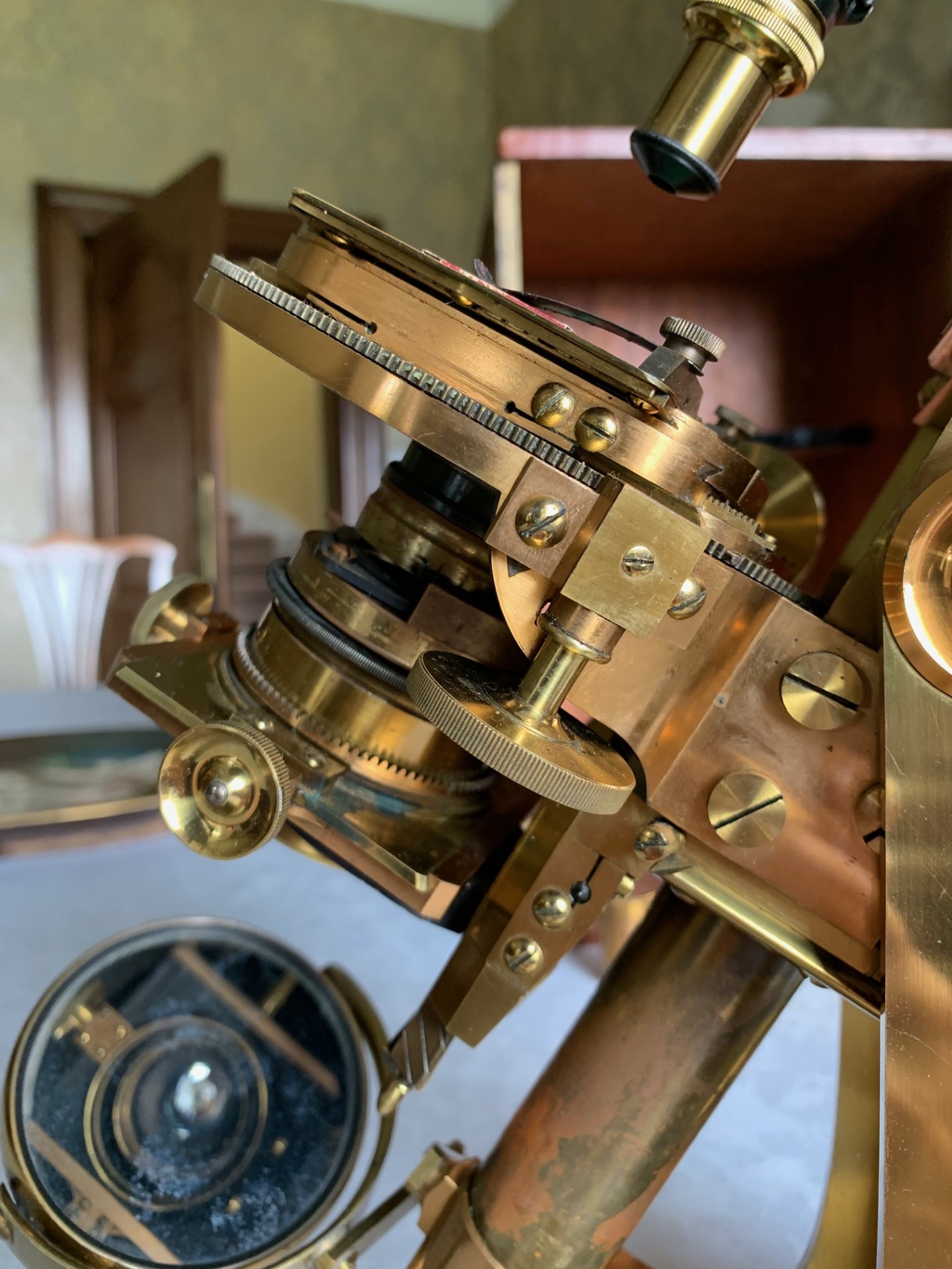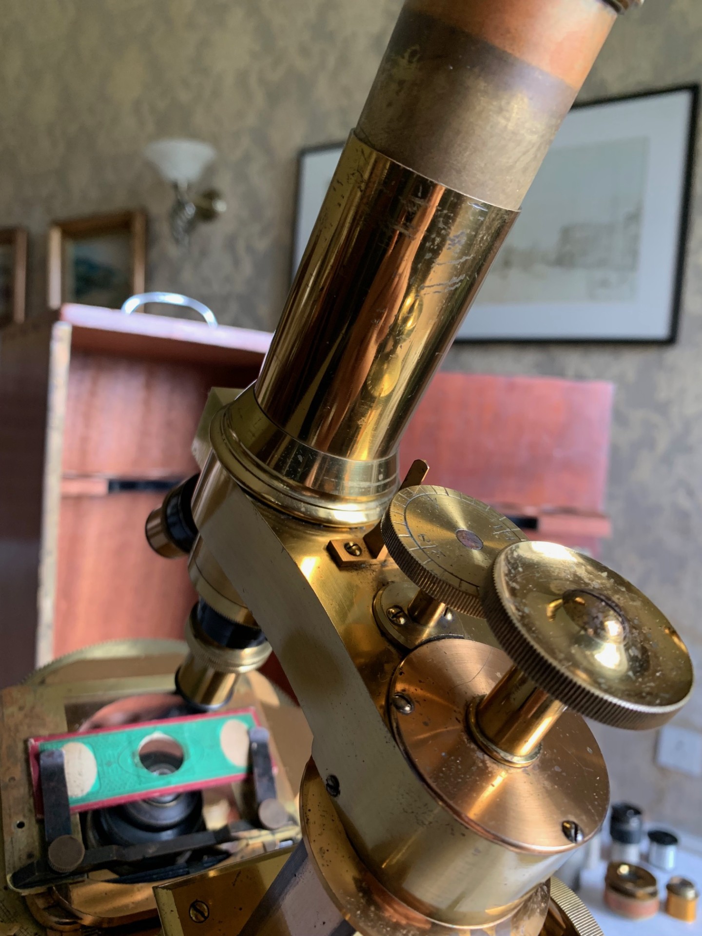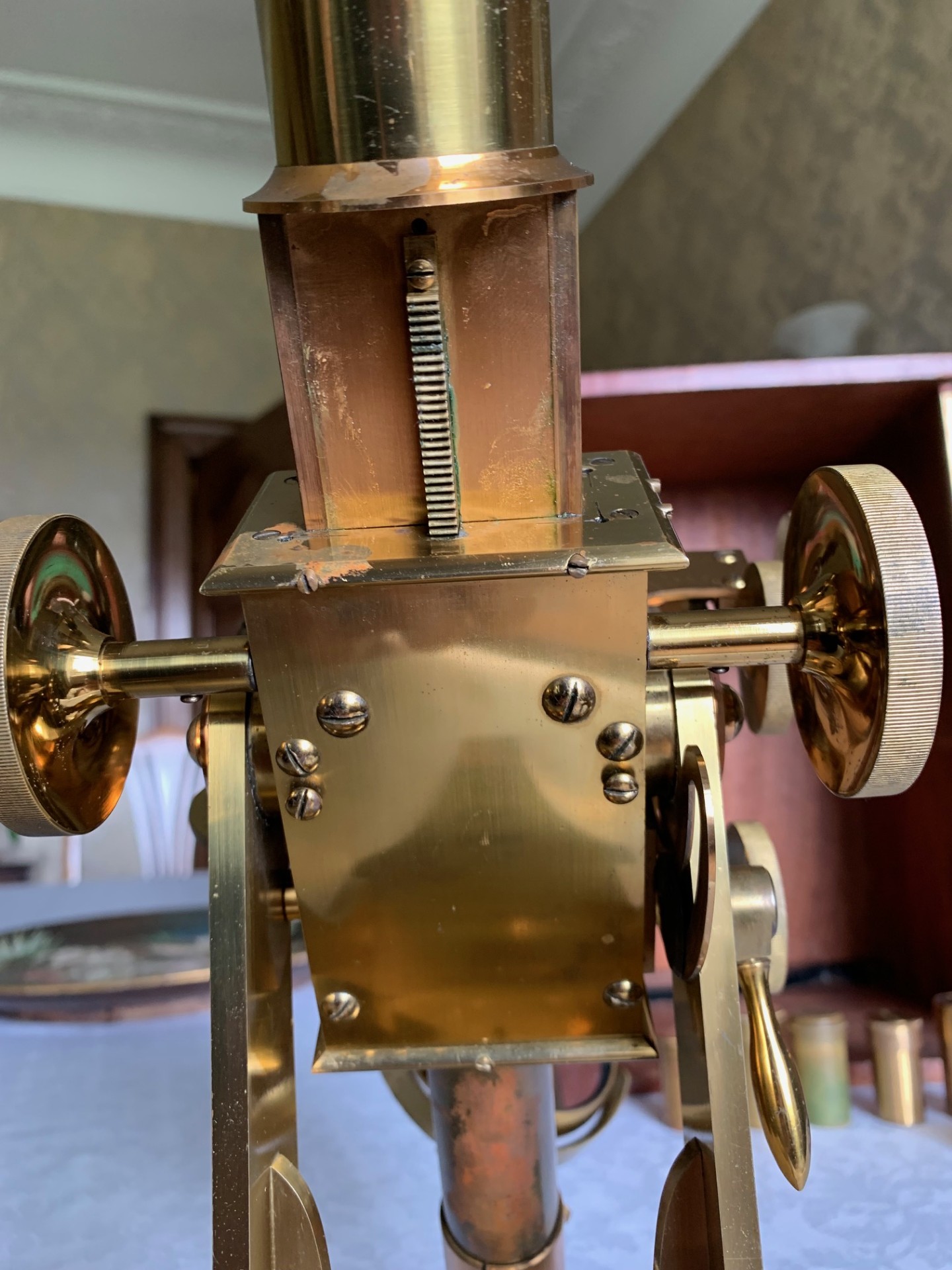 The instrument has been very gently dusted and also lightly lubricated with non-hardening grease where appropriate, so that the controls operate smoothly. This example displays exceptionally well having a substantial presence along with its quirky short-optical-tube look and some lovely lacquered brass-work with rich gold and copper tones which catch the light beautifully. This antique microscope is very much a usable proposition and it will also make a stunning antique display piece as is, perhaps in a library or home office type of setting, especially when set up with an appropriate antique slide. There’s also a case with this instrument with internal lens racking and working lock & key which is always nice to have.