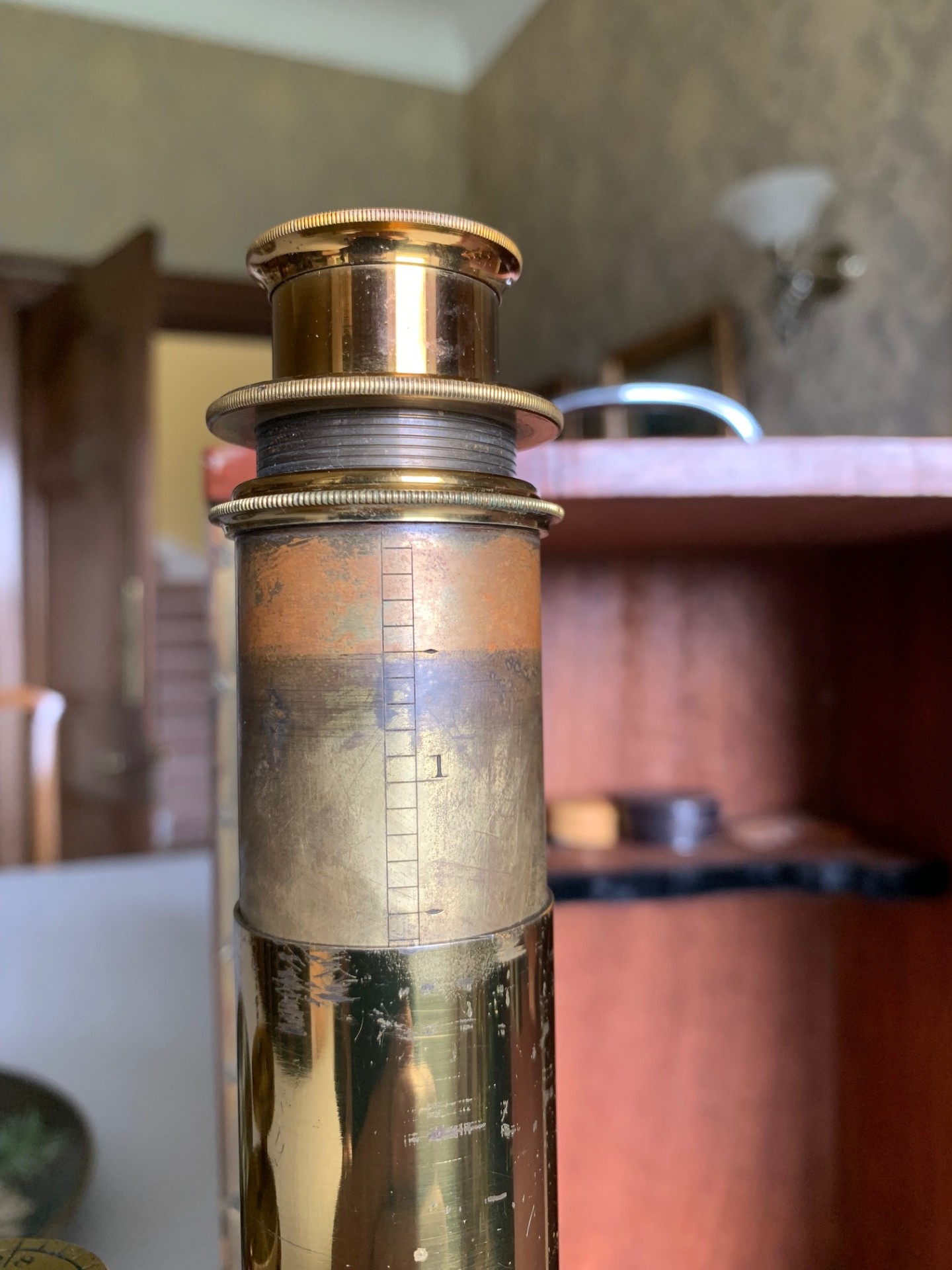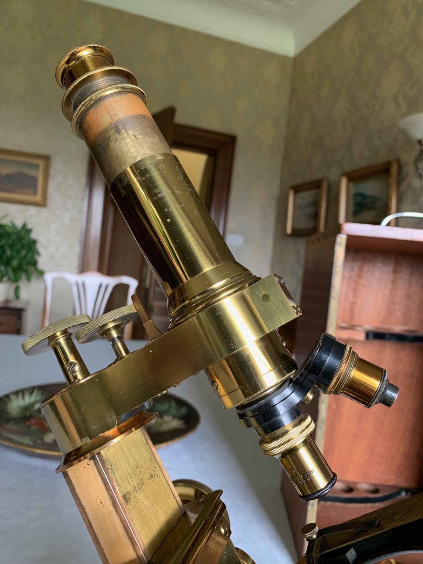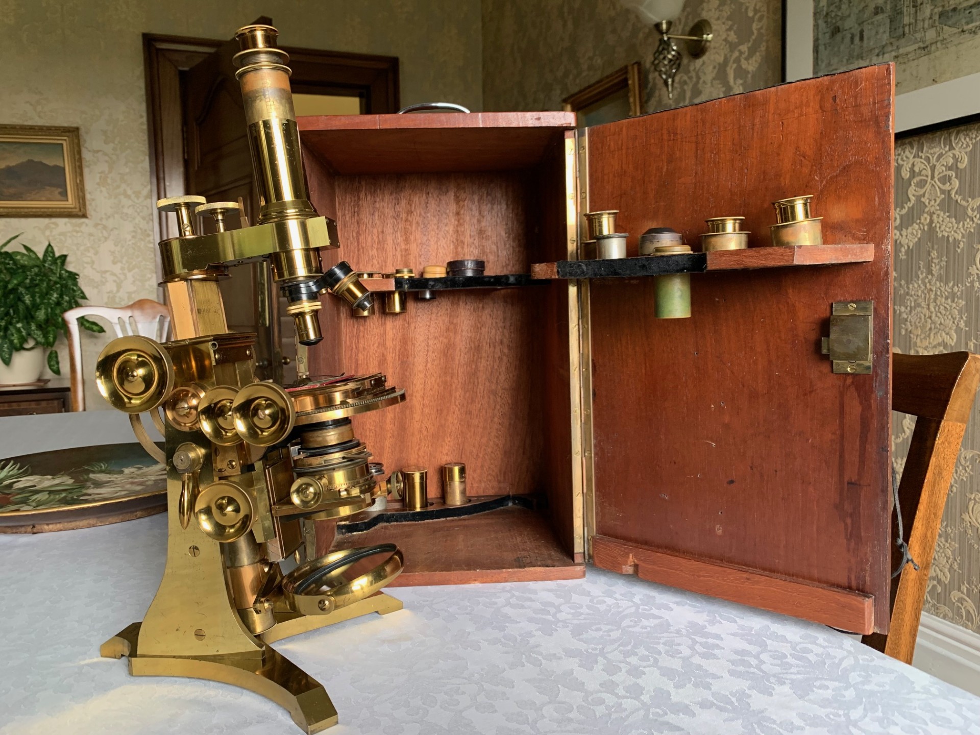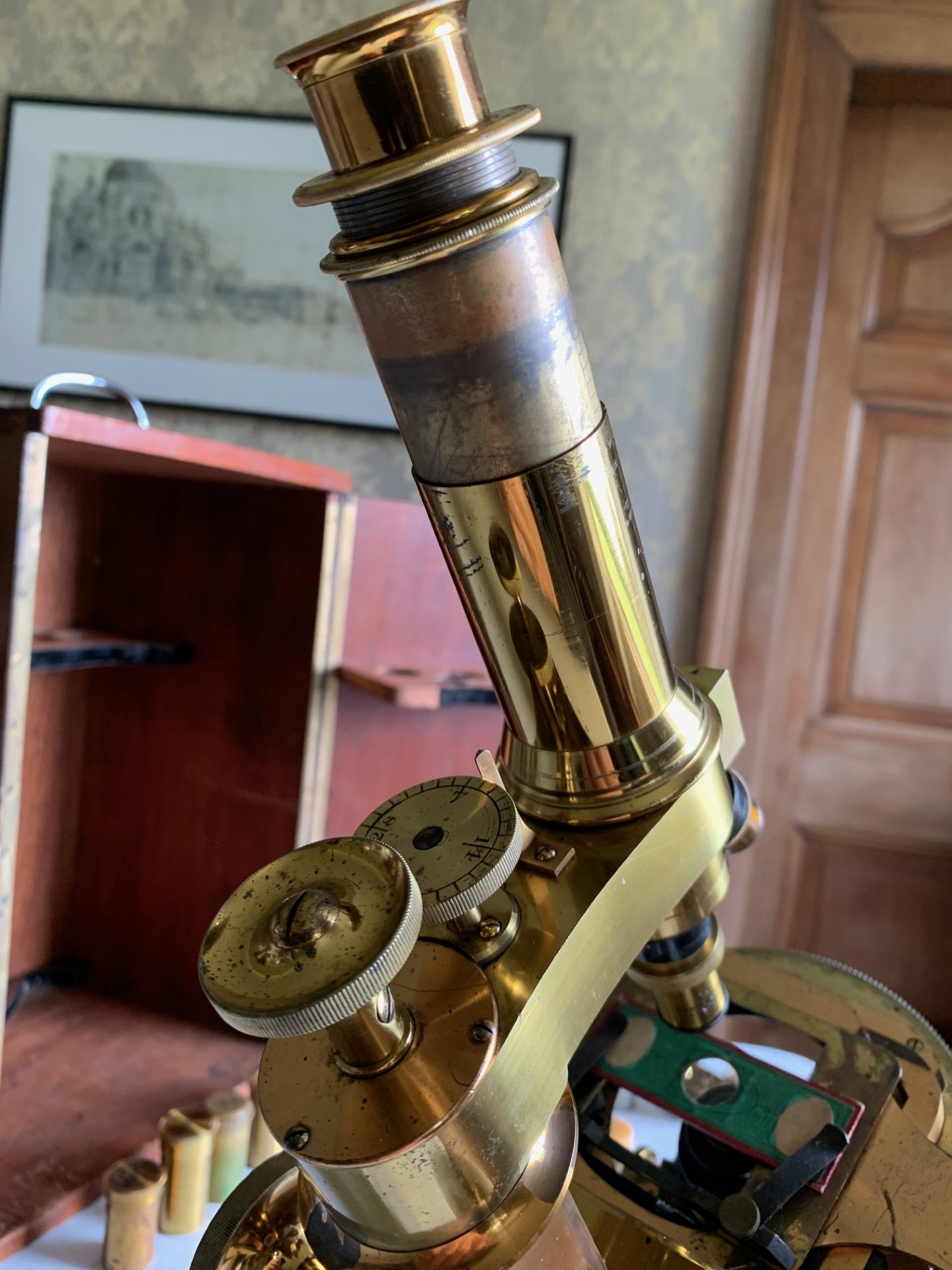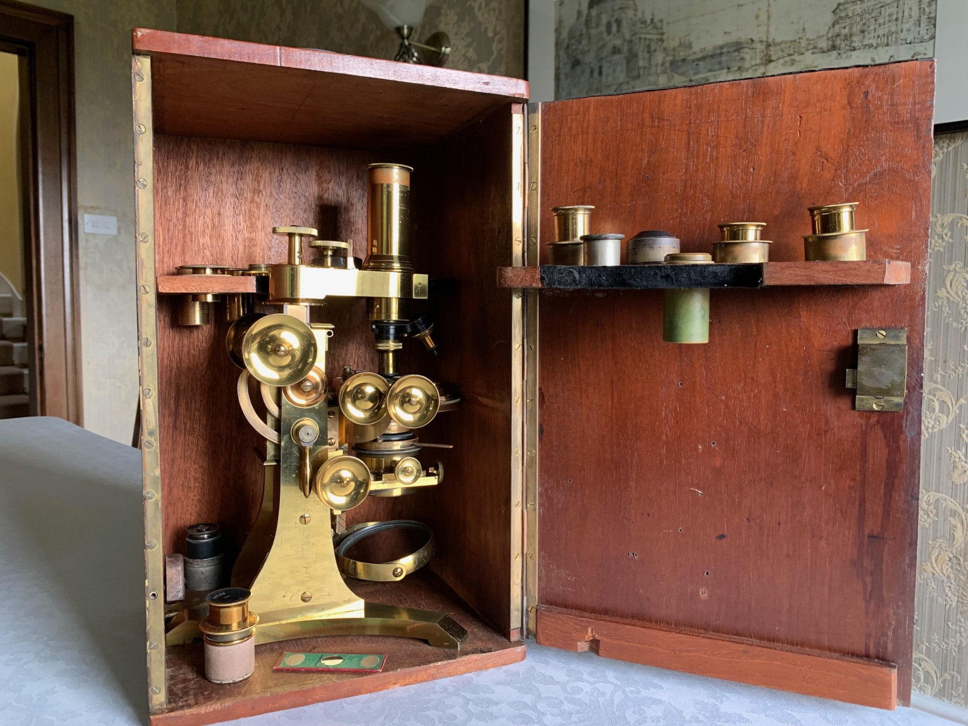 The instrument has been very gently dusted and also lightly lubricated with non-hardening grease where appropriate, so that the controls operate smoothly. This example displays exceptionally well having a substantial presence along with its quirky short-optical-tube look and some lovely lacquered brass-work with rich gold and copper tones which catch the light beautifully. This antique microscope is very much a usable proposition and it will also make a stunning antique display piece as is, perhaps in a library or home office type of setting, especially when set up with an appropriate antique slide. There’s also a case with this instrument with internal lens racking and working lock & key which is always nice to have.