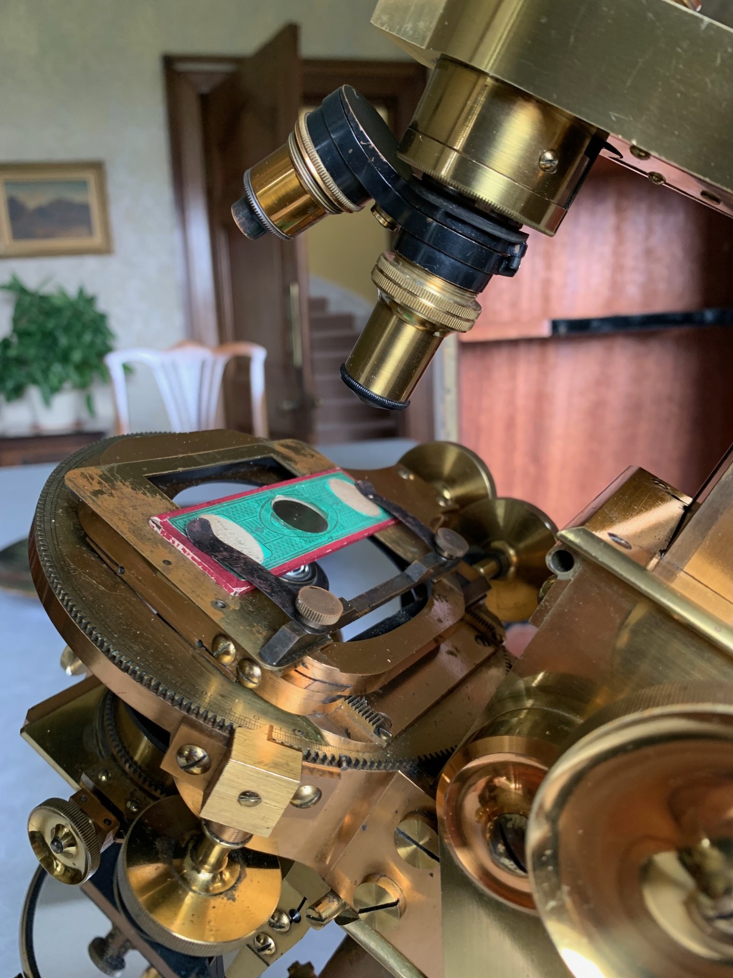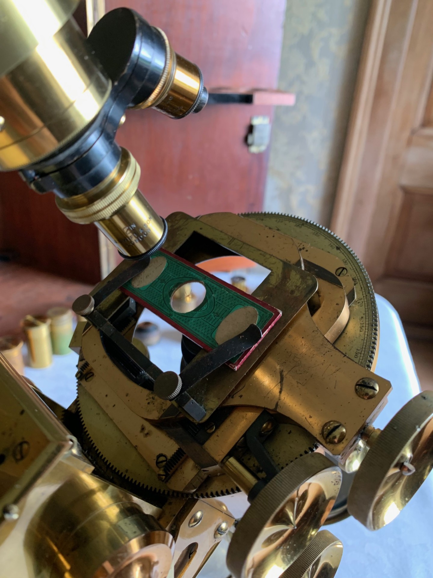 The instrument tilts for inclined viewing and holds in position as it should on inclination. It can be tightened in position via a limb-tension lever to the right hand side of the pivot, which is also fitted with a restrictor plate allowing the instrument to be tilted to the horizontal position with stability. The all-brass specimen stage is fully mechanical with in addition a mechanically operated rotation feature. The x/y adjustment thumb-wheels are on the right-hand side, giving about 1 inch of travel in the x/y planes, with the rotation control below stage. All the mechanical controls work very well and hold position on inclination, with rotation well damped. The brass stage top-plate is a slider that has a pair of slide clips which work well for holding slides in position – for testing I was using a paper-covered antique slide as seen in the listing photos.