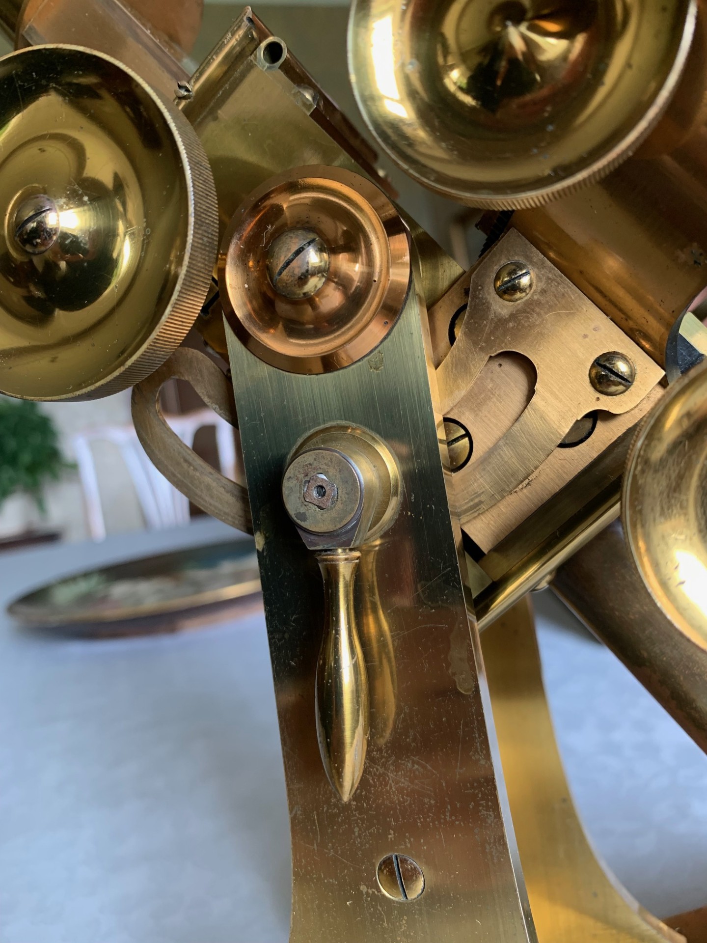 Turning to the sub-stage, both stage and sub-stage are attached to the massive brass pinion box and there’s a condenser fitted to a mounting assembly with height control via a rack and pinion mechanism with single-sided control. The condenser is of the Abbe-type and has both a working iris with smooth action and also a swing-out filter carrier fitted. In addition there are further controls for condenser position, with mechanical rotation and centering via brass thumb-screws. There’s a lengthy brass tailpiece on which the plano-concave illumination mirror is mounted, with height, rotation and gimbal giving very good adjustability.