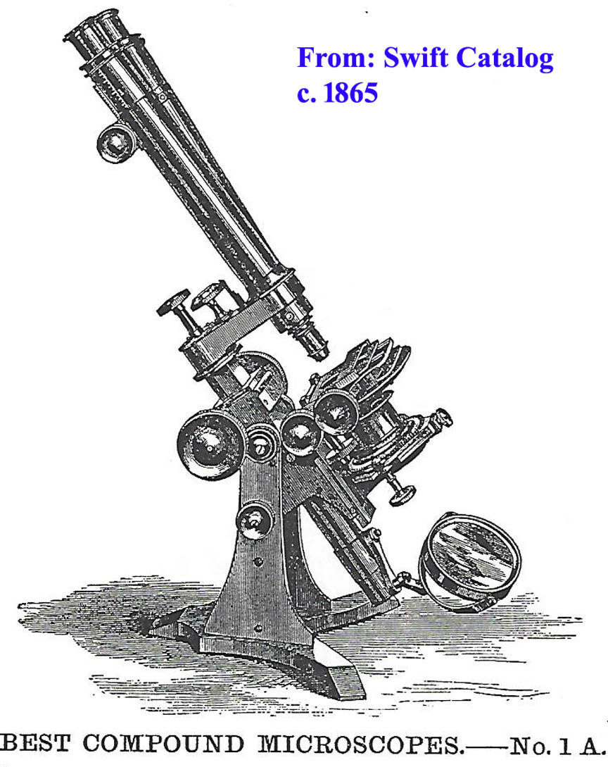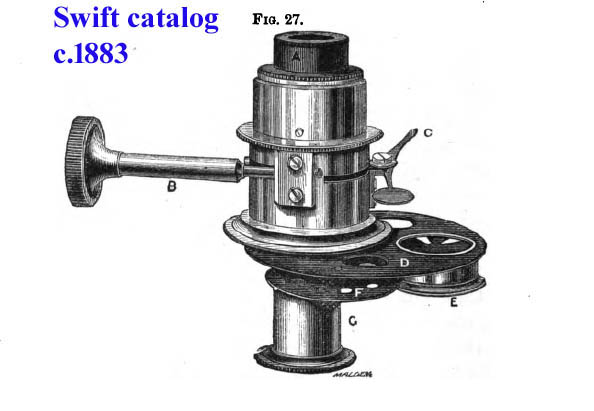 In 1881 James Swift brought in important improvements to microscope design, including replacement of straight rack and pinion focusing mechanisms with diagonal/helical cut components, along with a new style of fine focus mechanism. By 1884 James Swift’s, son Mansell had joined the company, so the firm’s name was therefore changed to James Swift & Son.