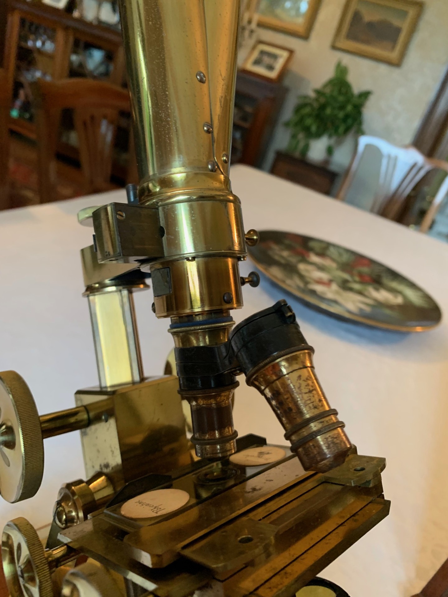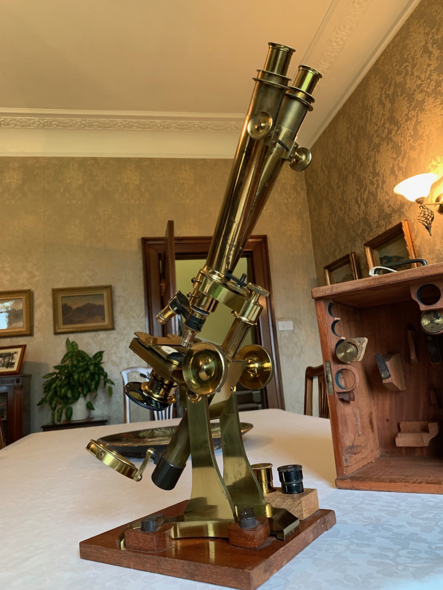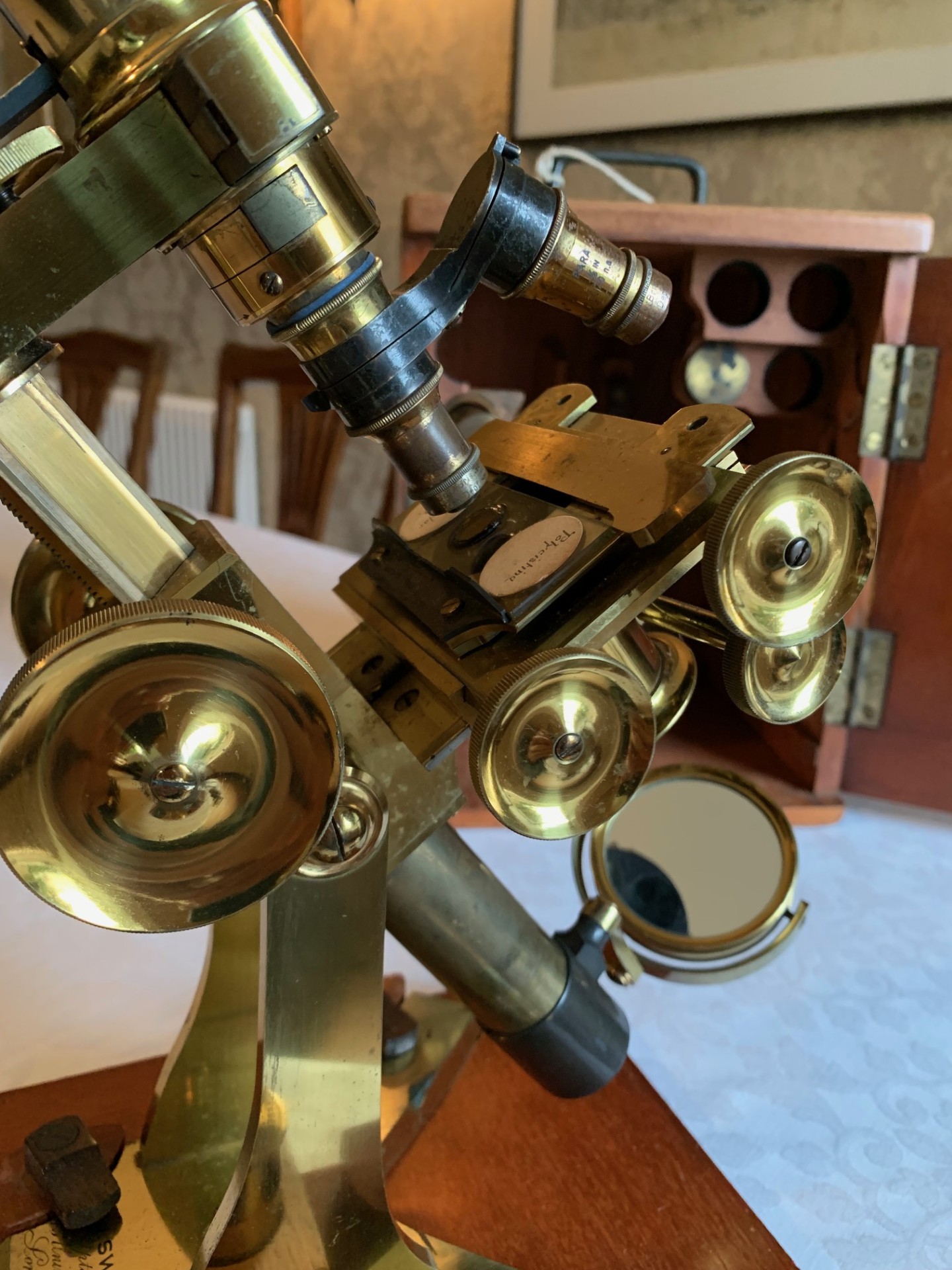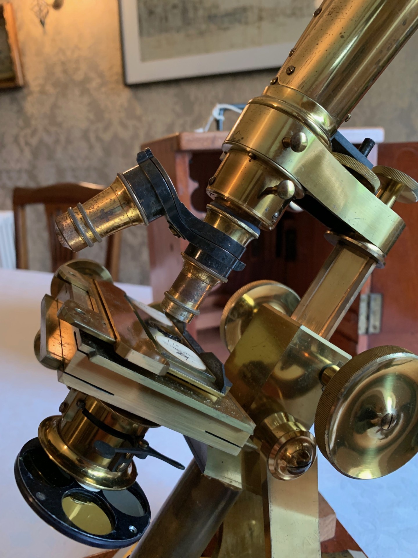 This example of a Swift bar-limb binocular microscope presents really well with lovely gleaming brass-work details and some age-appropriate patination here and there mainly to the y-shaped foot, although nothing detracts from the visual appeal, which is what you’d hope for with an antique instrument of this age. The instrument’s look and feel is of a quality not found in modern microscopes in that’s it’s fashioned from solid brass, giving it a really solid feel and it’s also quite a large instrument at around 18 inches working height when extended and inclined for use. I hope that the listing photos do the instrument justice and showcase both its size and fine period condition.