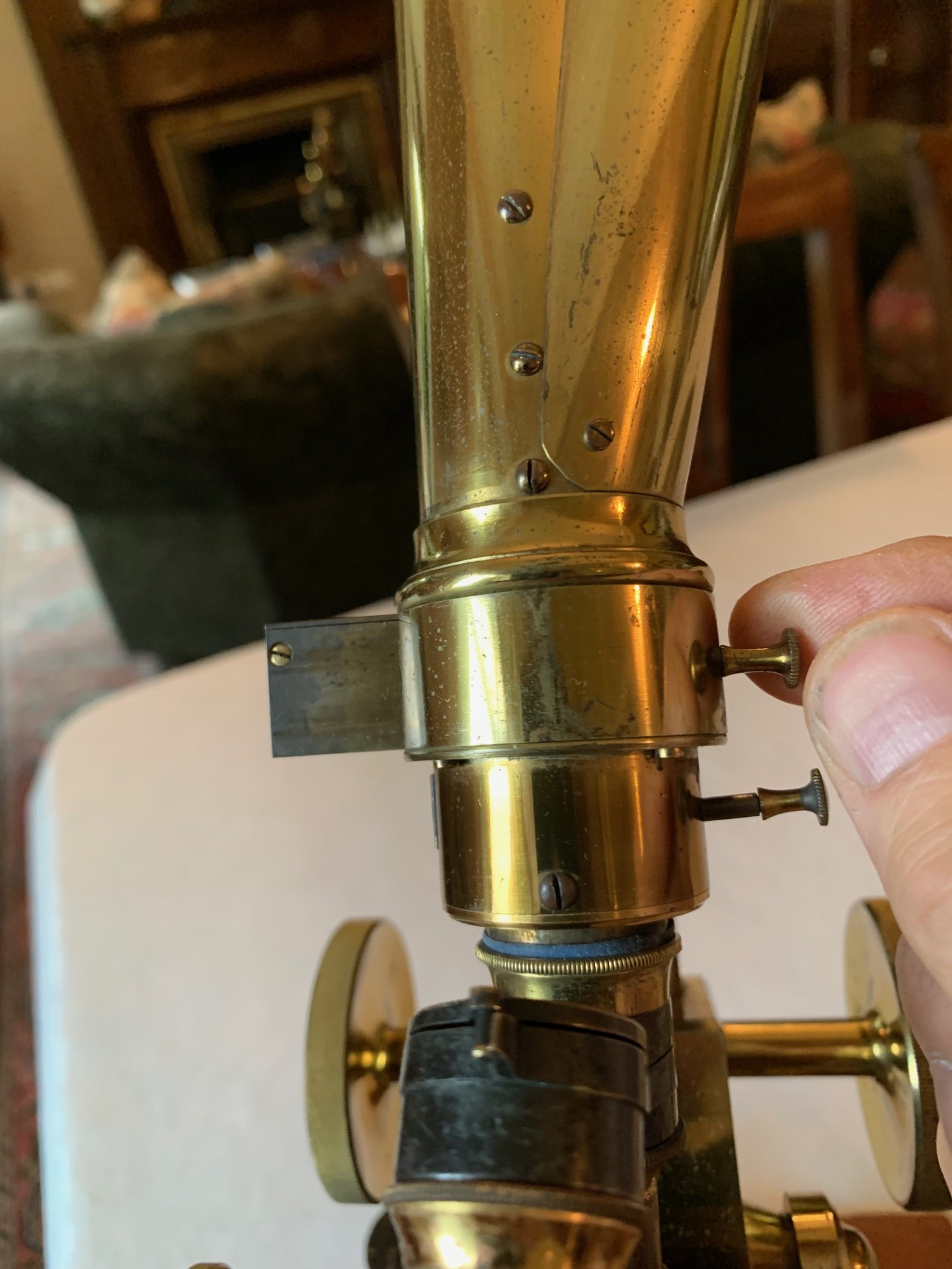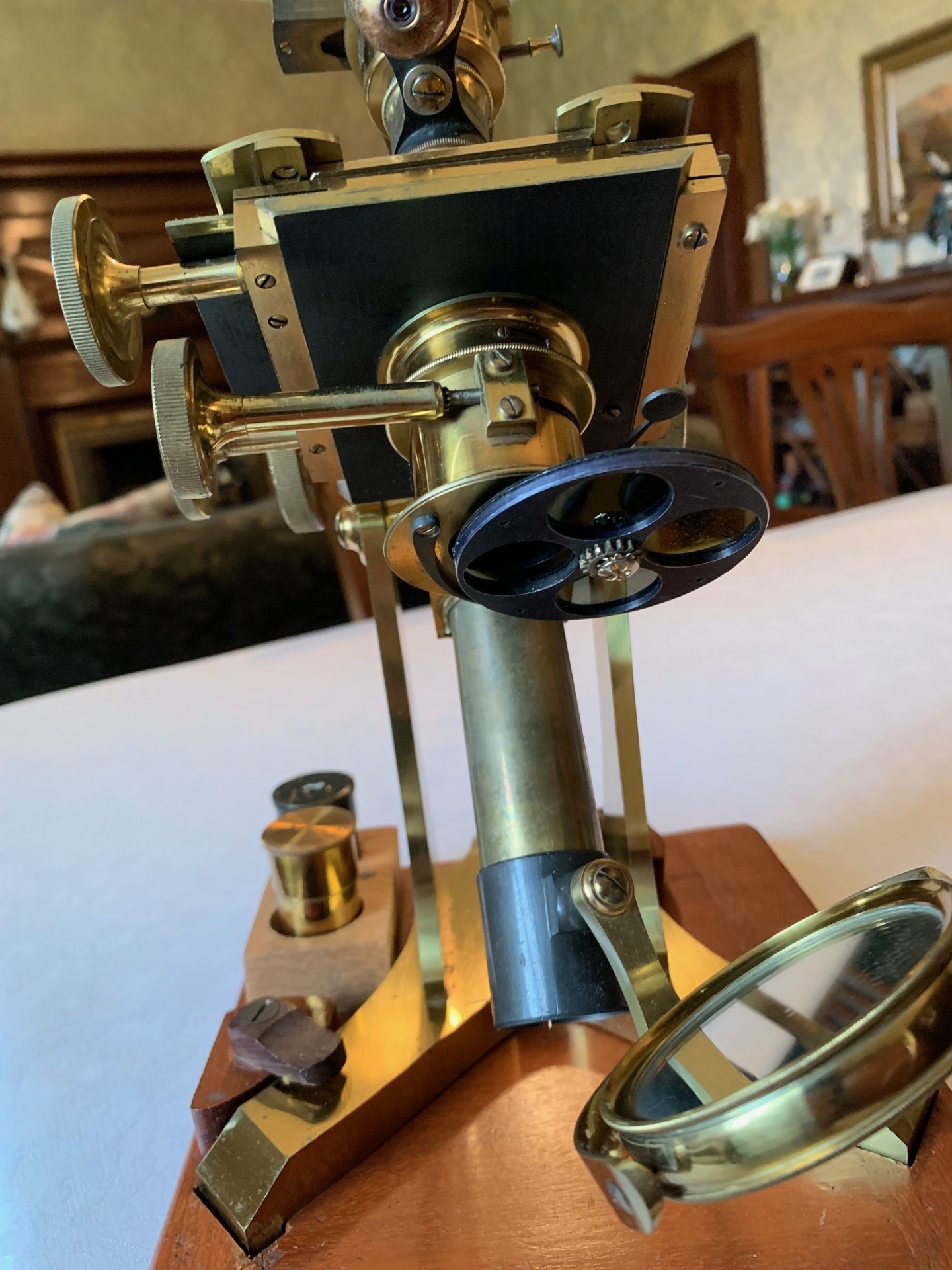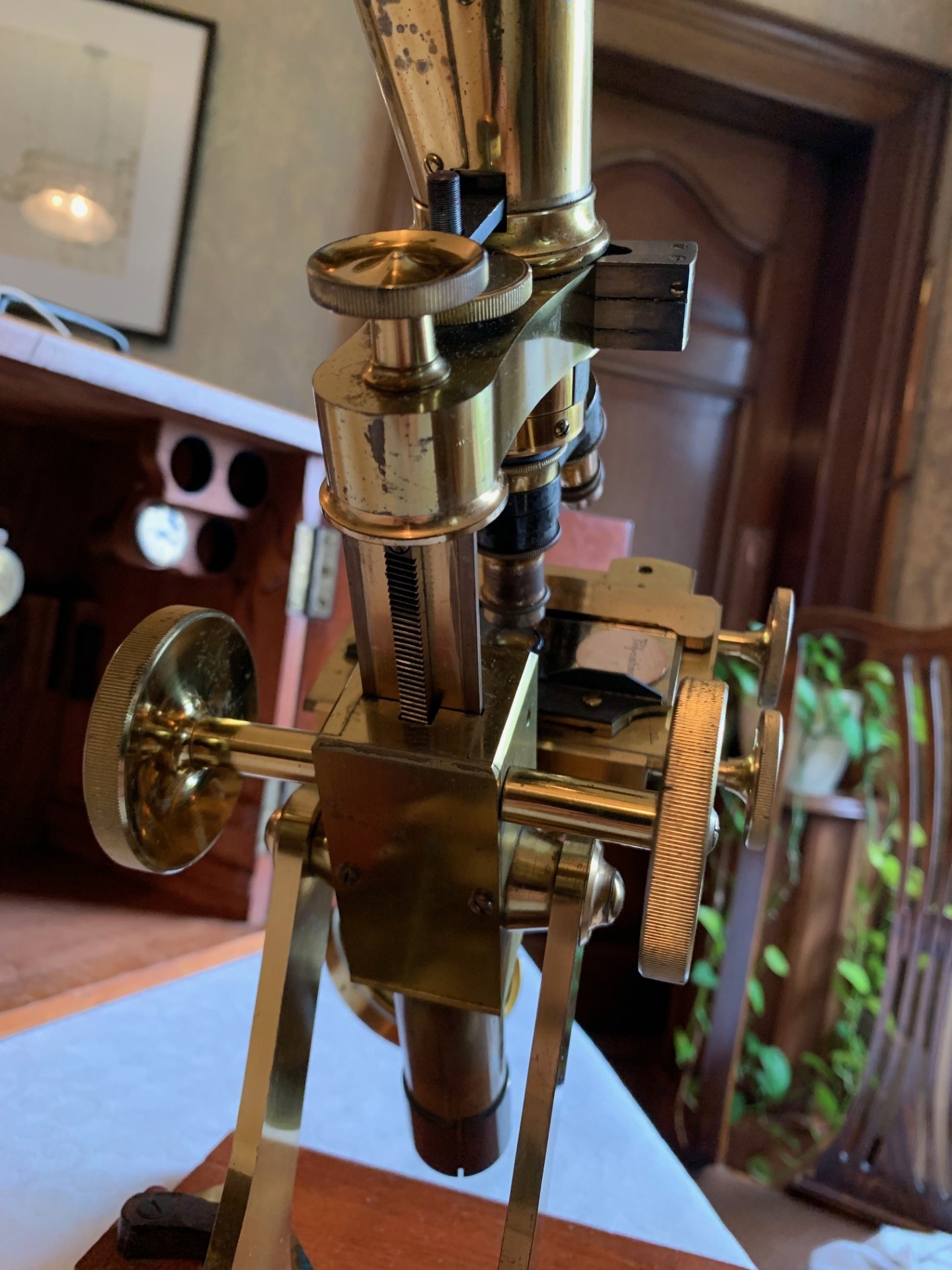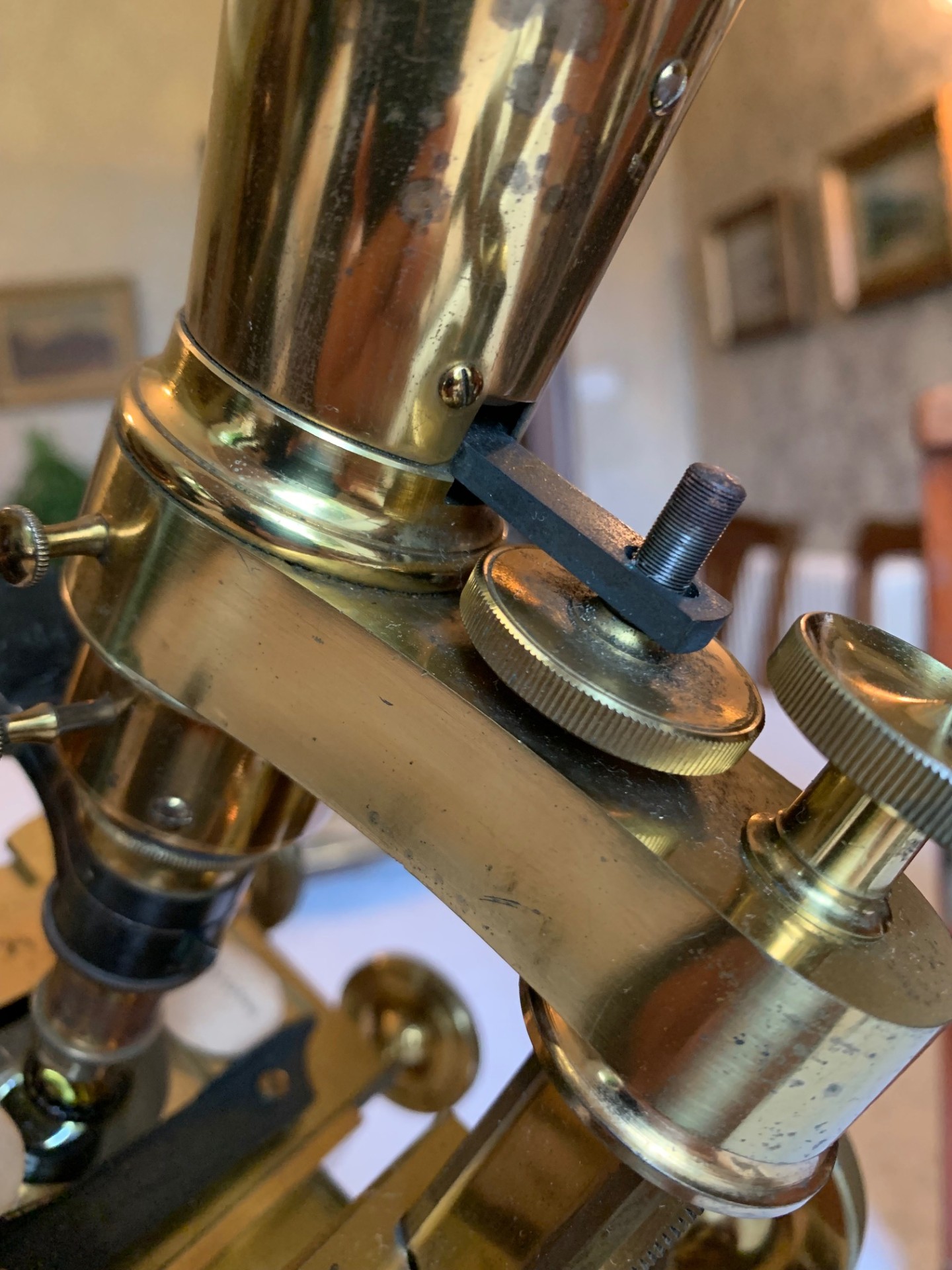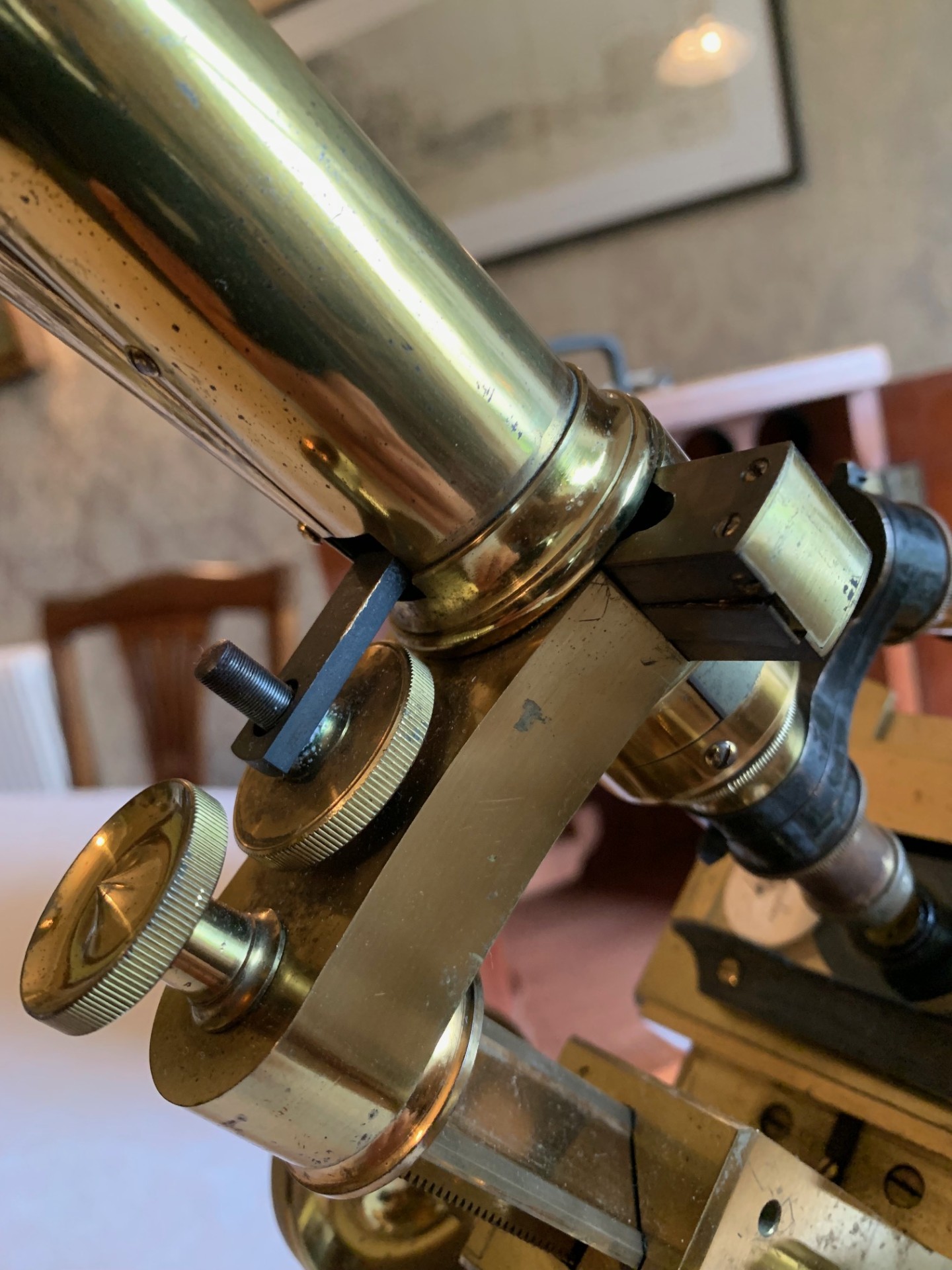 Technical details – the construction is a brass y-shaped foot sitting on a mahogany base-plate, with twin uprights supporting a pivot and a classic triangular section bar-limb arrangement. The coarse focus is by rack and pinion with over-size thumb-wheels and interestingly the newer-style helical/diagonal cut rack that features on instruments from the 1880s onwards – hence my opinion on dating the instrument. The coarse focus has a smooth action and holds in position as it should in its working range. Fine focus is operated via a knurled brass thumb-wheel located at the rear of the main tube on the limb, being a vernier screw acting on the nose-piece only, that also works well.