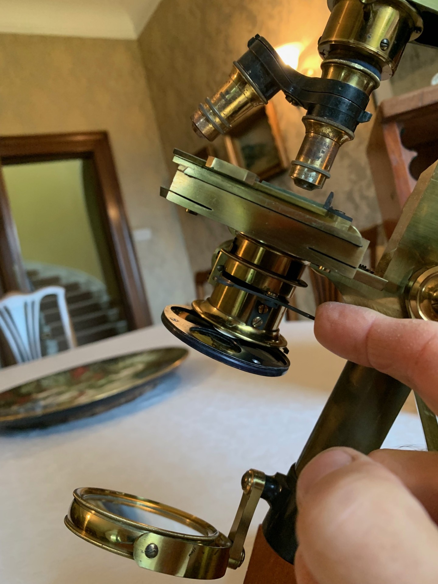 I’ve tested the optics with numerous antique slides of diatom, insect and other similar specimens and the images are perfectly acceptable when using good illumination – in fact this is quite a good Wenham binocular set-up, with nice sharp bright images in both eyepieces when the Wenham prism and illumination mirrors are correctly positioned. It’s also interesting to see that there’s also a nose-piece analyser fitted to the optical tube on and in/out slider located directly above the Wenham prism, this feature hasn’t been tested and would benefit from a careful clean. The magnification available with the instrument with its current set of optics will be around 80x to 320x.
