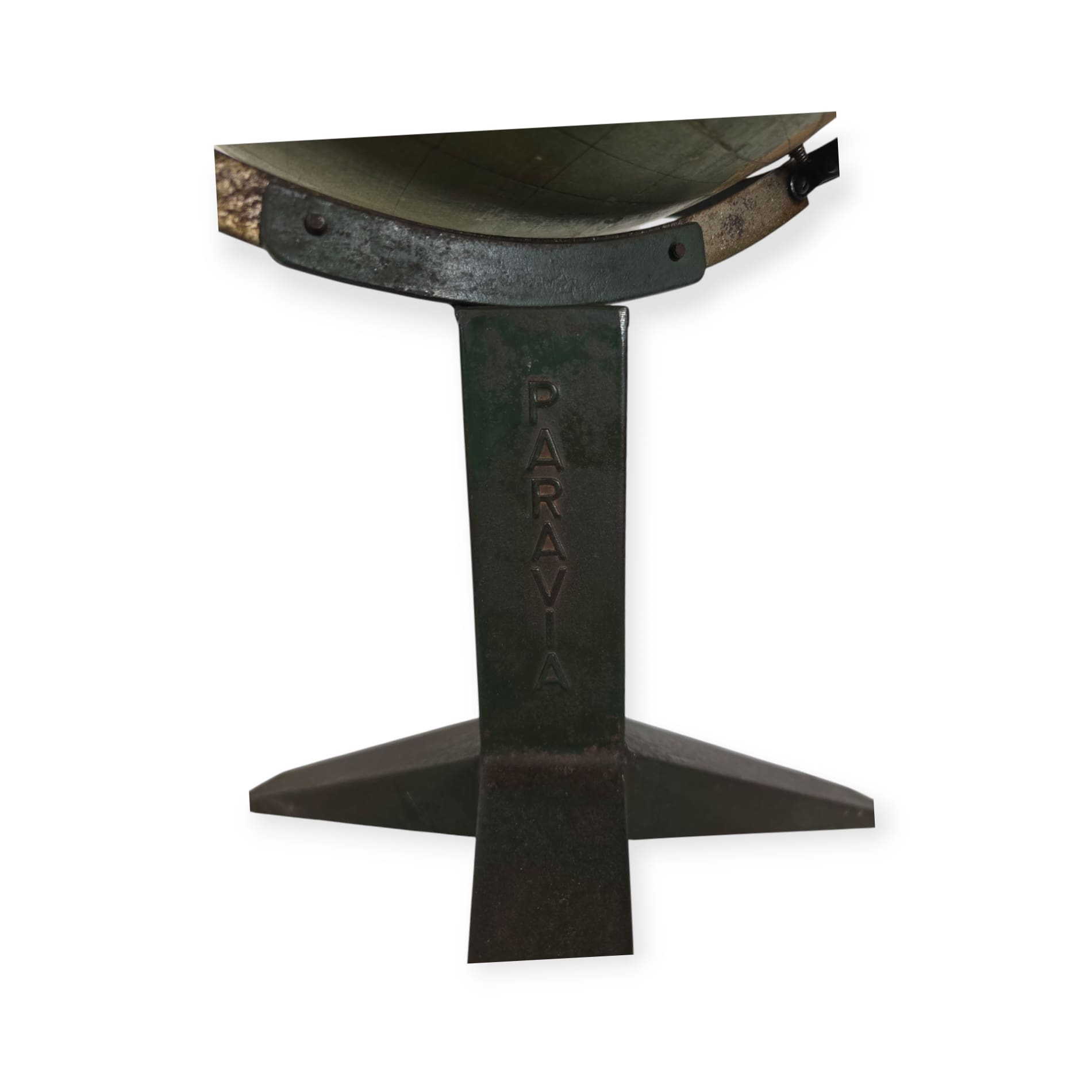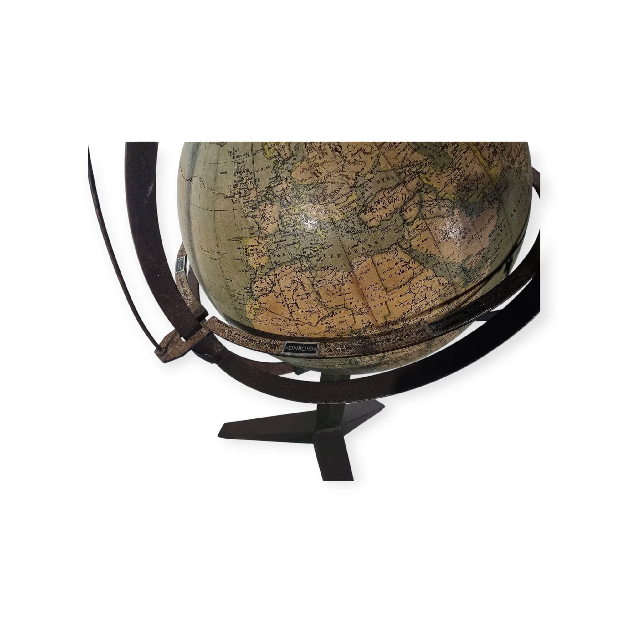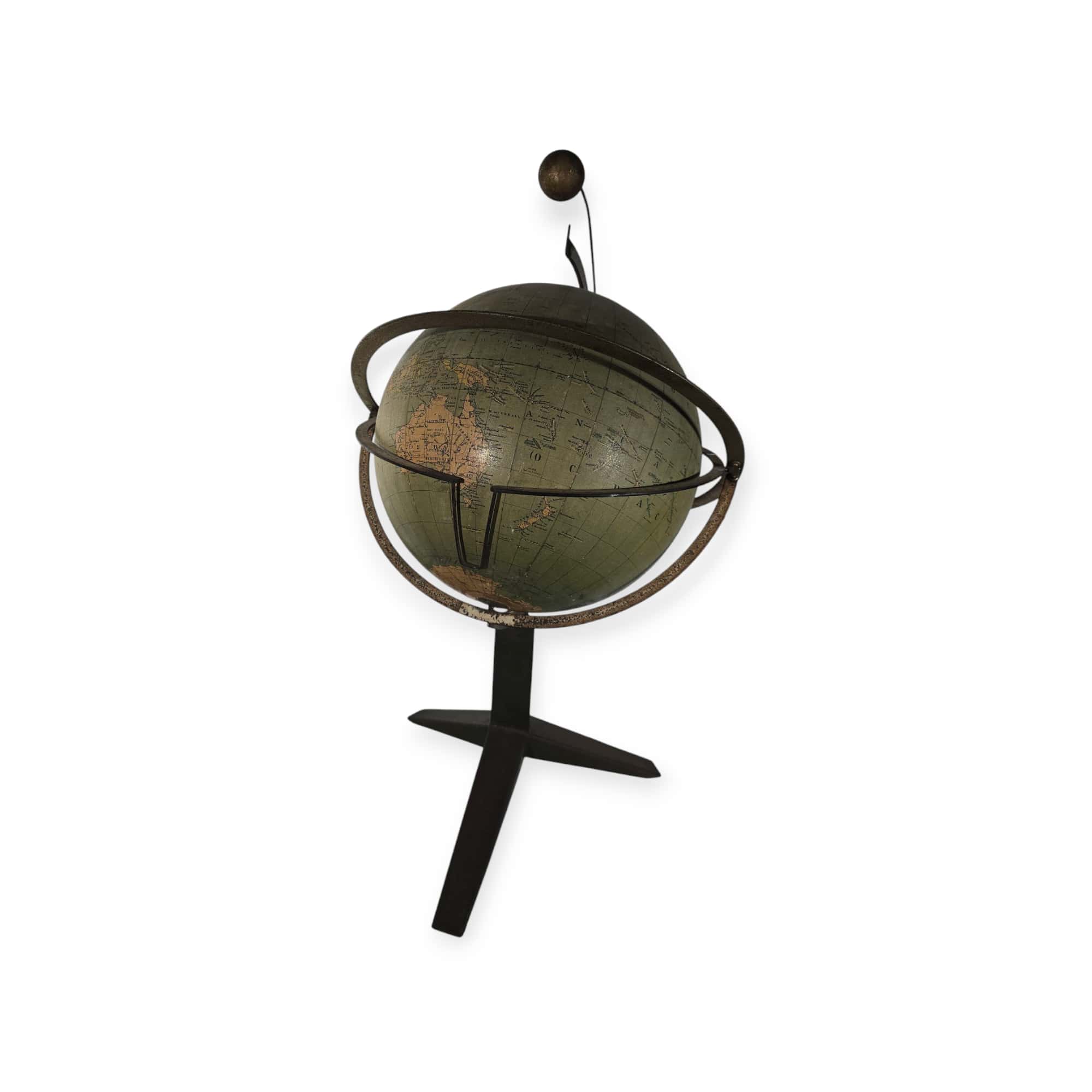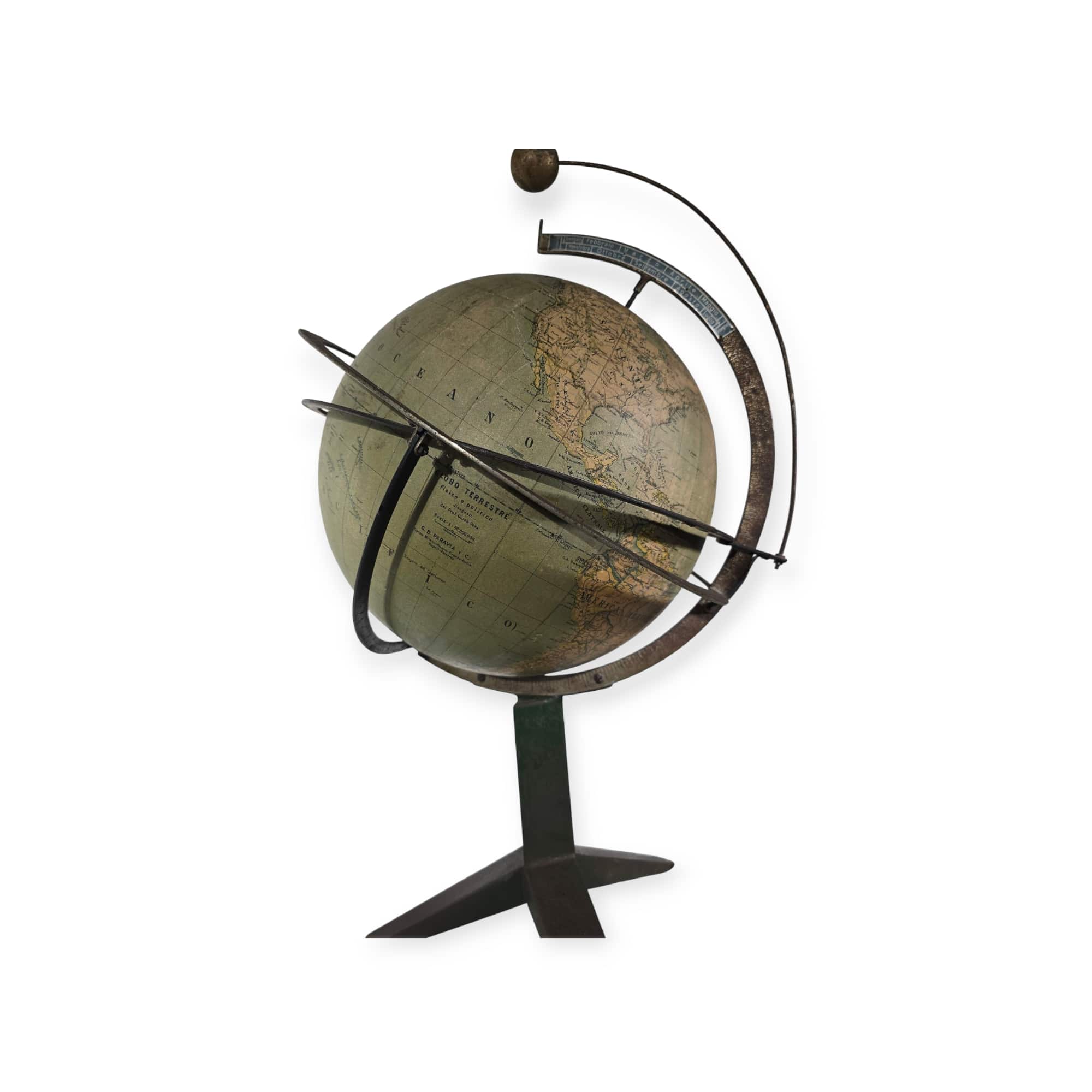 Rare and collectible orrery (tellurium) produced by the renowned Italian maker Paravia, Turin in 1900. This finely crafted planetary model illustrates the Earth-Sun-Moon system, demonstrating their relative motions and orbital mechanics. The mechanism is made of metal components, with a hand-painted globe mounted on a solid base. This type of teaching instrument was commonly used in schools and observatories to teach astronomy and celestial mechanics in the early 20th century. Dimensions: 70 cm (height) x 37 cm (diameter) Condition: Excellent, with original components and well-preserved mechanical elements.