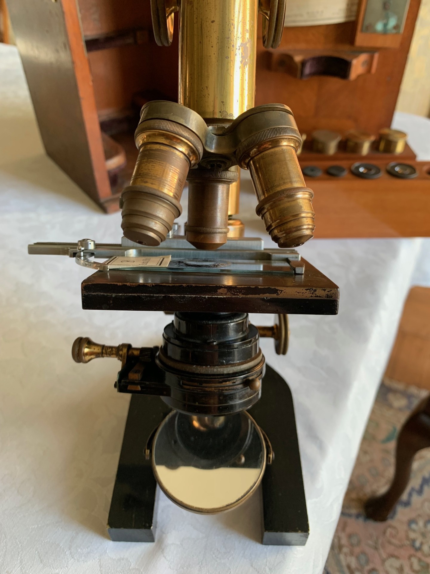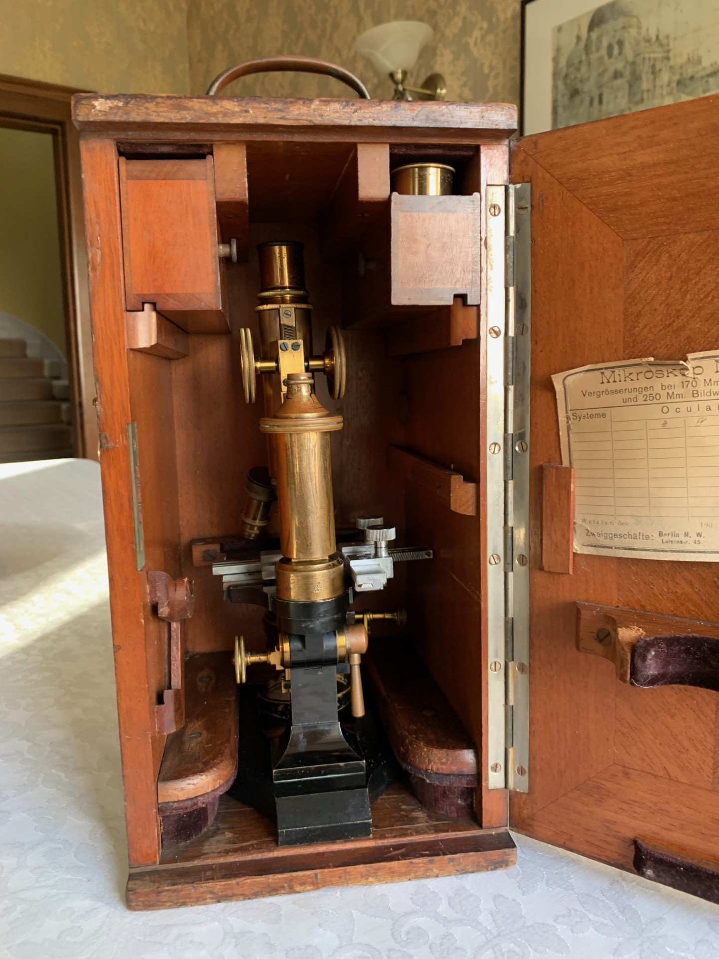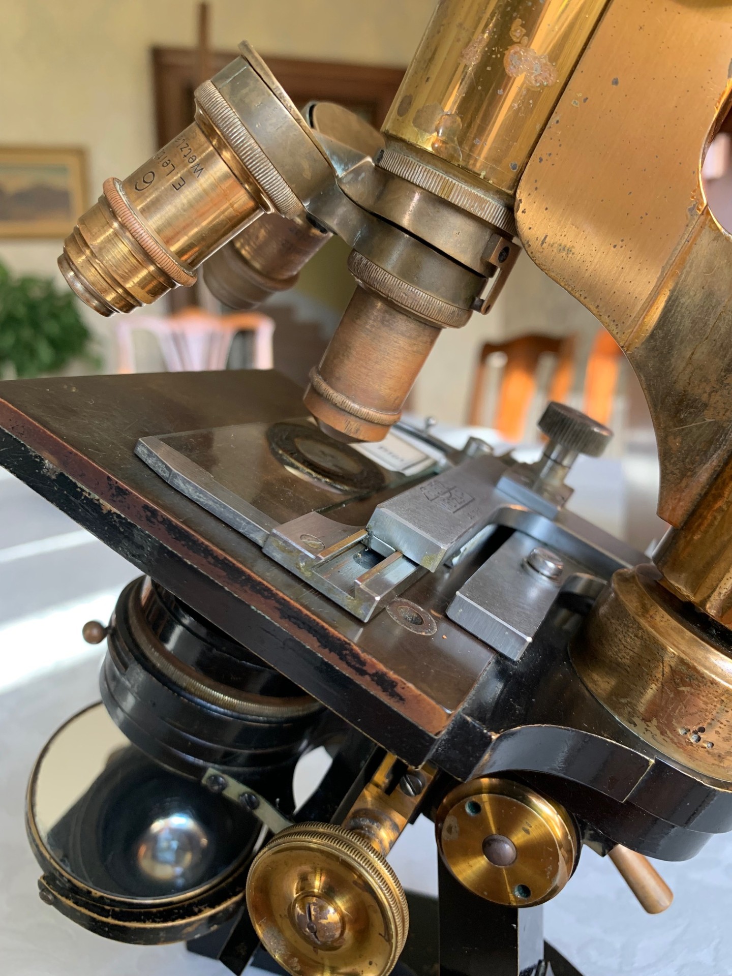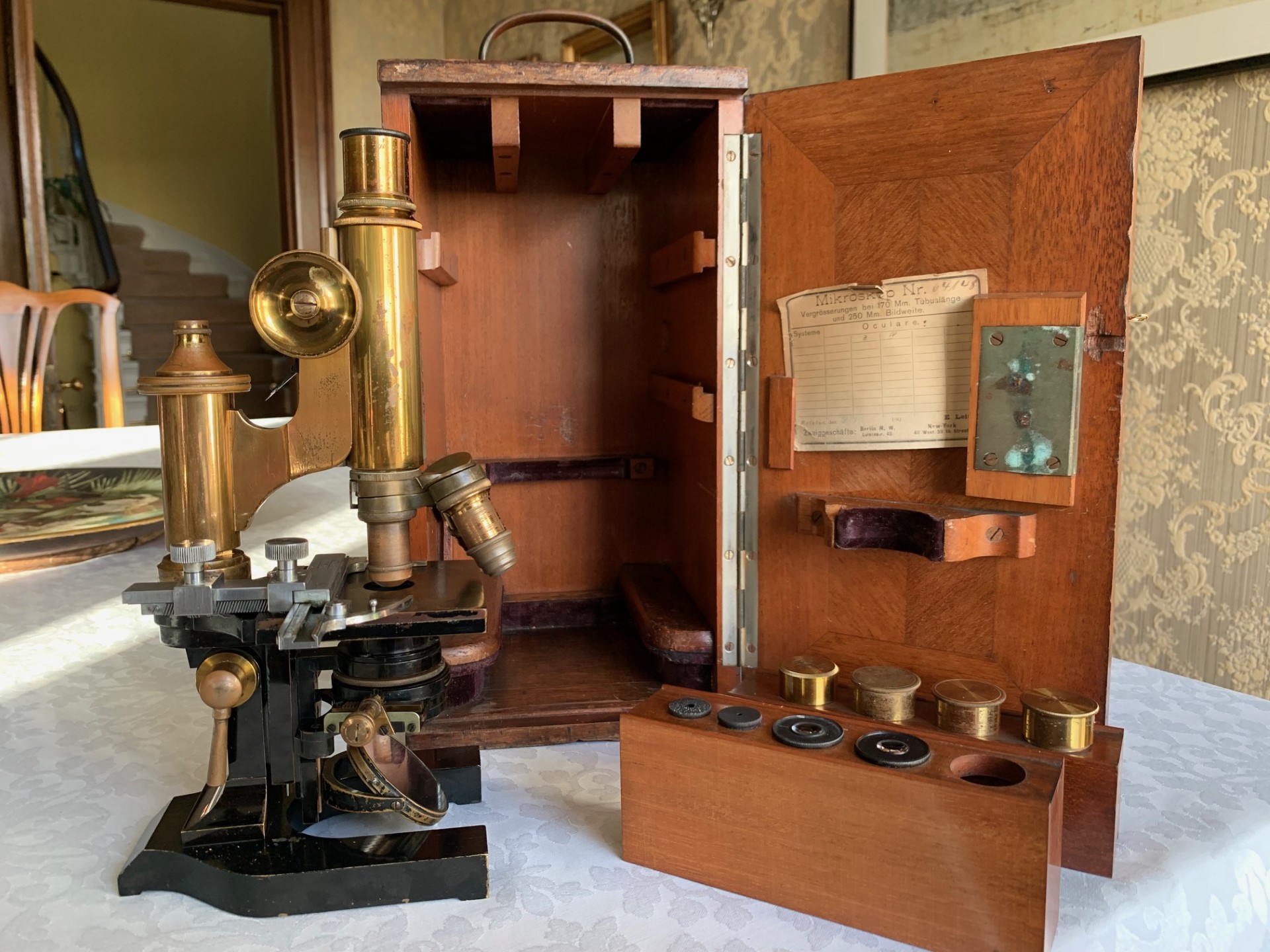 Generally good working and acceptable cosmetic condition example of a "matching numbers" continental pattern brass microscope by Ernst Leitz of Wetzlar, Germany dating to 1901.