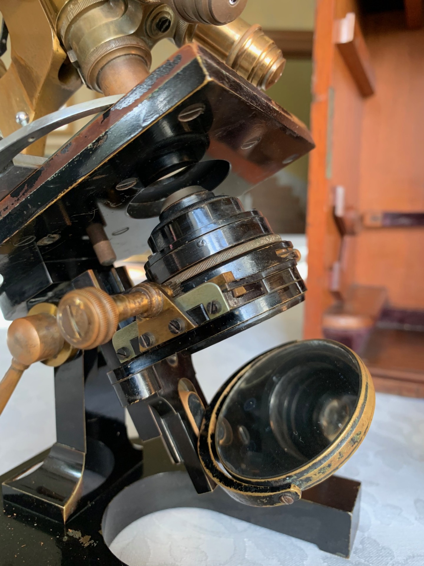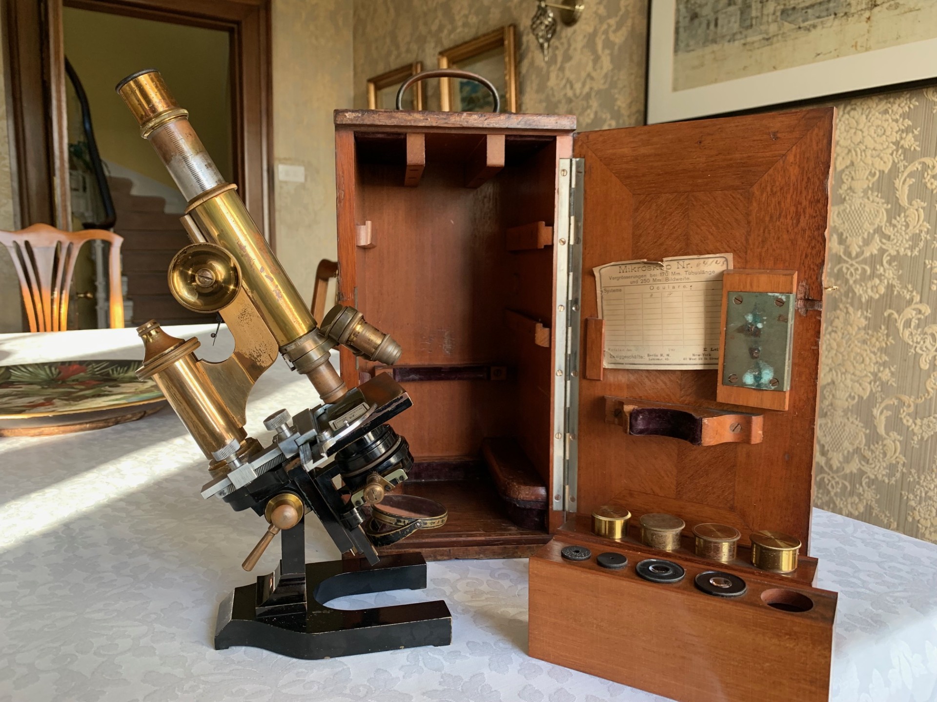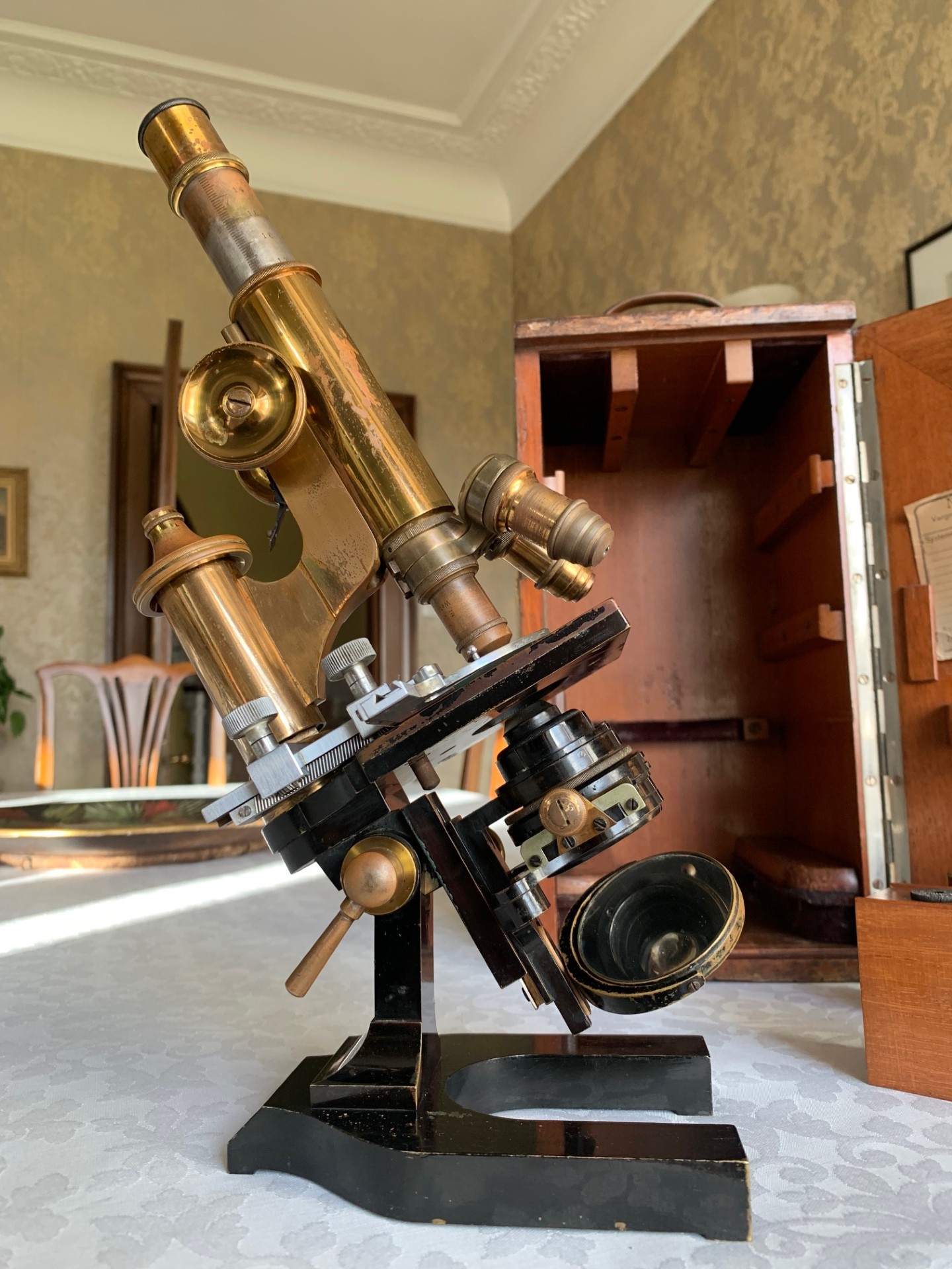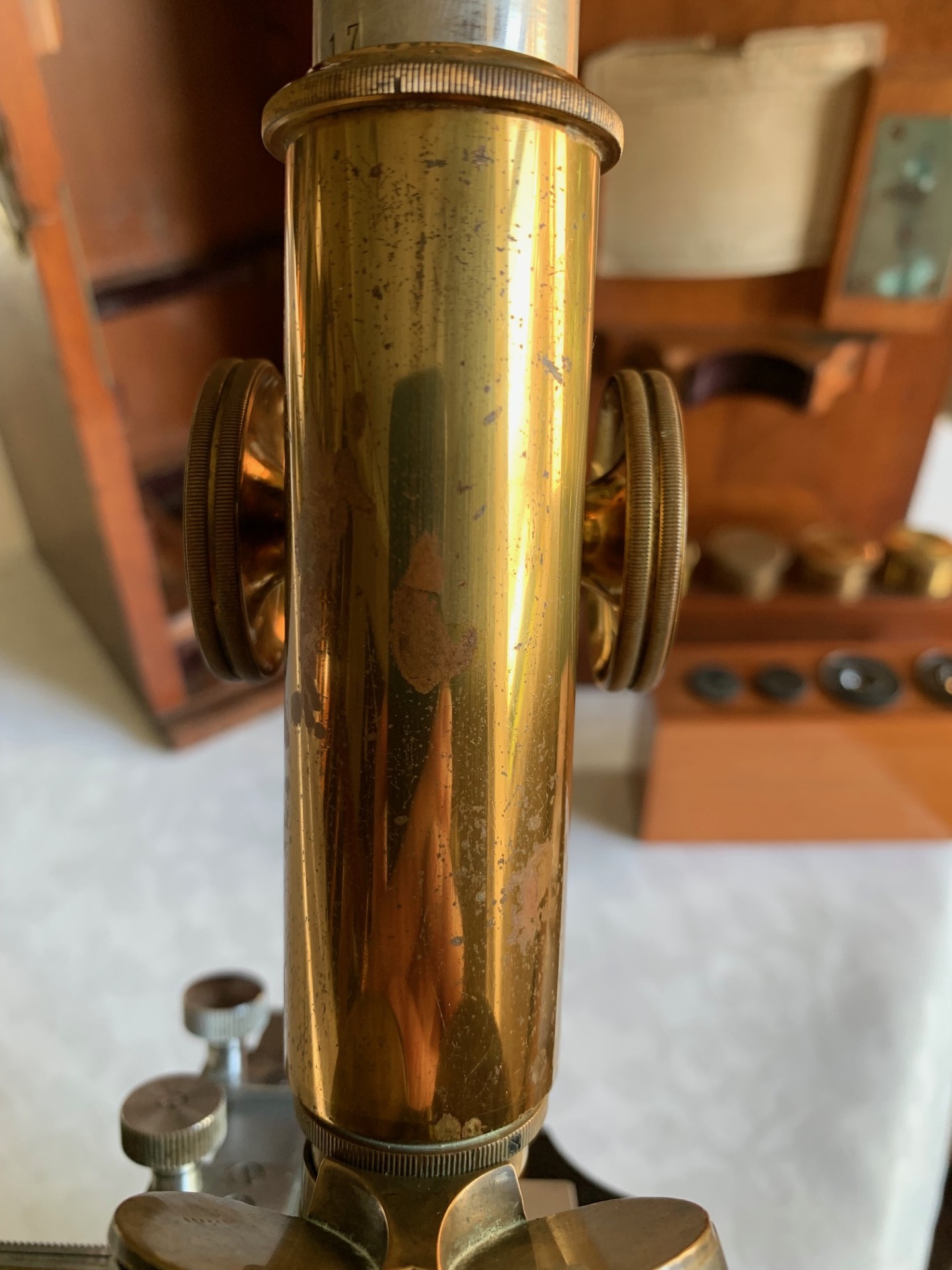 Generally good working and acceptable cosmetic condition example of a "matching numbers" continental pattern brass microscope by Ernst Leitz of Wetzlar, Germany dating to 1901.
