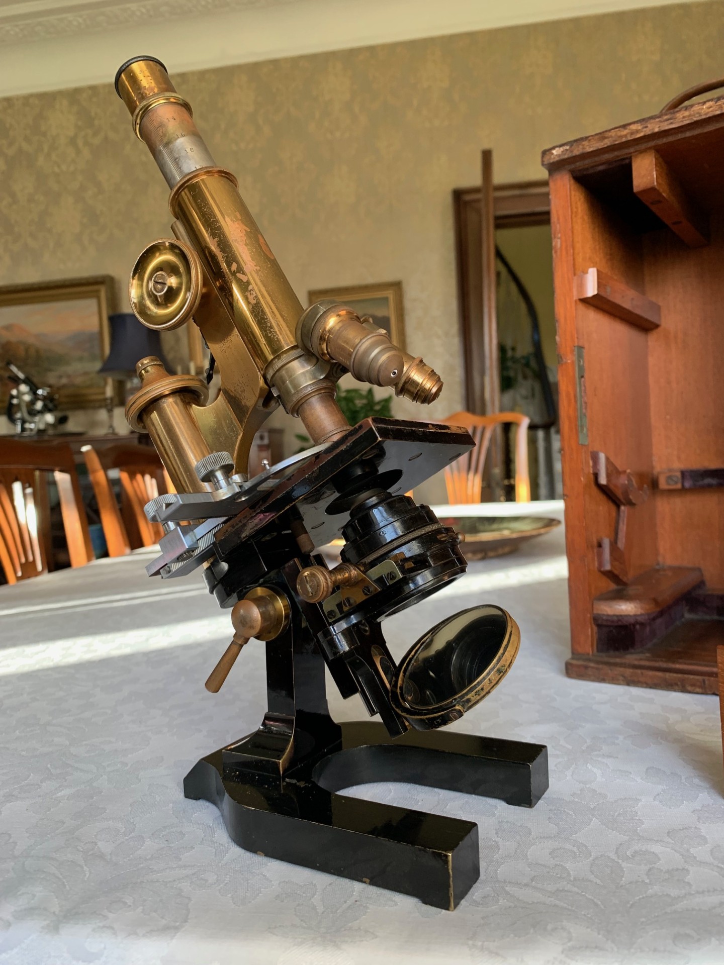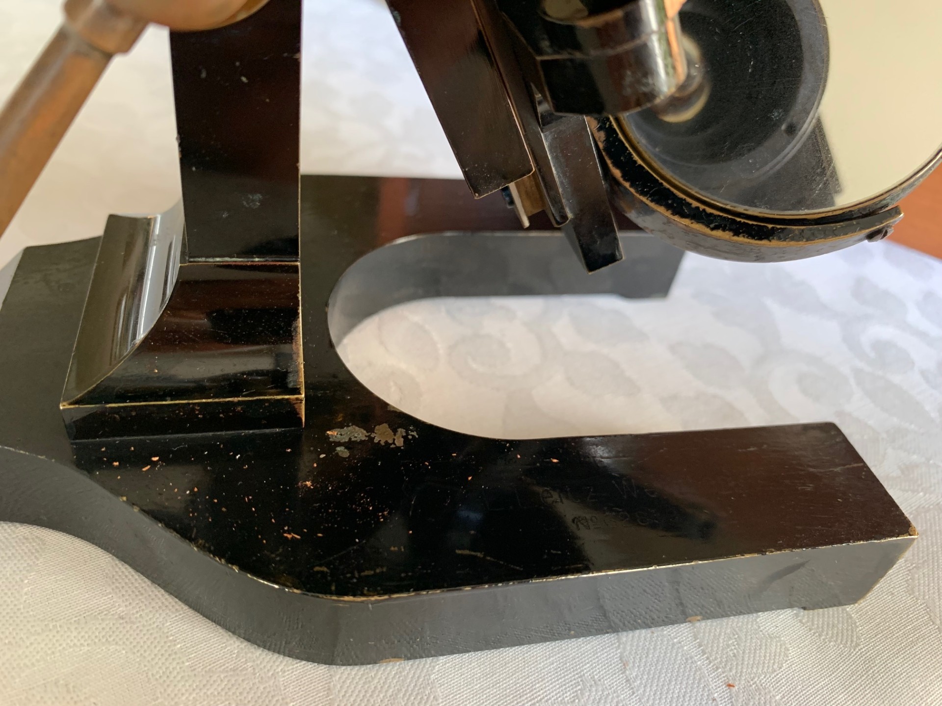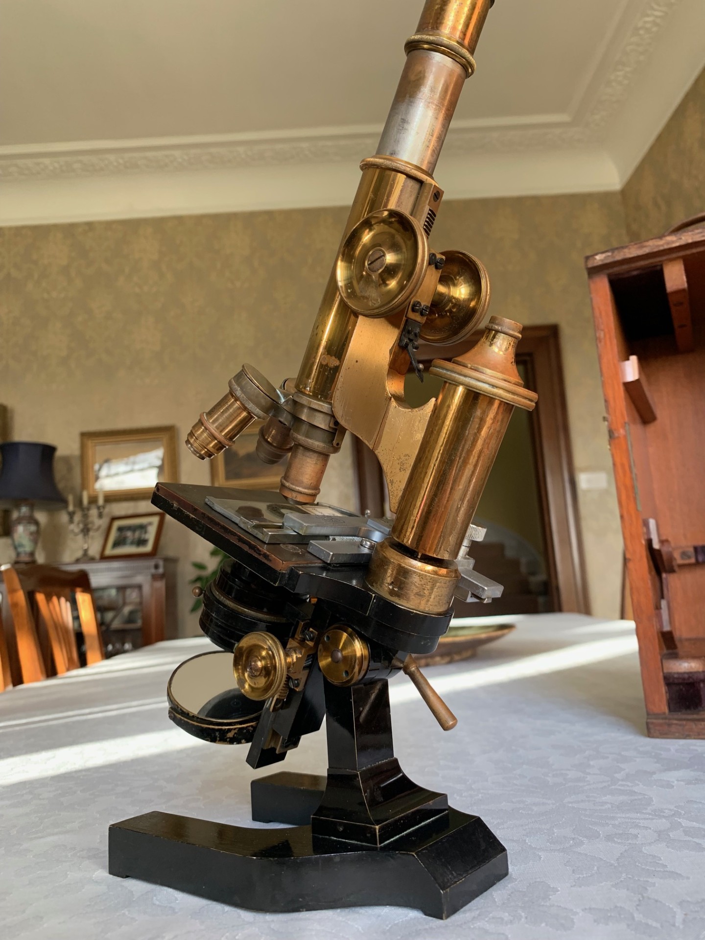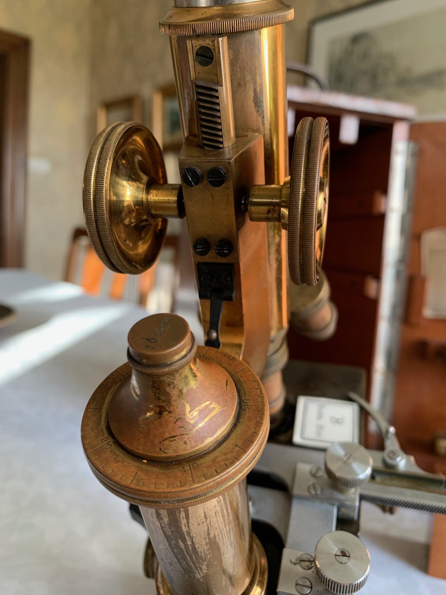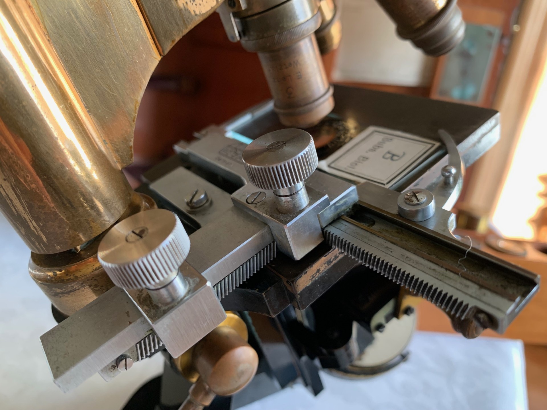 Generally good working and acceptable cosmetic condition example of a "matching numbers" continental pattern brass microscope by Ernst Leitz of Wetzlar, Germany dating to 1901.