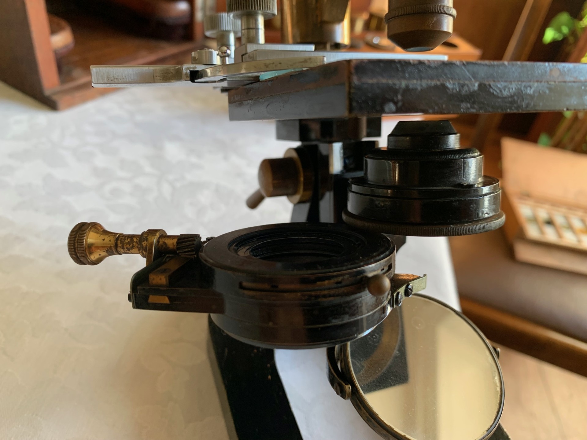 6) Below stage there’s an Abbe-type condenser by Leitz, with smoothly operating iris and centering via a horizontal rack & pinion system, which also swings out as demonstrated in the listing photos. Filters can also be added to a recess directly above the iris, as may be required. The condenser/mirror assembly sits in a mount with vertical height adjustment via a rack & pinion system with single-sided thumb-wheel control.