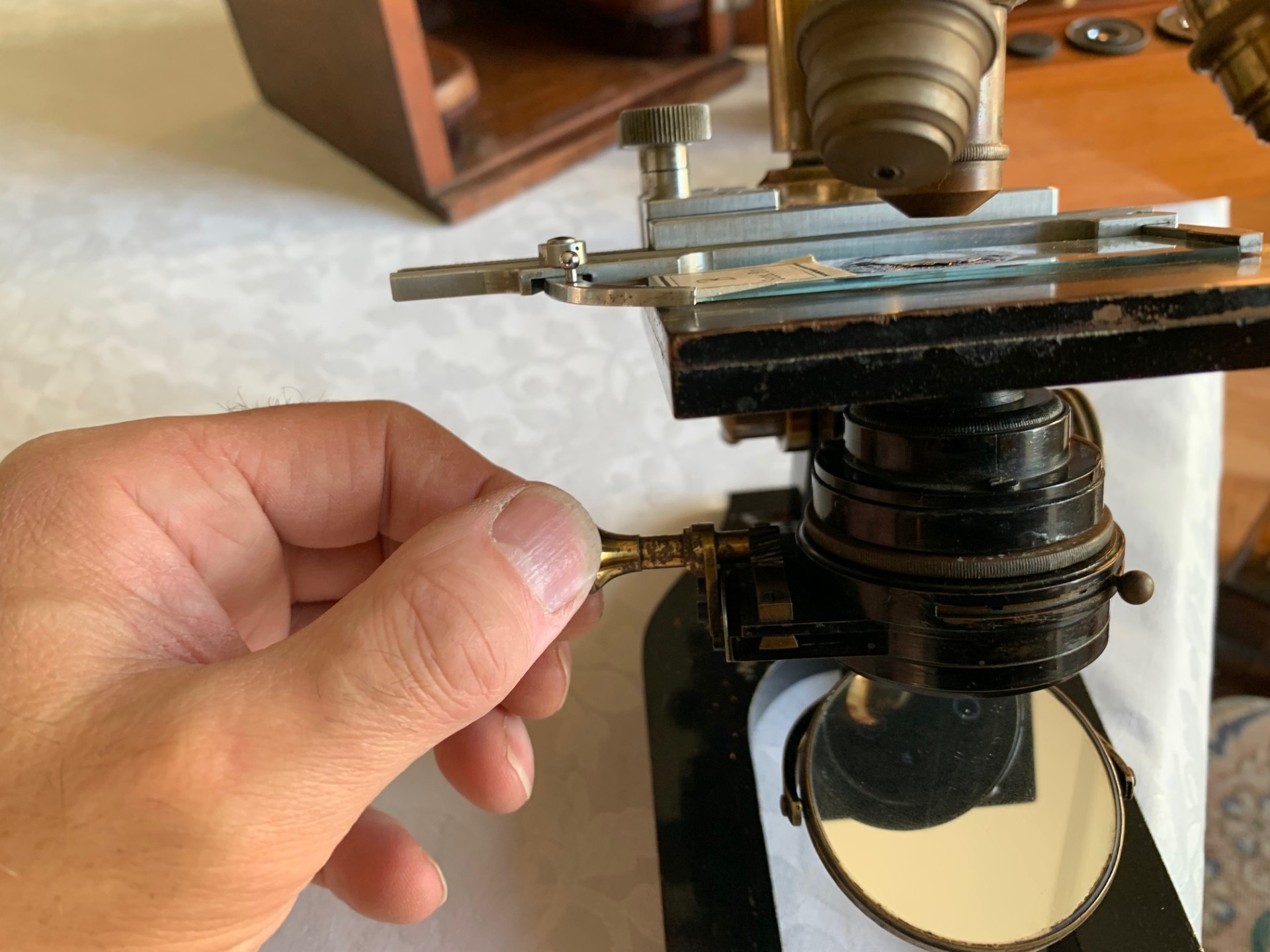 5) The stage is of a square design in brass with an ebonite top layer. It’s currently fitted with a later Leitz mechanical over-stage with above-stage x/y controls, which works very well. The over-stage attaches via a single screw and there are two locating pins to ensure correct alignment. The over-stage has one fixed and one sprung slide retention arm.